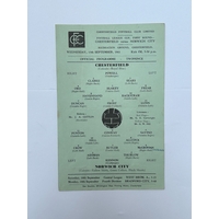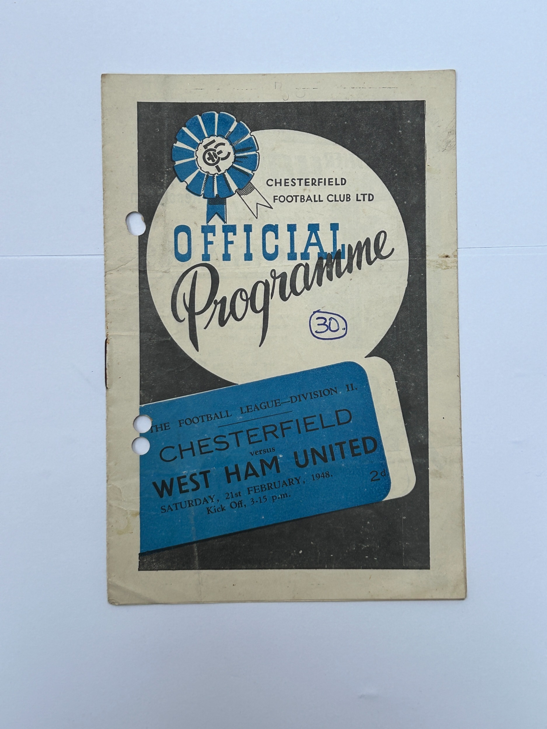 WEST HAM UNITED AT CHESTERFIELD 1947/48 FOOTBALL PROGRAMME, SCARCE POSTPONED ISSUE, DATED 21/2/1948. HOLE PUNCHES NOTED, MARKING THROUGHOUT, PEN WRITING TO COVER.