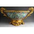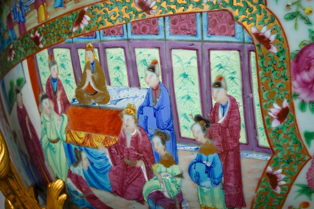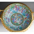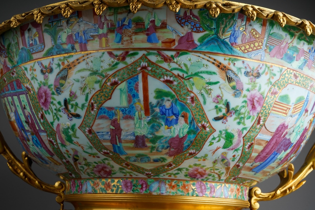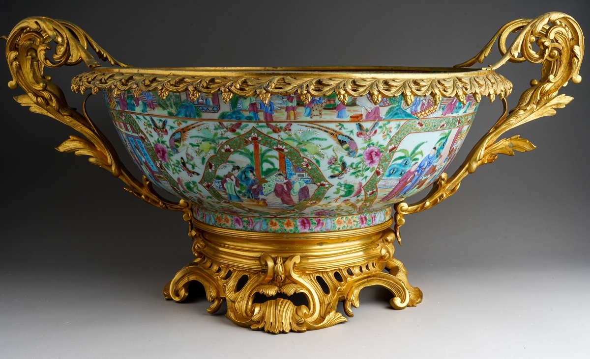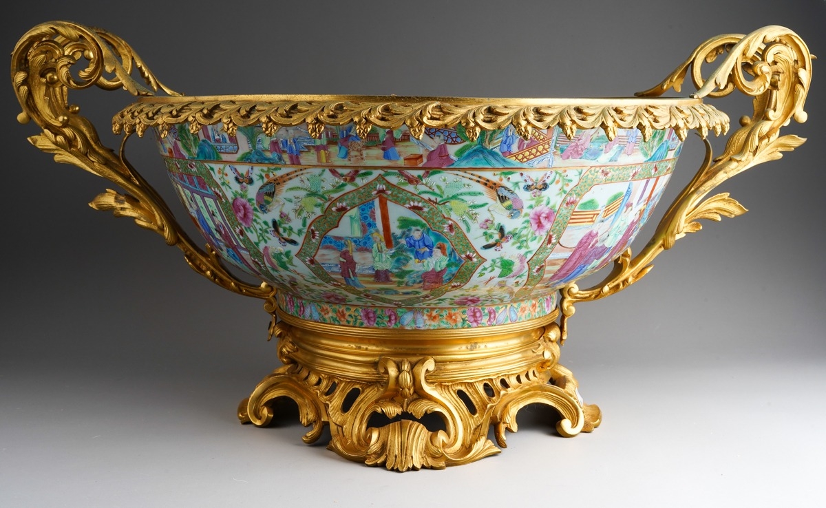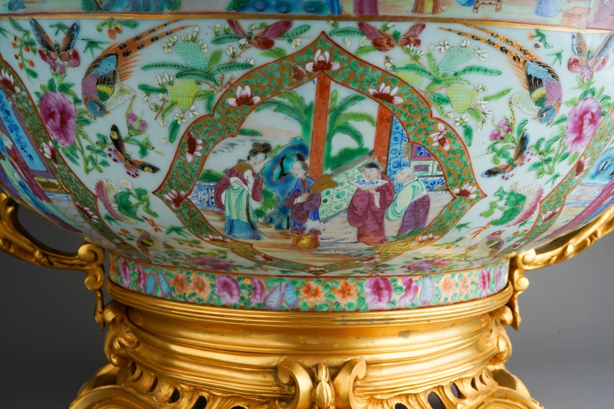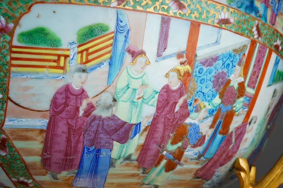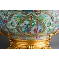 A 19th century Chinese Canton porcelain famille rose and ormolu mounted punch bowl, the porcelain enamelled in the traditional manner with borders of flora and fauna with panels of figures to the exterior, the interior with a continuous band of figures, base unmarked, ornately cast pierced foliate scrolled rim, handles and base with four feet, diameter of bowl interior 44cm x width handle to handle 66.5cm x height to top of handle 34cm, height of bowl 18cm approx.