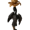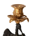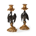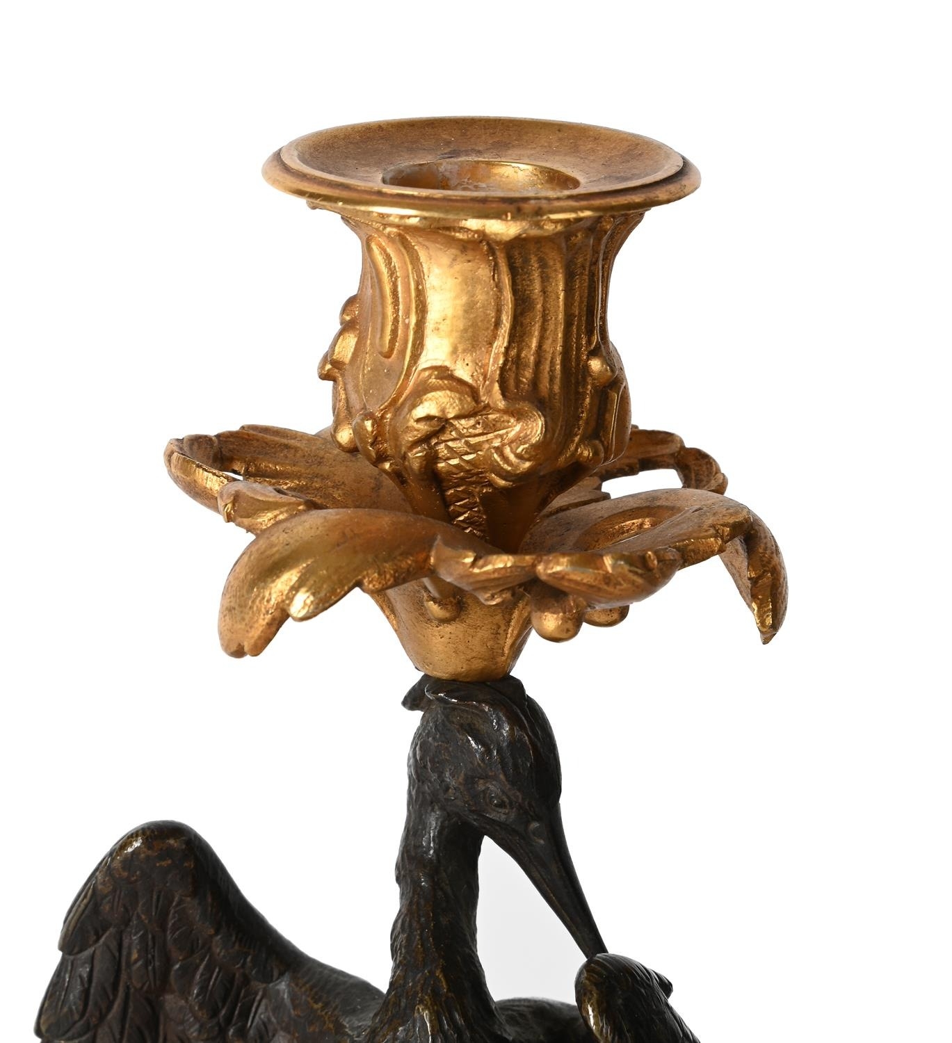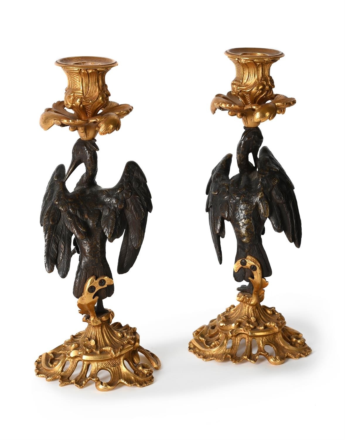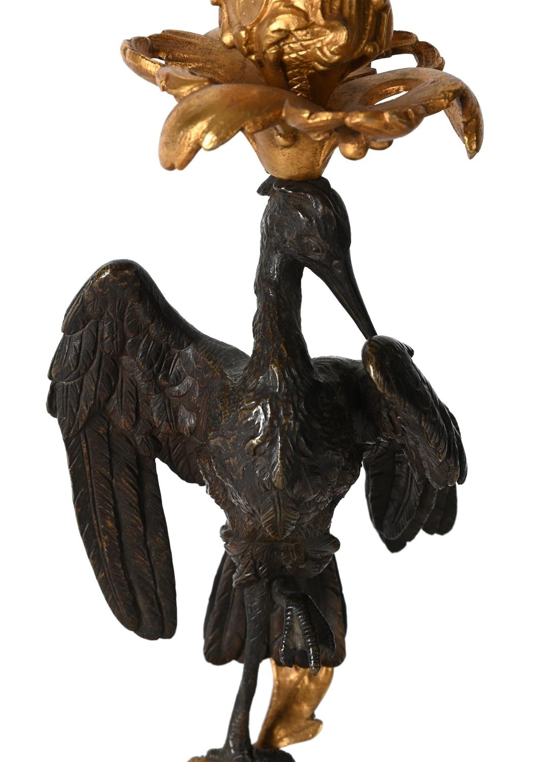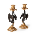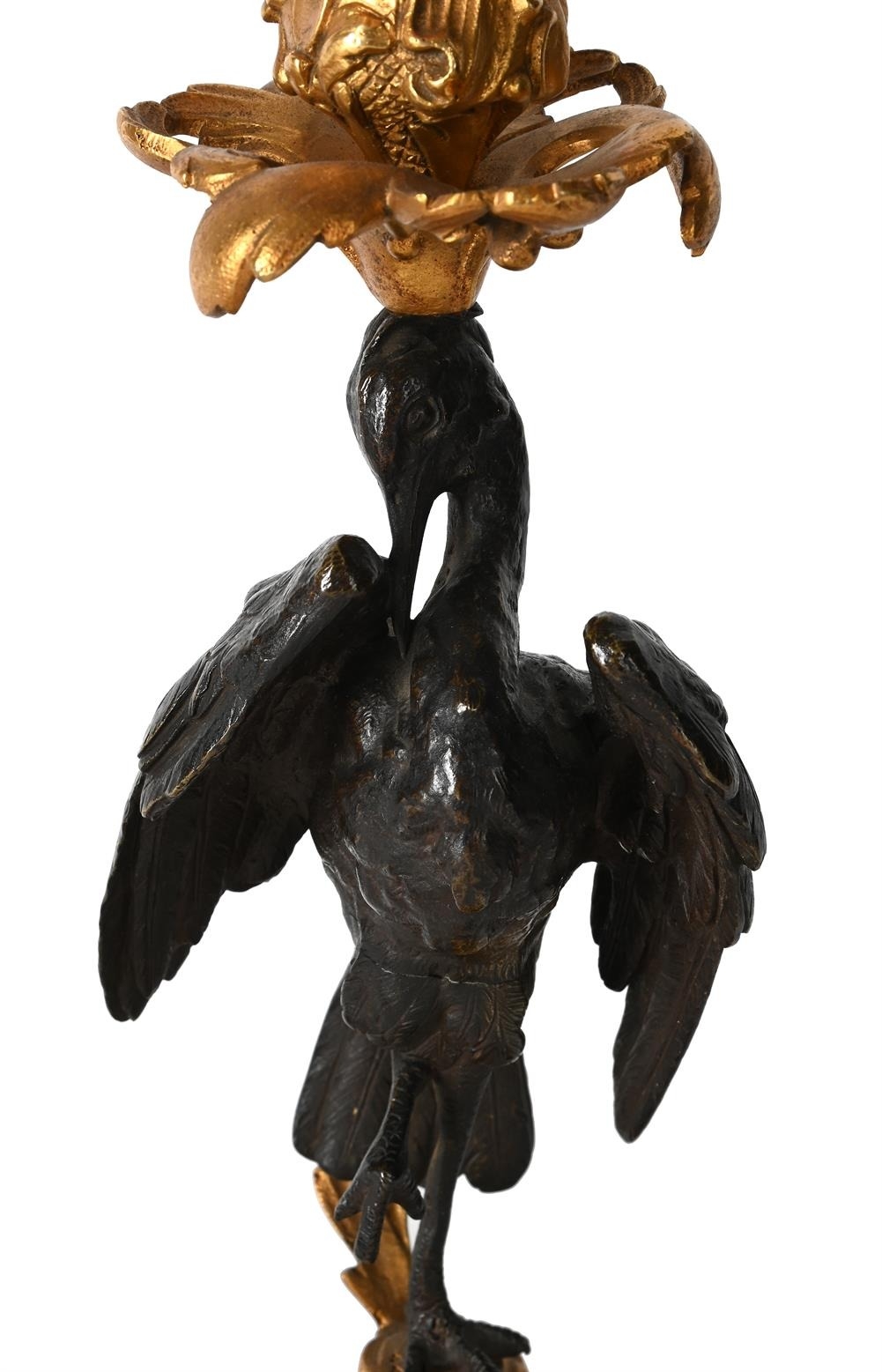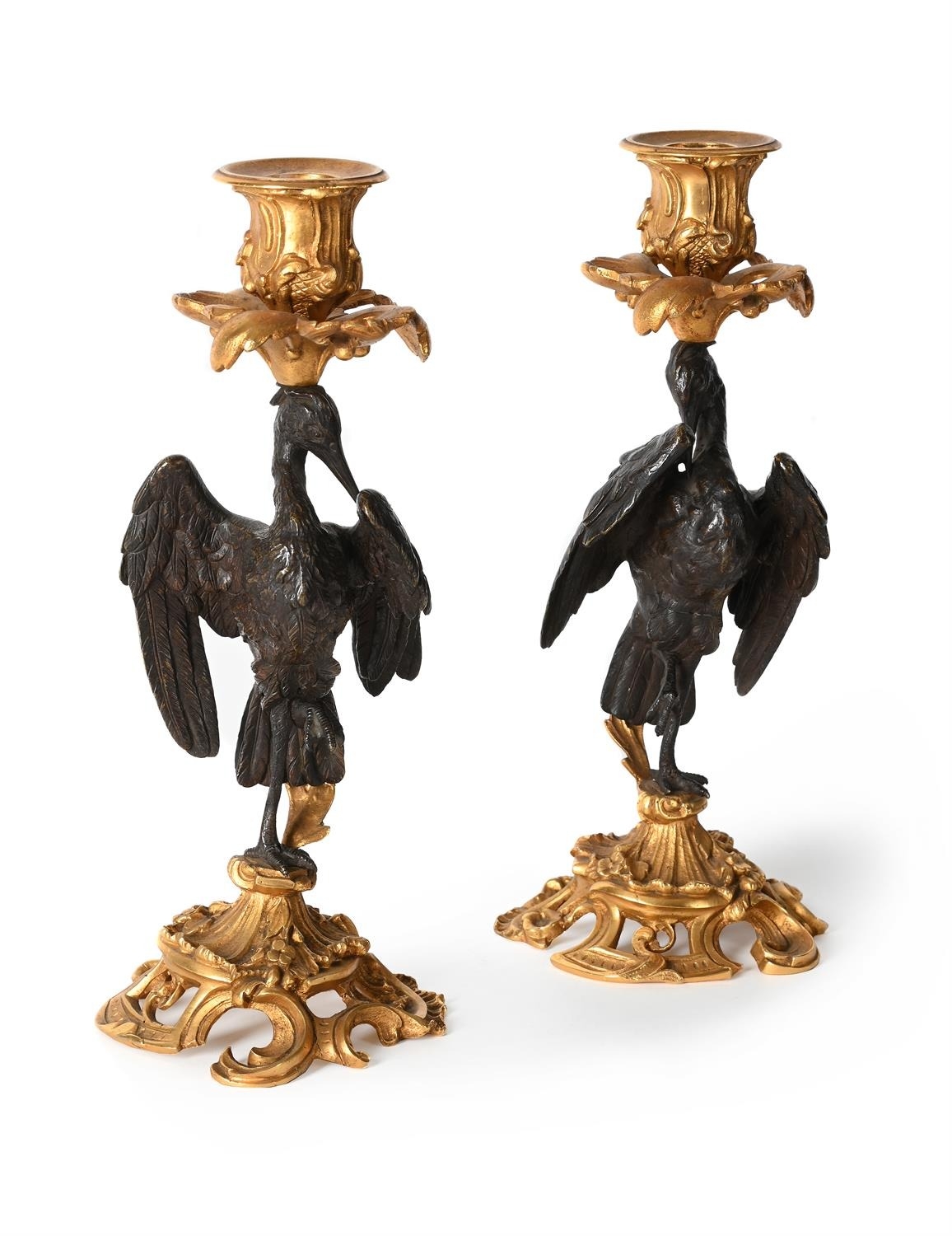 A PAIR OF FRENCH BRONZE AND ORMOLU ANIMALIER CANDLESTICKS LATE 19TH CENTURY Stems in the form of storks, rococo scroll bases, modelled opposing 26cm high