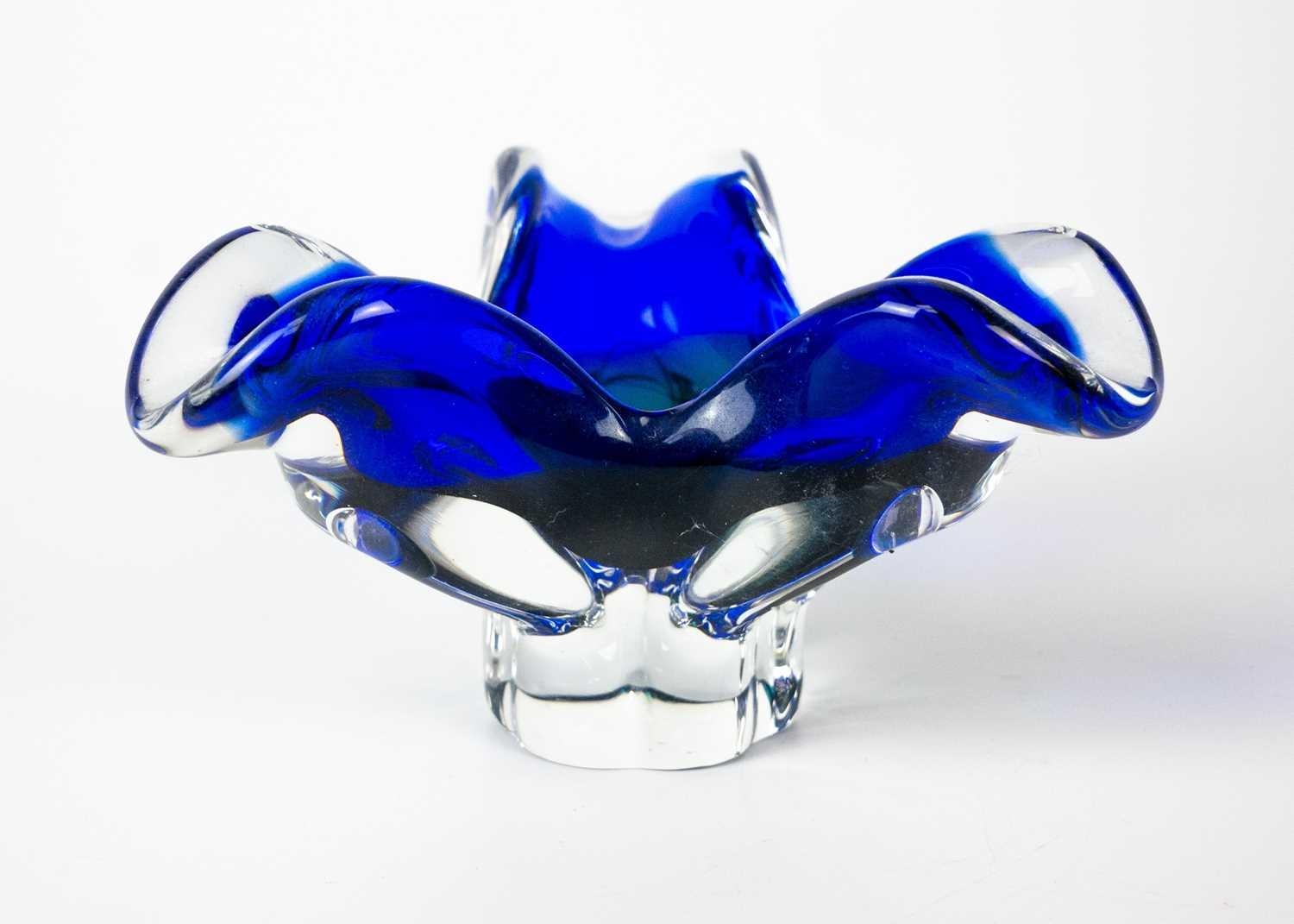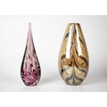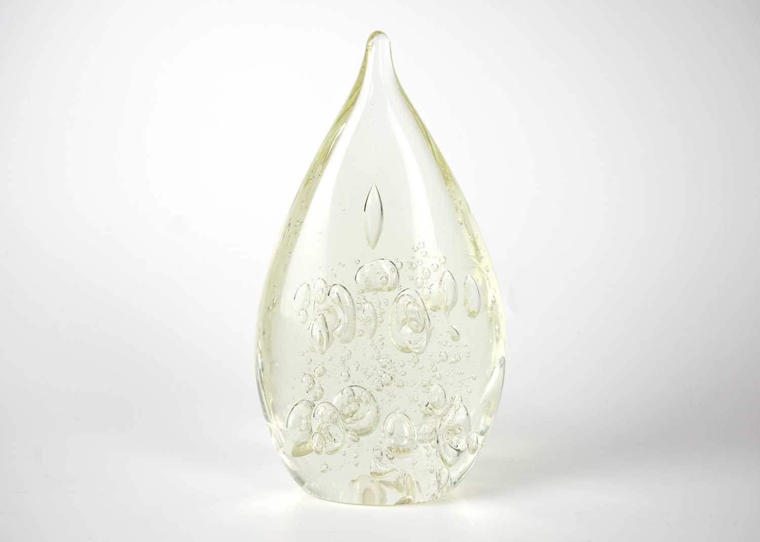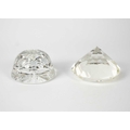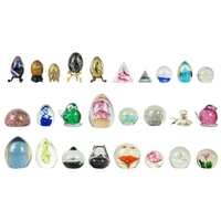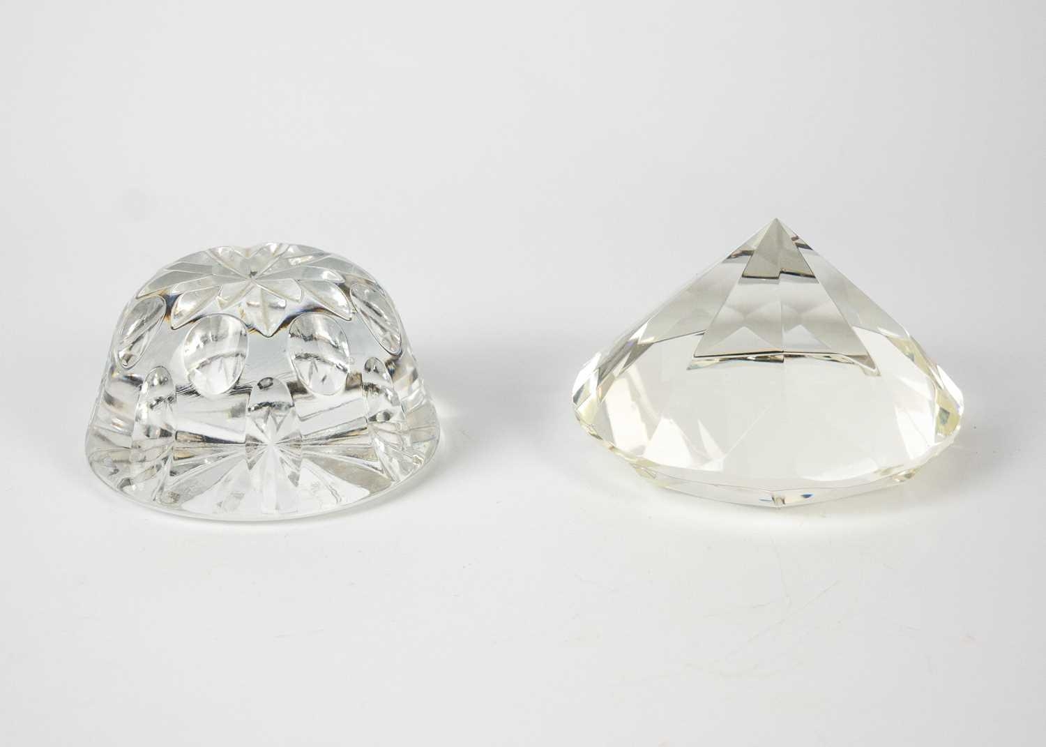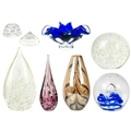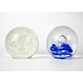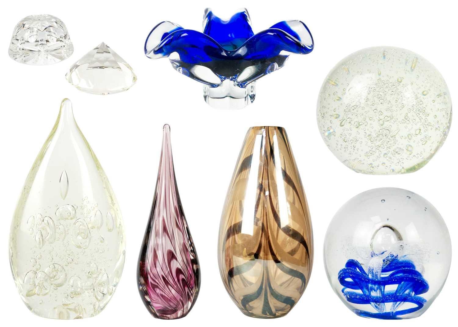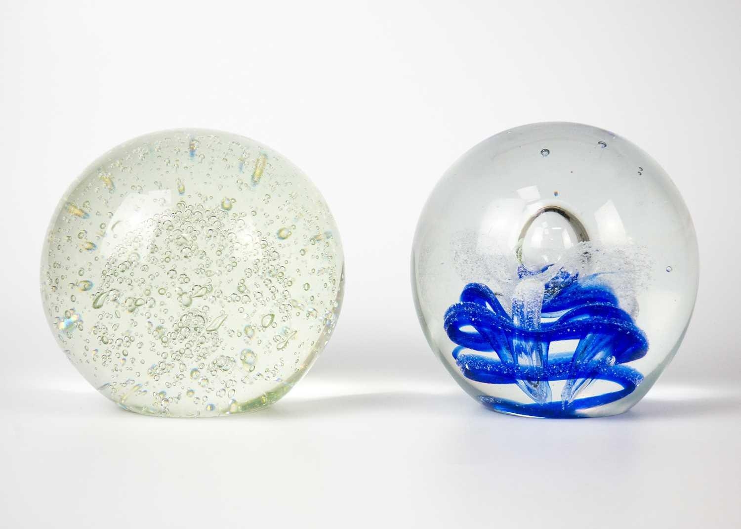 Two large glass paper weights. Diameter 14cm, together with glass vase and other glass items.