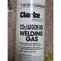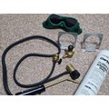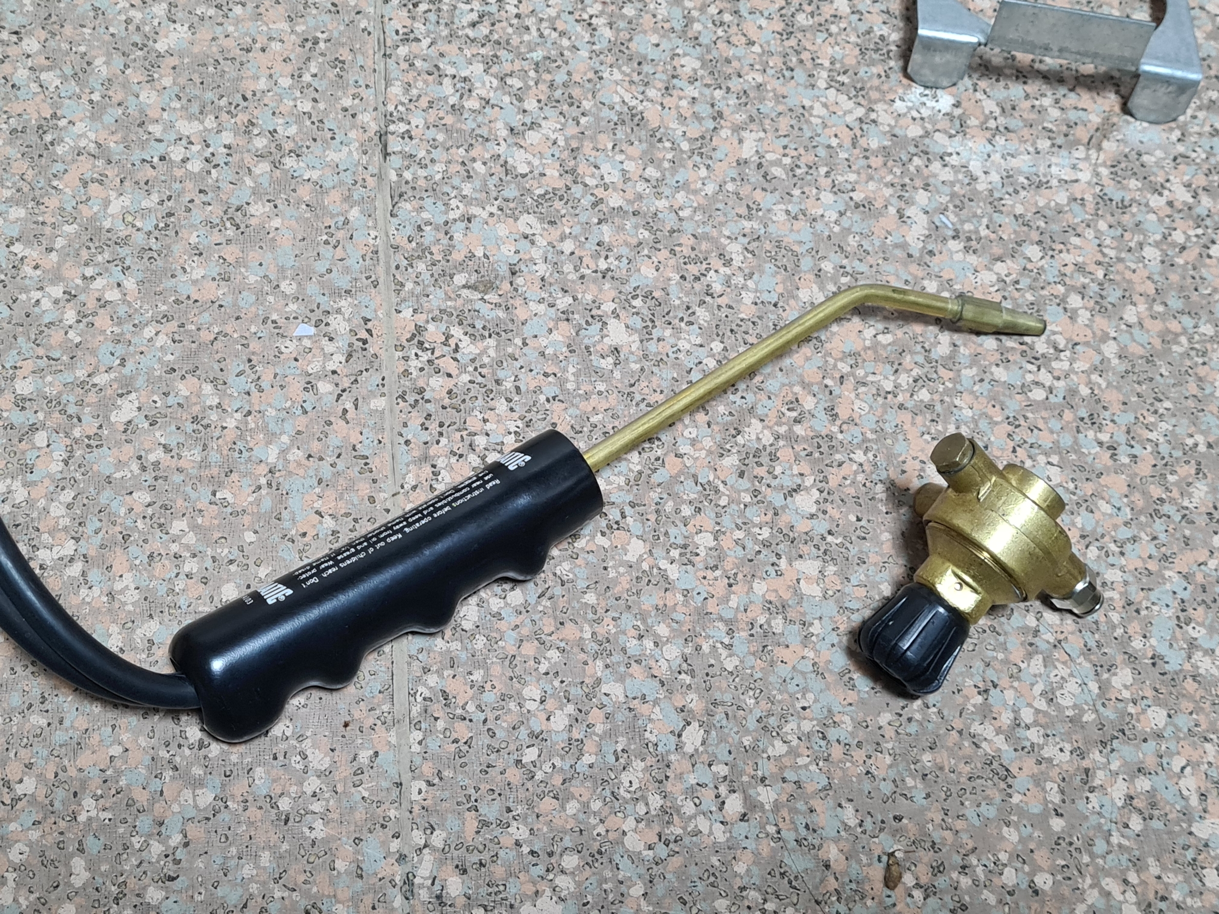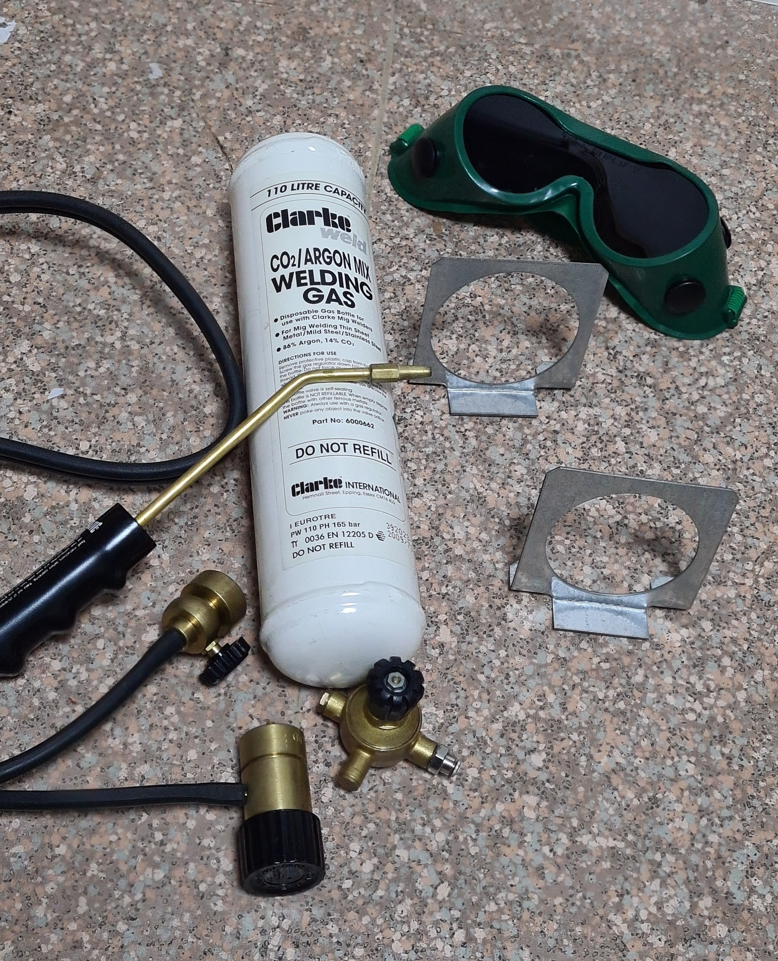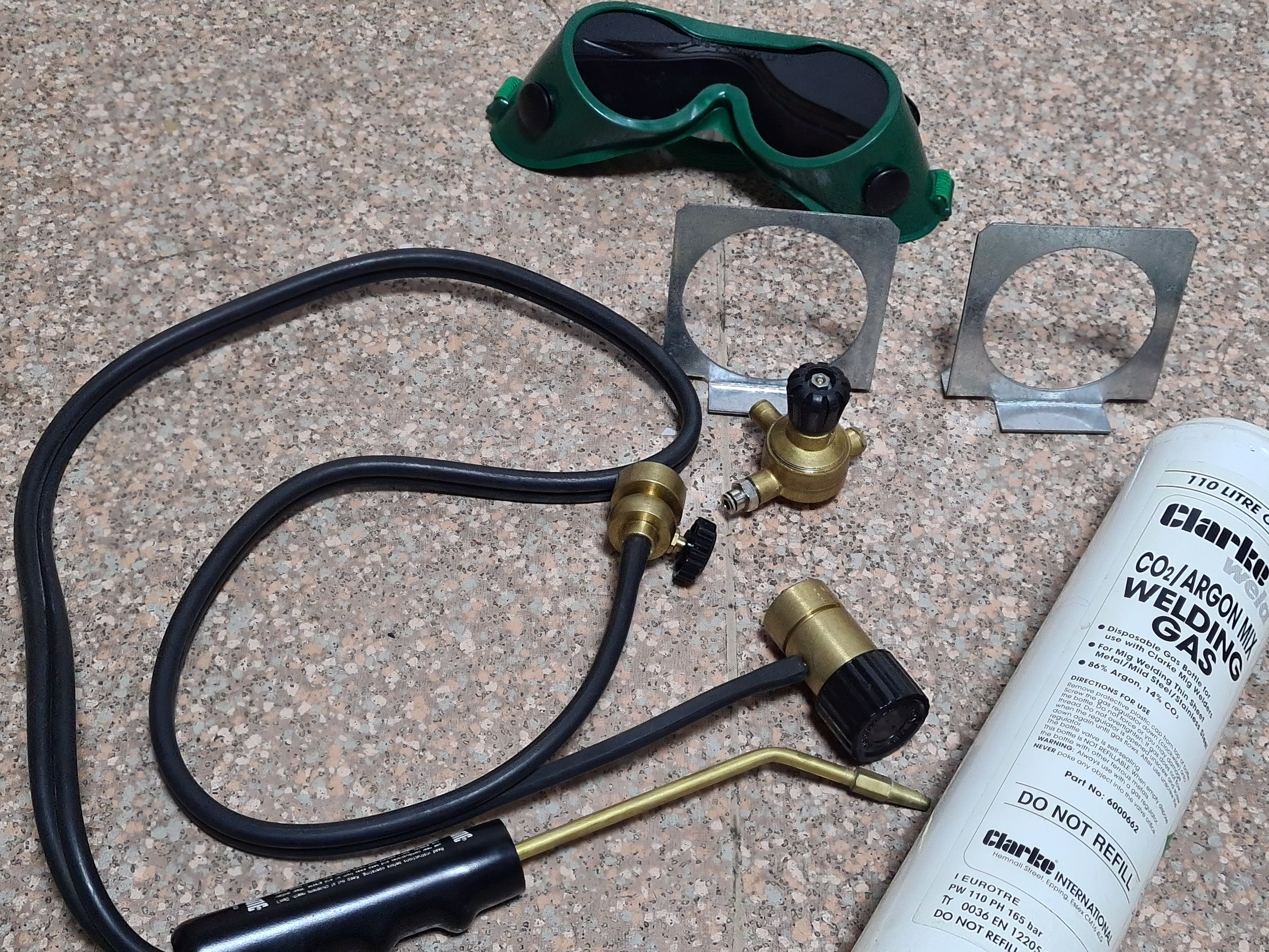 A BernzOMatic Welding Torch with a Clarke Welding Gas Cannister, a connector and a pair of dark goggles.