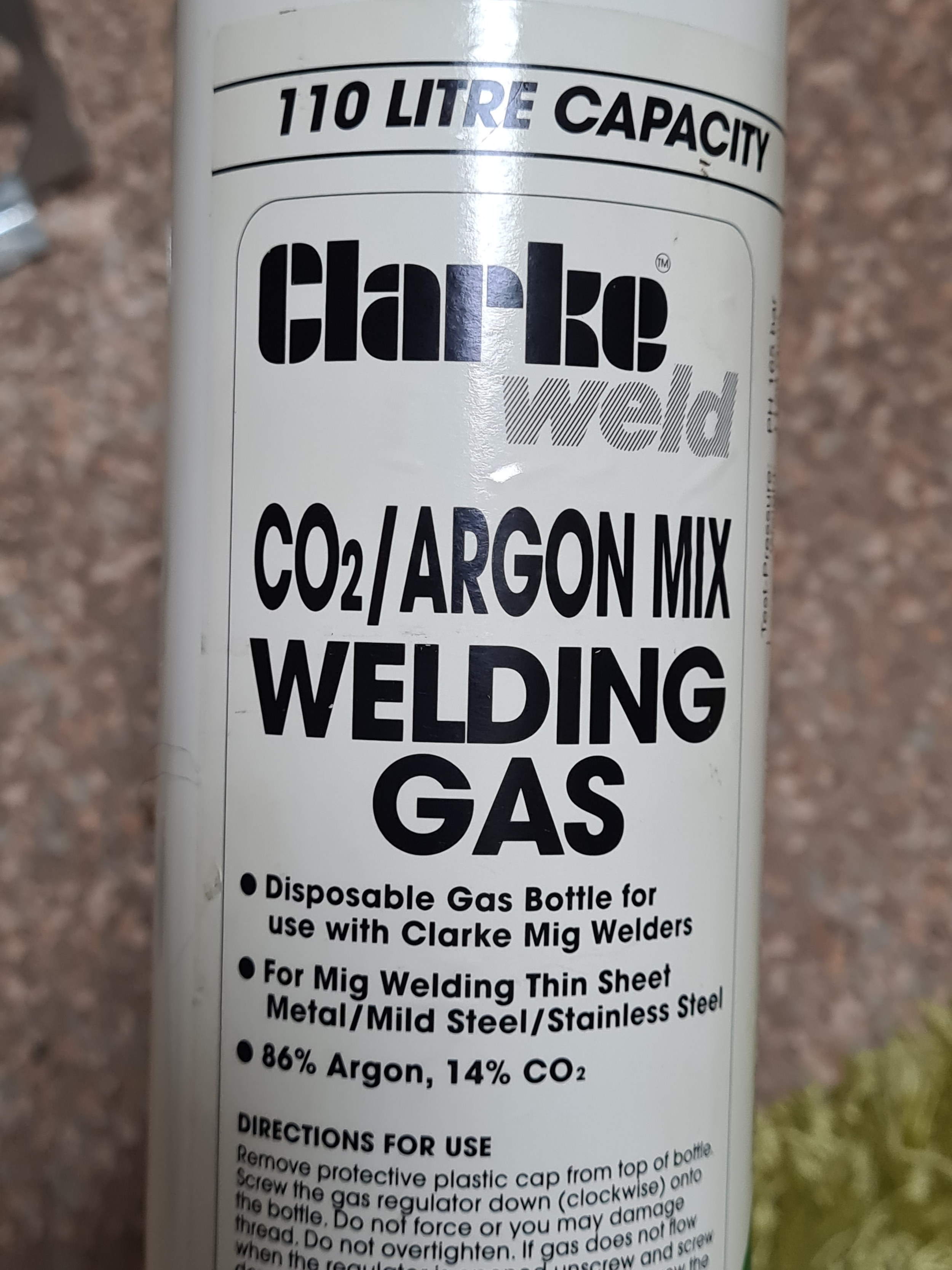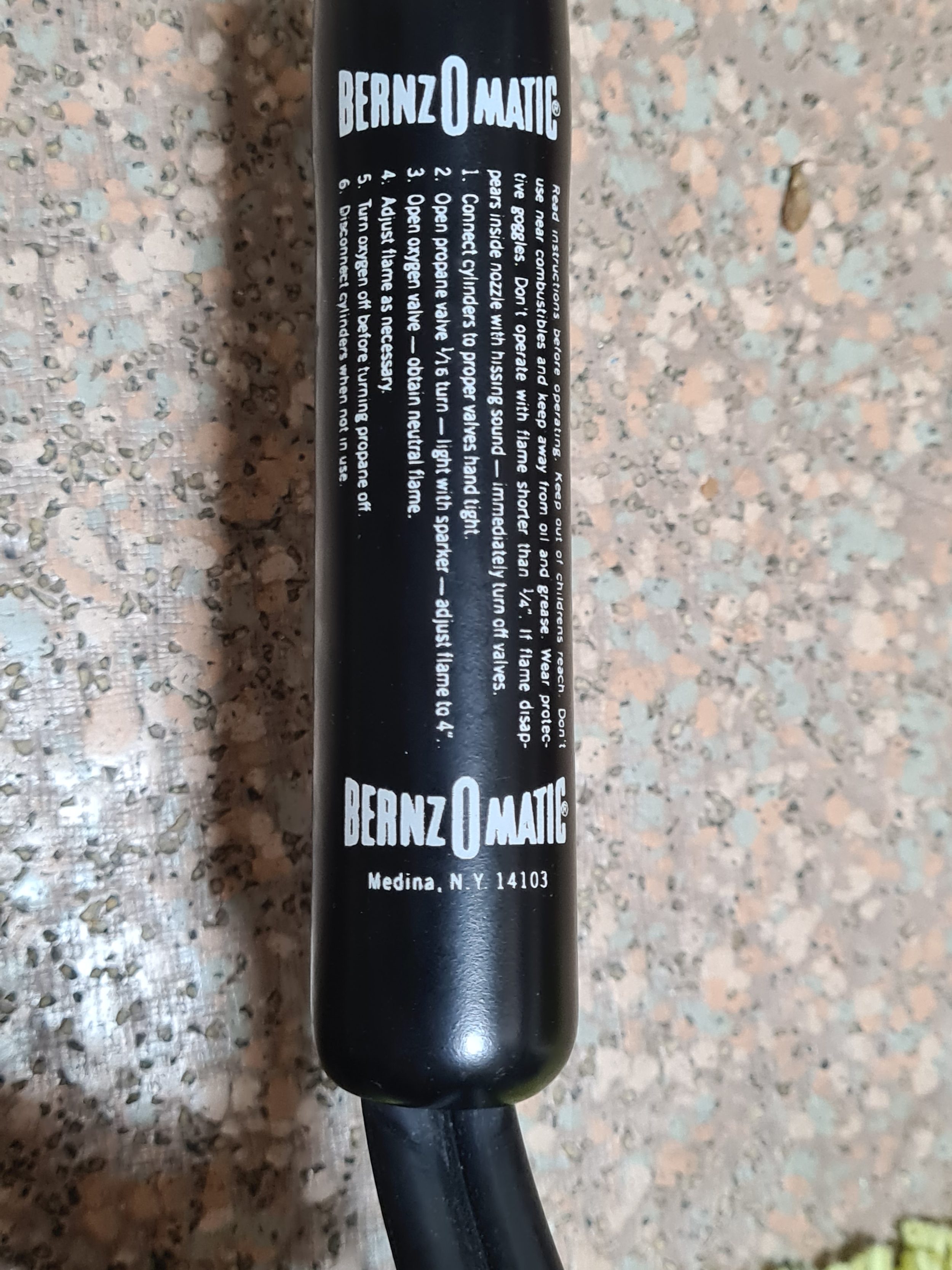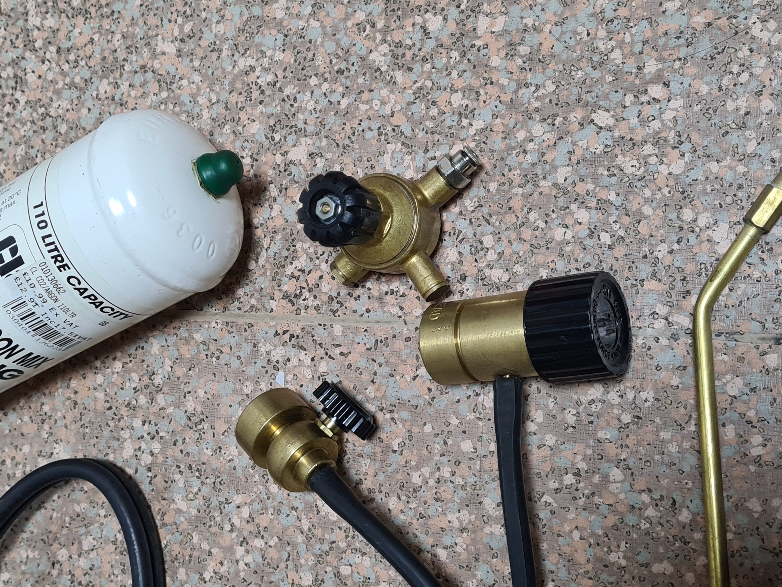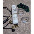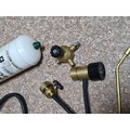 A BernzOMatic Welding Torch with a Clarke Welding Gas Cannister, a connector and a pair of dark goggles.