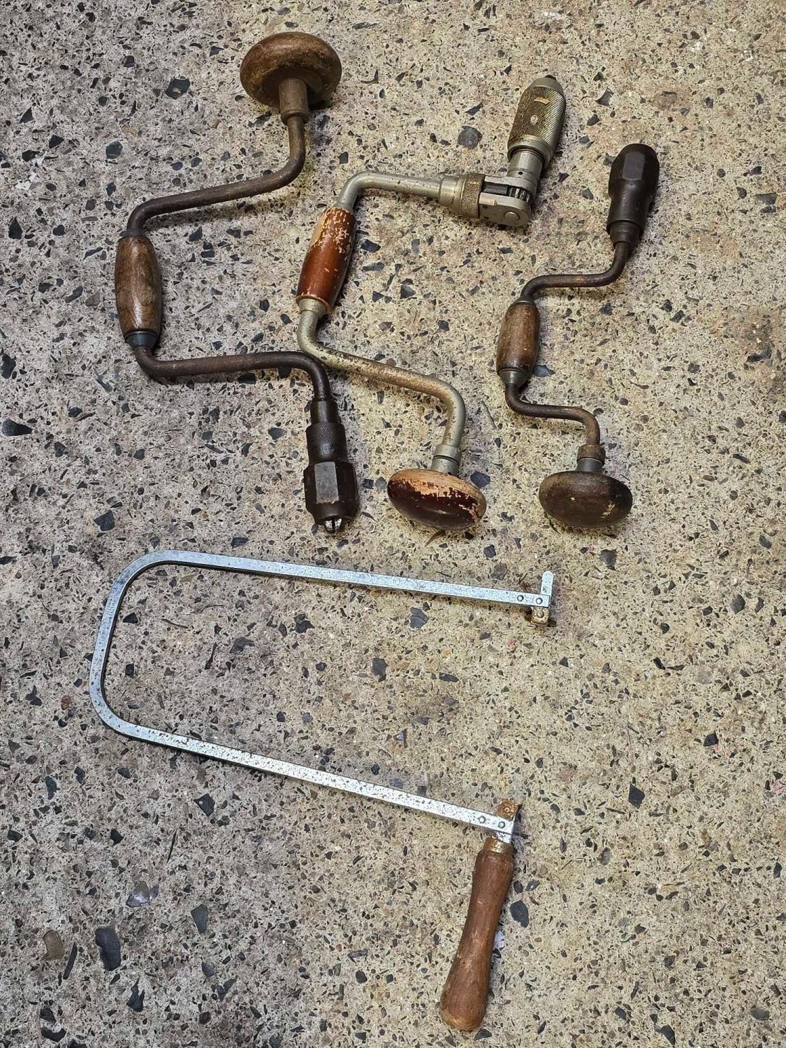 CARTON WITH 3 VINTAGE WOOD BRACES & A MITRE SAW