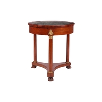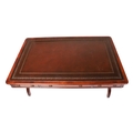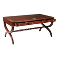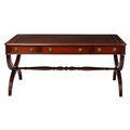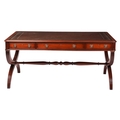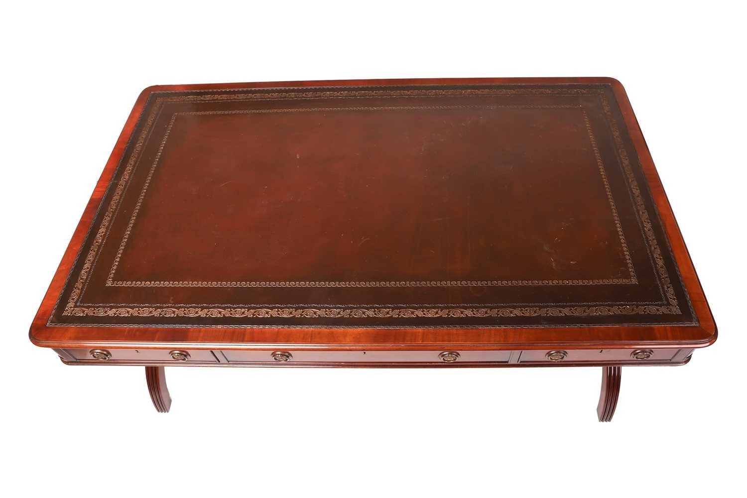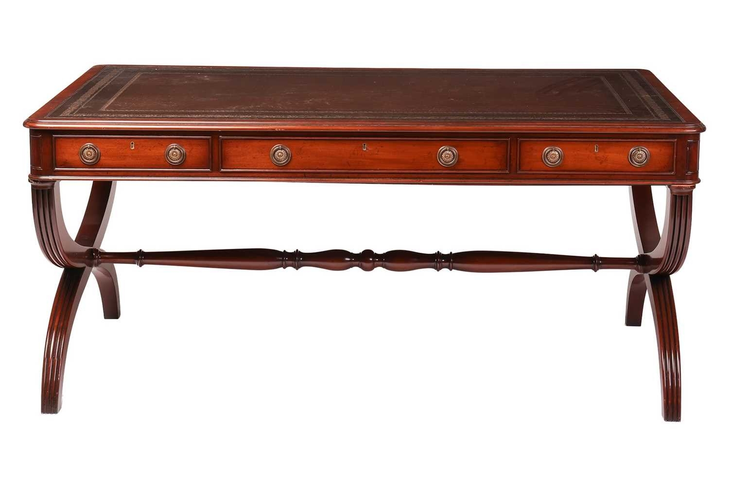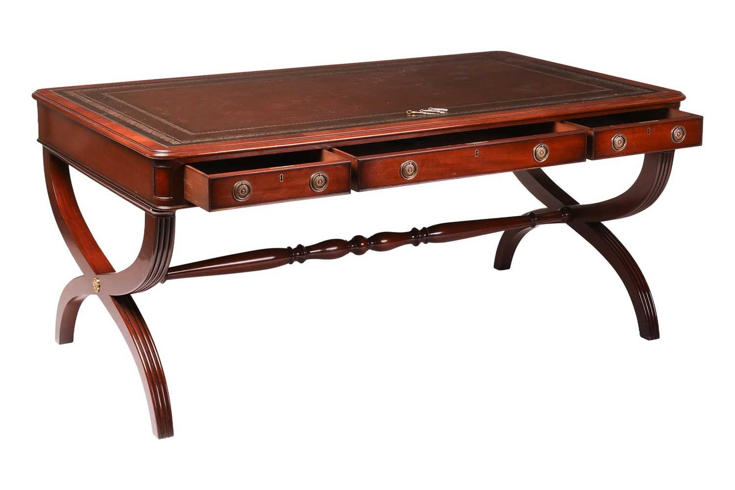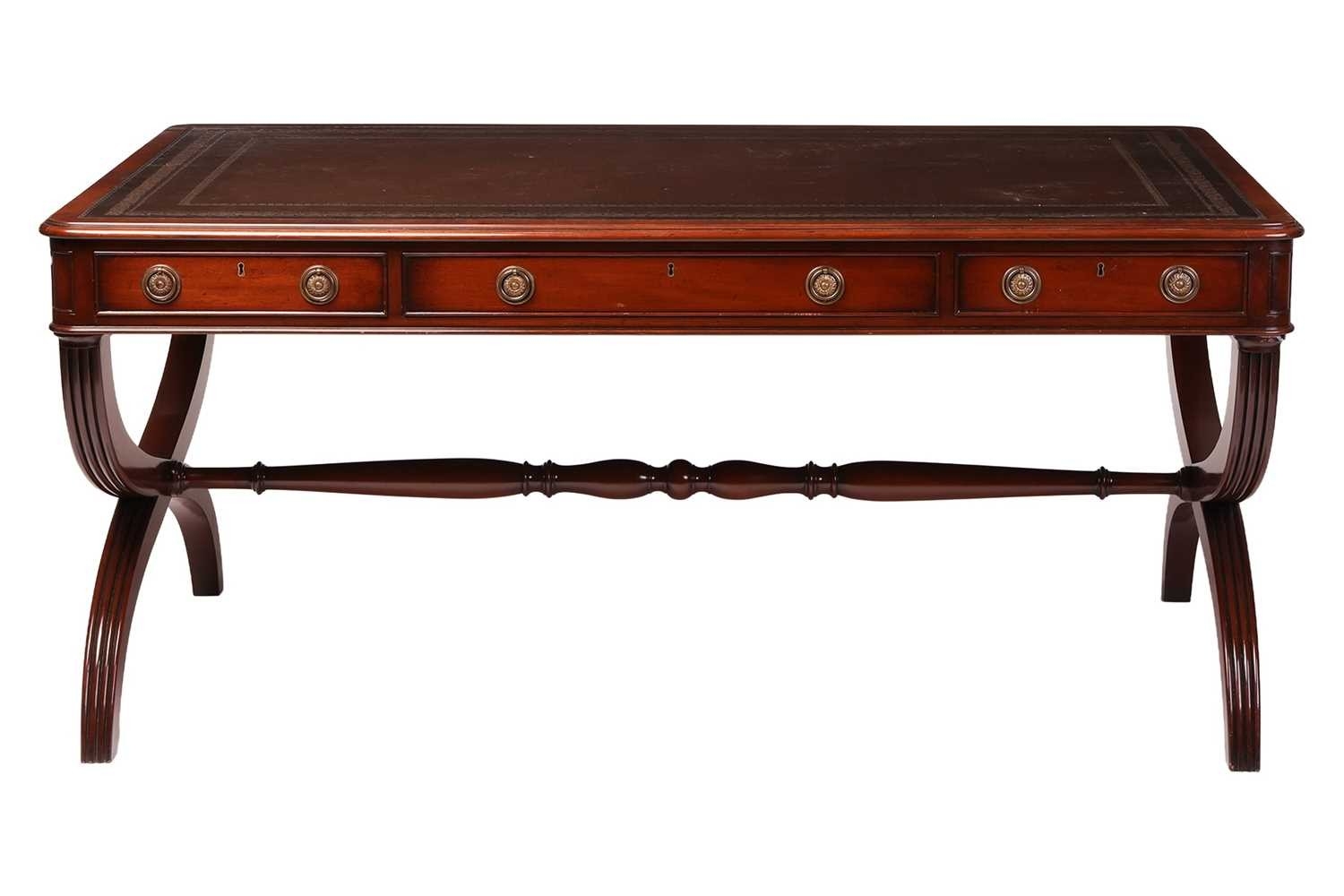 A Regency-style three-drawer mahogany writing table, with tooled leather top over three drawers and three dummy drawers, on an X-frame base, 77 cm high x 166 cm x 98 cm.