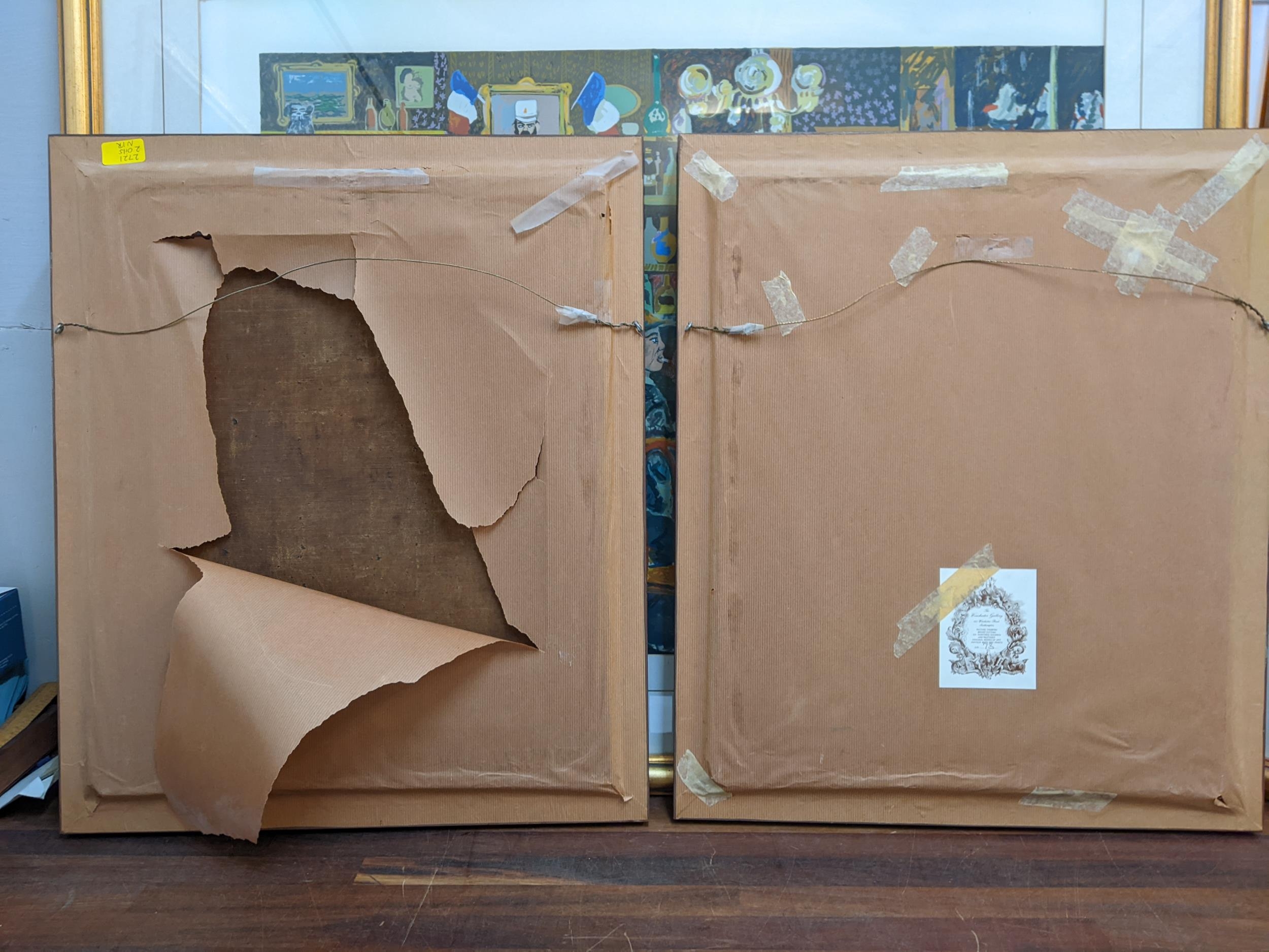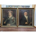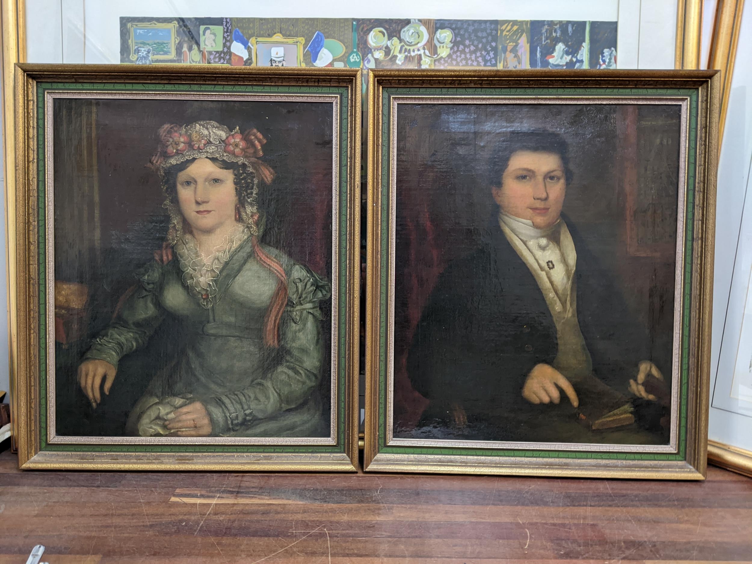 Late 19th century British school - a pair of portraits, a woman wearing a lace bonnet with flowers, and a green dress and the gentleman with a white shirt and black jacket, oil on canvas, 57cm x 47cm, framed