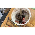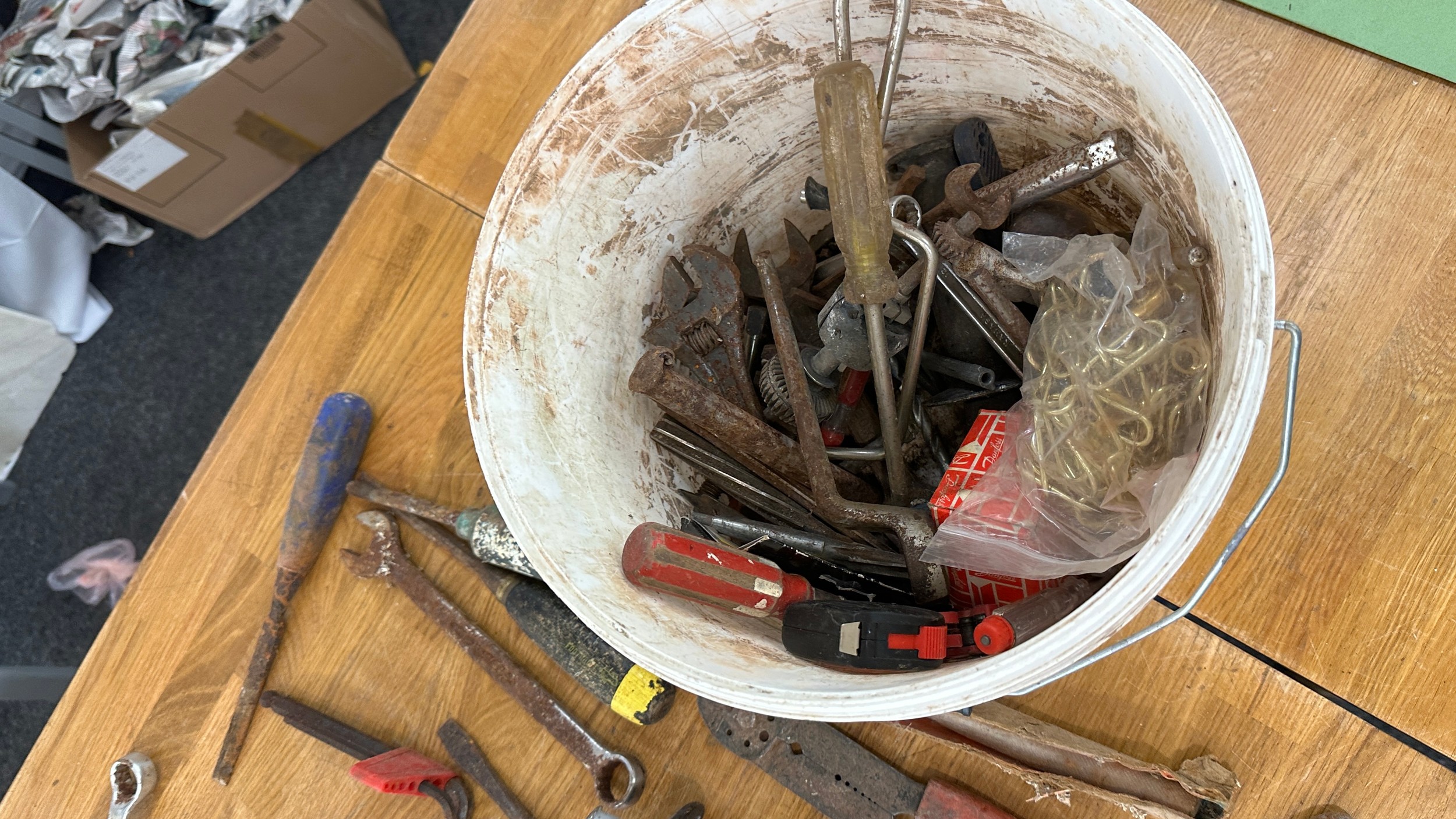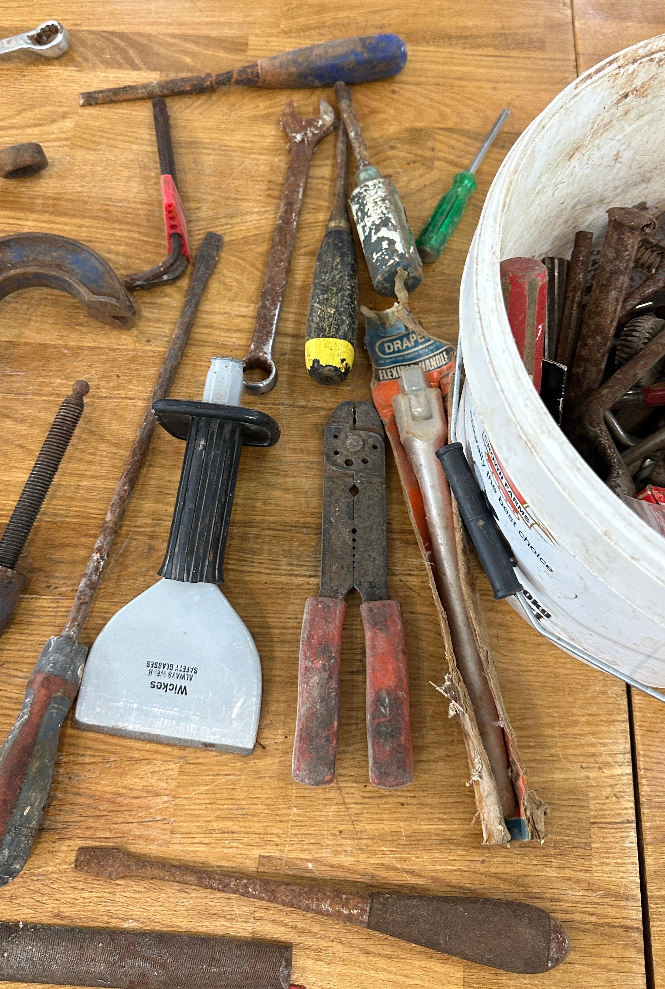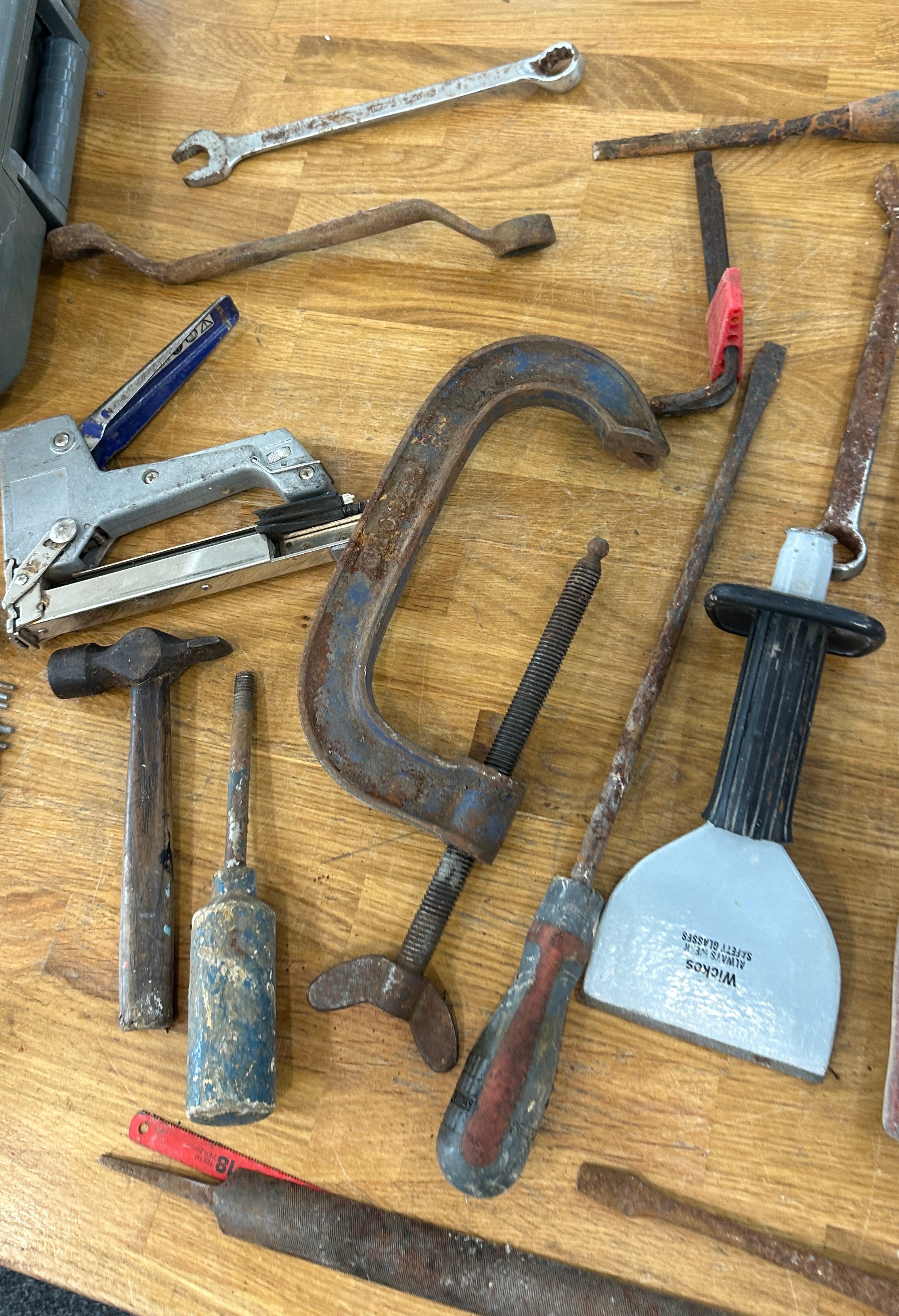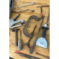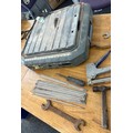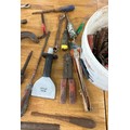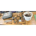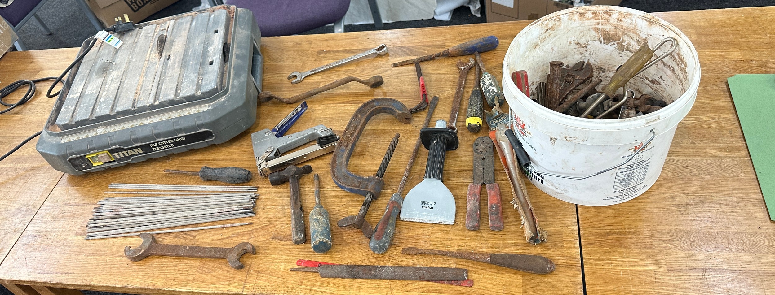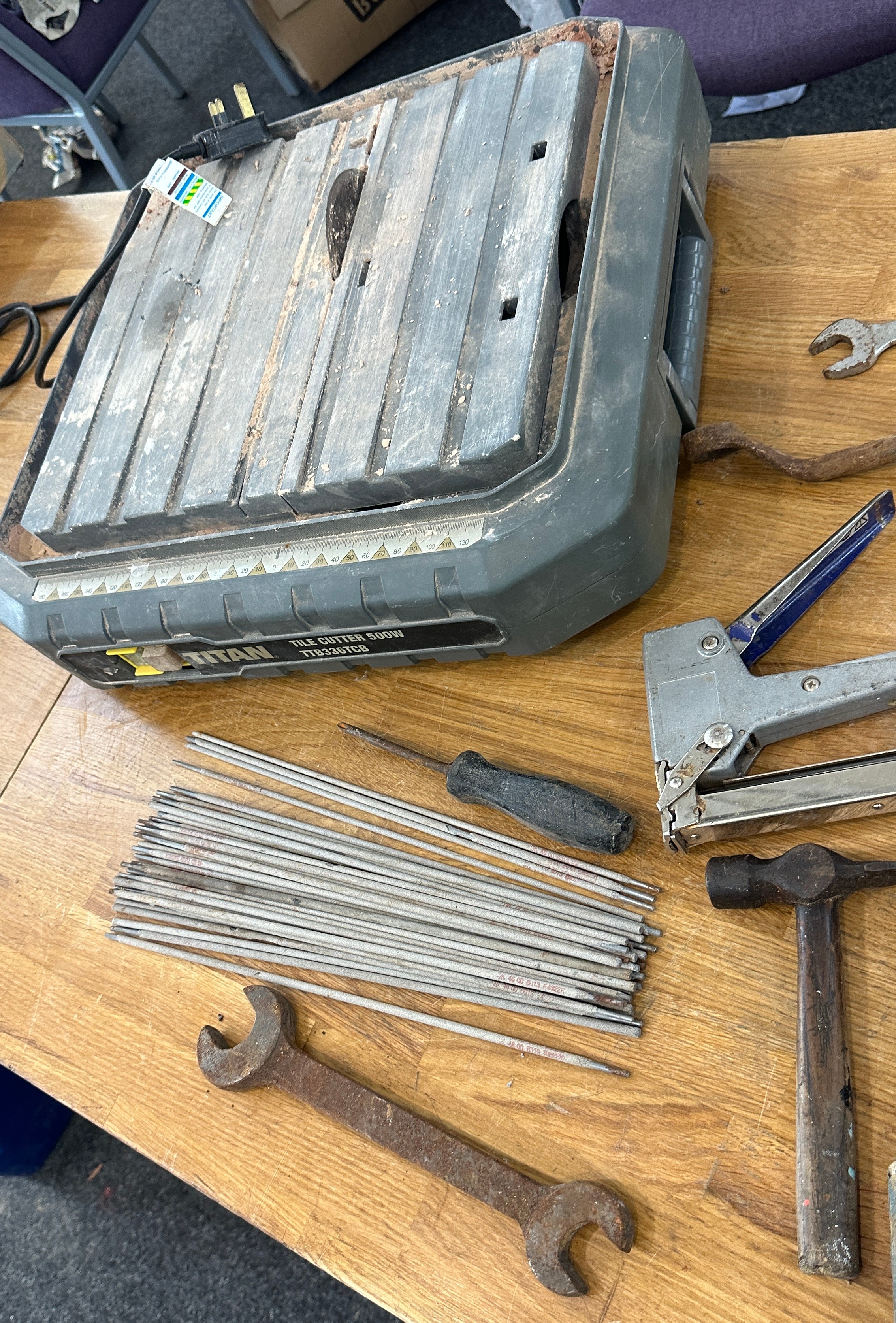 Titan tile cutter and a selection of hand tools to include screw drivers, chisels etc