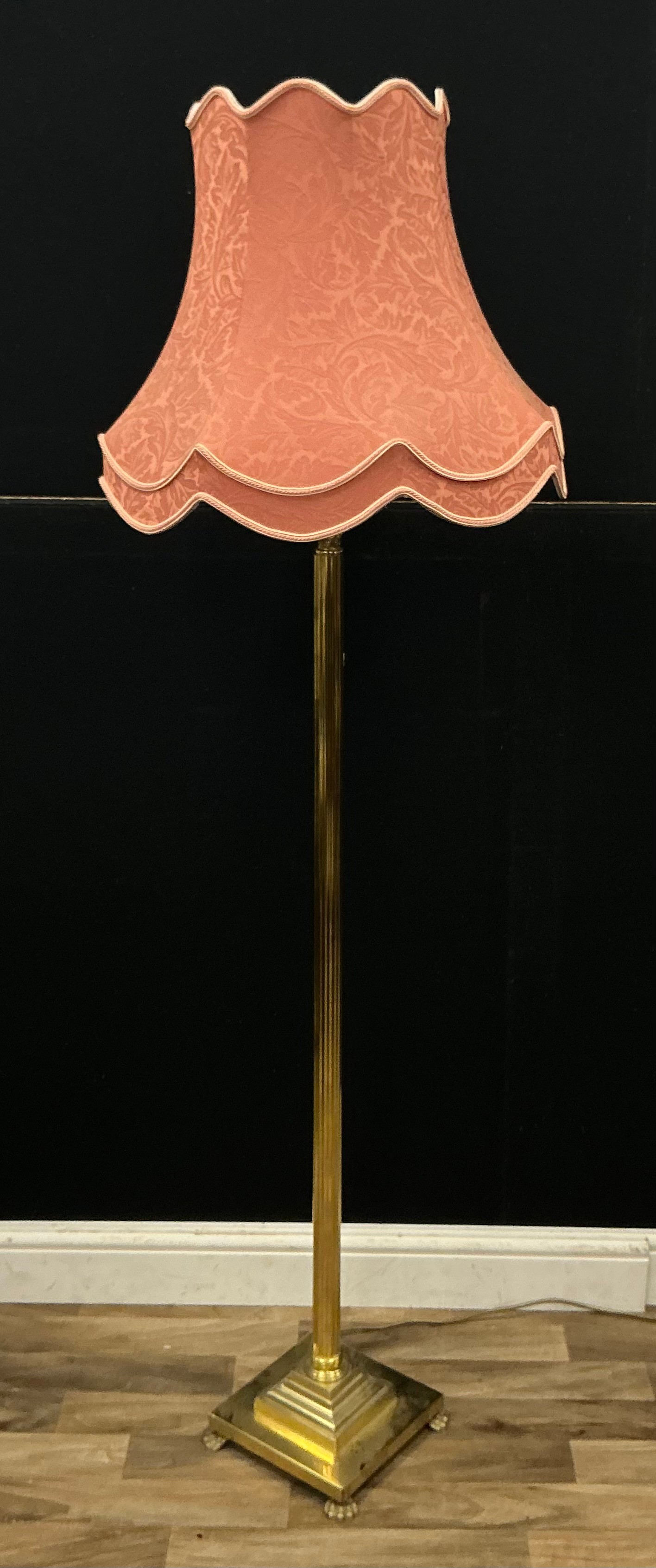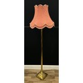 A 20th century highly polished brass Corinthian column standard lamp, peach coloured damask shade, standing approximately 5ft high