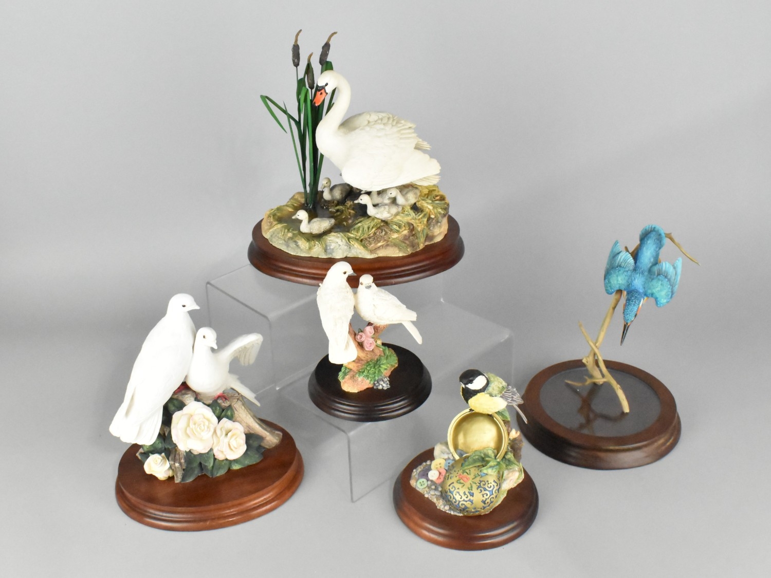 A Collection of Border Fine Arts Studies of Birds to Comprise "First One In" B0189, "Peace and Harmony" B0358, Great Tit on Button Box WB153, Kingfisher RB1 and Doves with Blossom WB34 (AF)