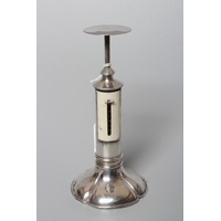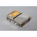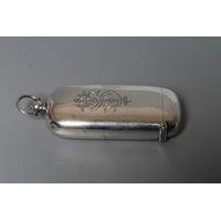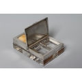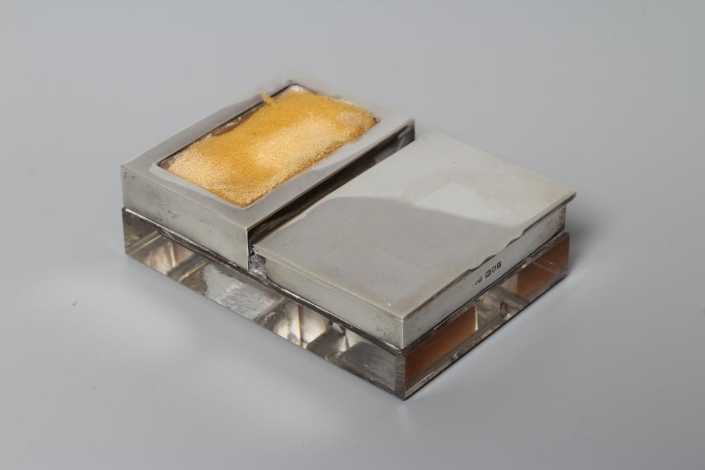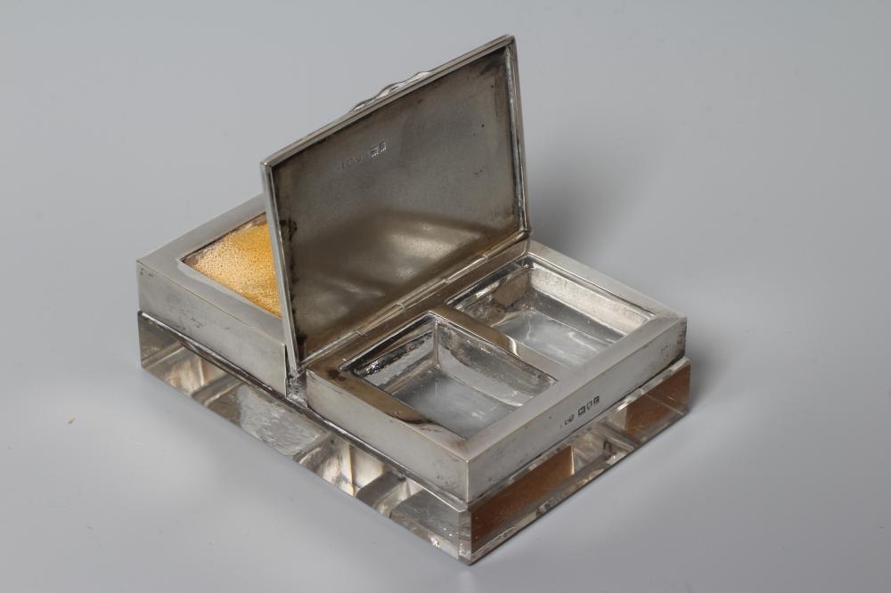 OF PHILATELIC INTEREST - A GEORGE V SILVER MOUNTED GLASS STAMP BOX by Stuart Clifford & Co., London 1912, the plain clear glass oblong base with hinged silver cover enclosing two stamp compartments, and a sponge section, 3 1/2" wide (Illustrated)