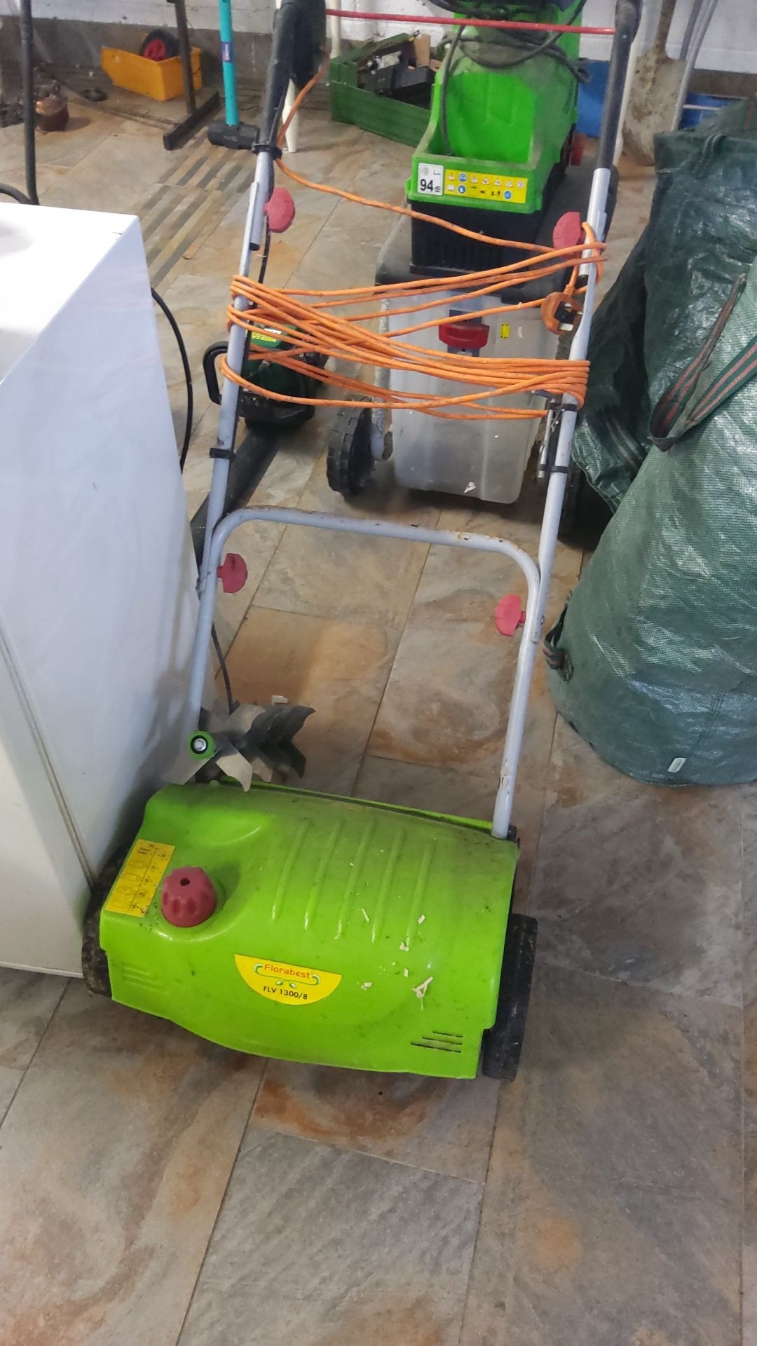 Florabest electric lawn scarifier, model FLV 1300/8, has a vibrant green exterior with an ergonomic handle design.(pwo)