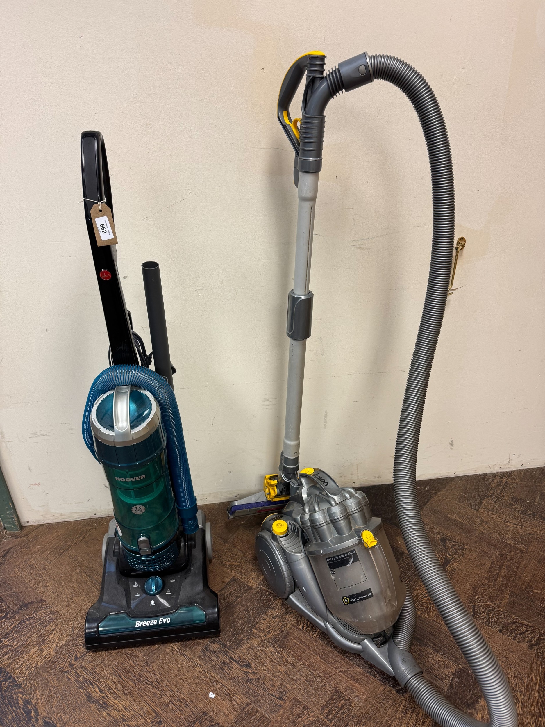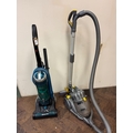 A Dyson cylinder vacuum cleaner together with a Hoover Breeze upright vacuum cleaner