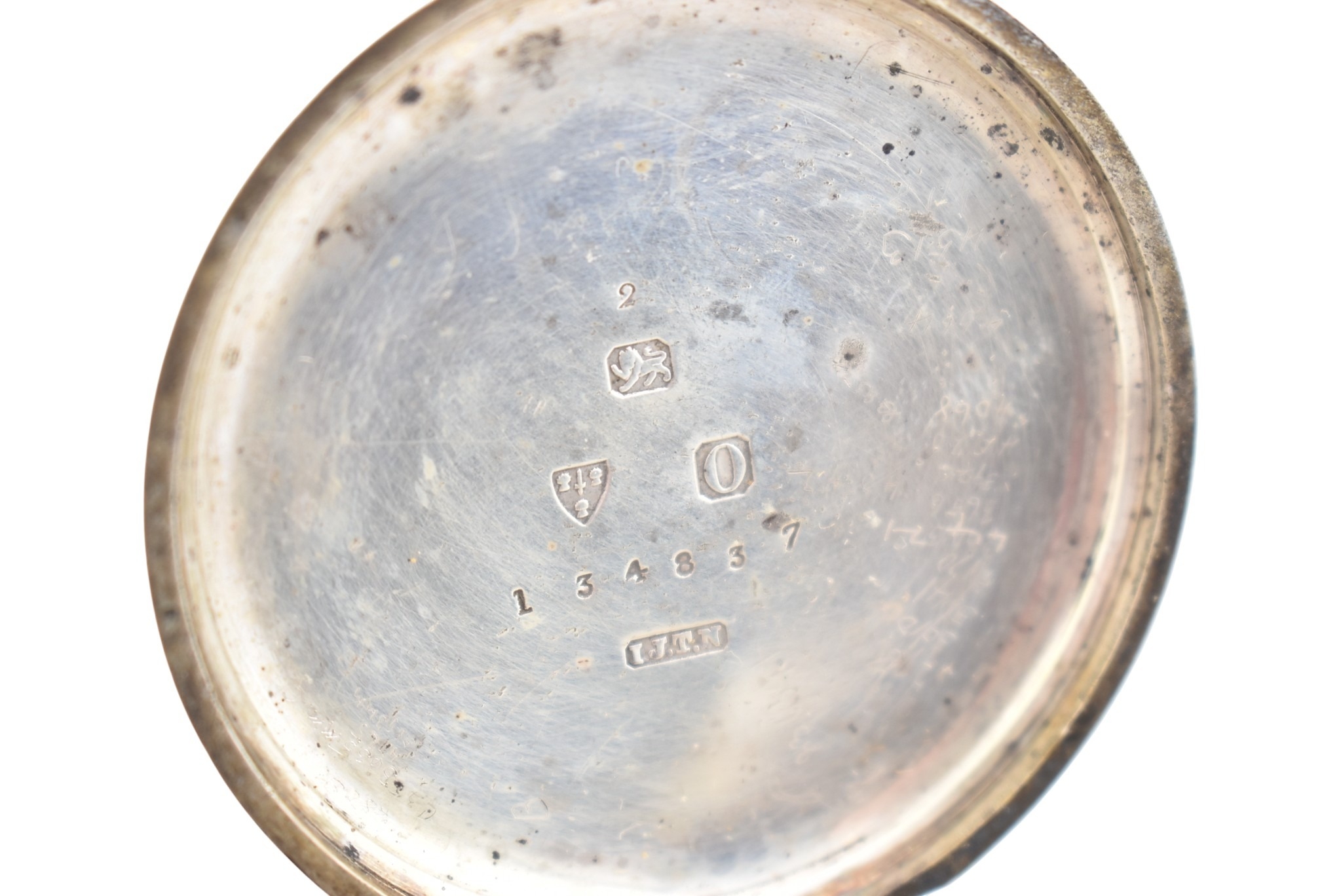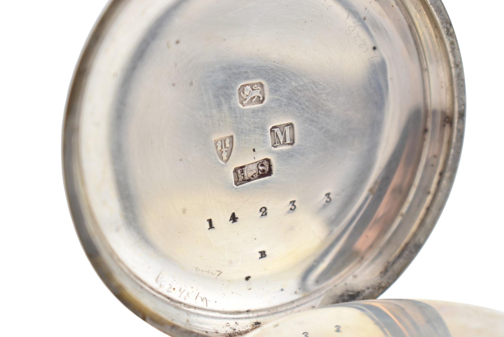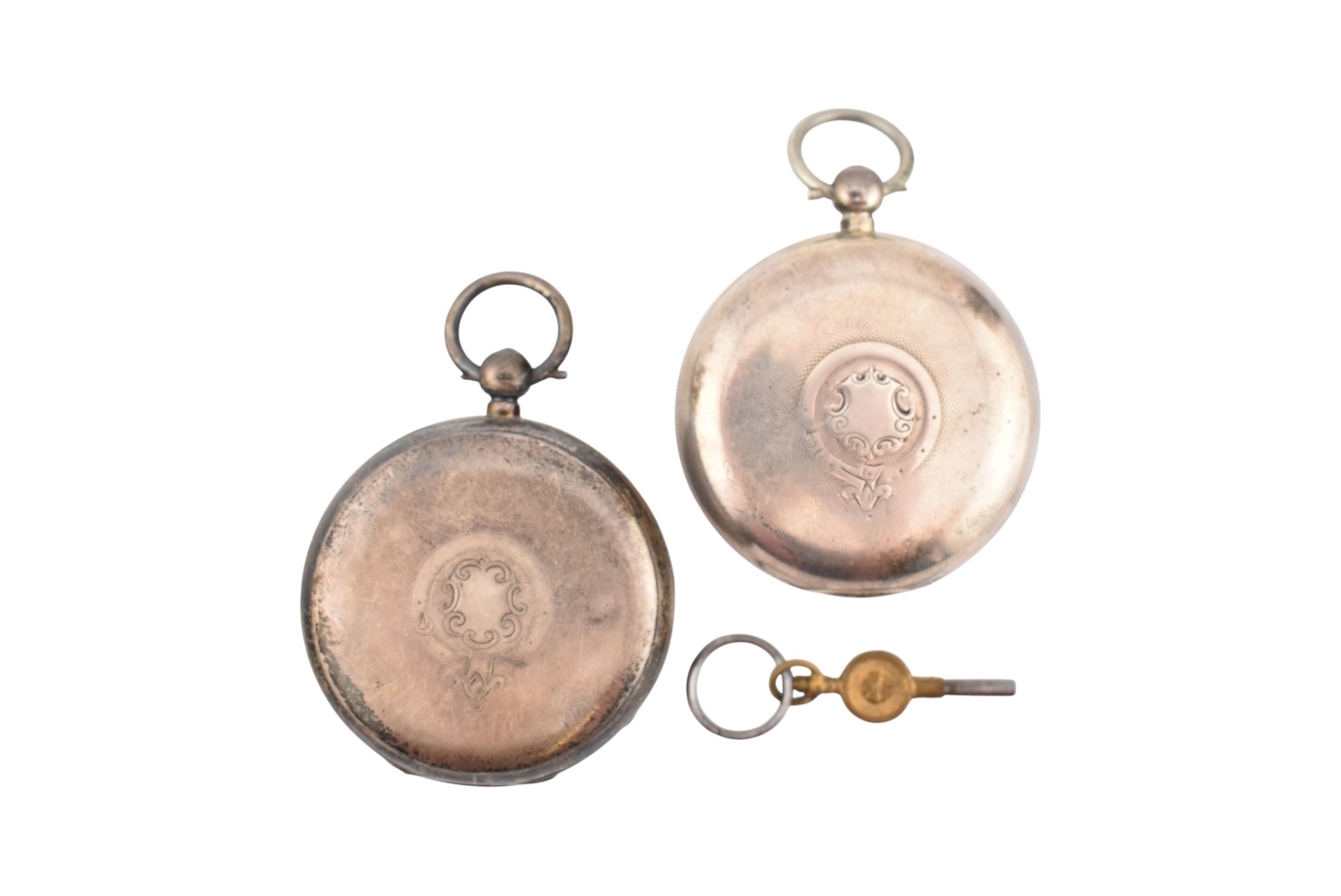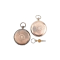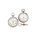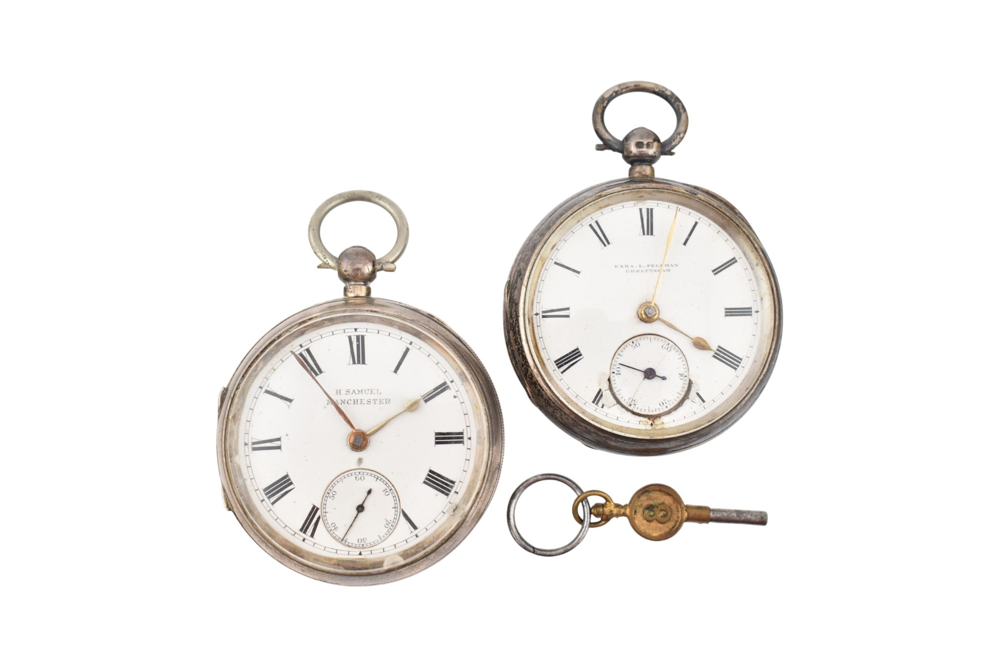 2 silver hallmarked open faced pocket watches. One marked for H Samuel of Manchester, the other Elza Feldman of Cheltenham. Both key wind, bales atop. Total weight 251g