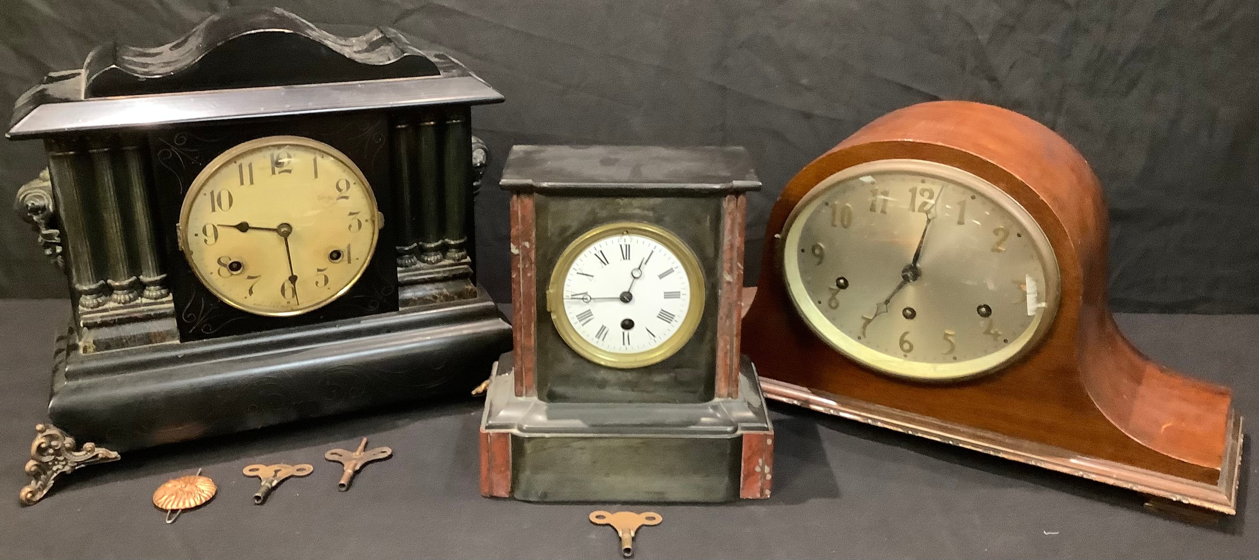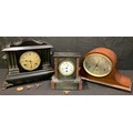 An American mantel clock; a mahogany Napoleon hat mantel clock; a French black slate and rouge marble mantel clock (3)