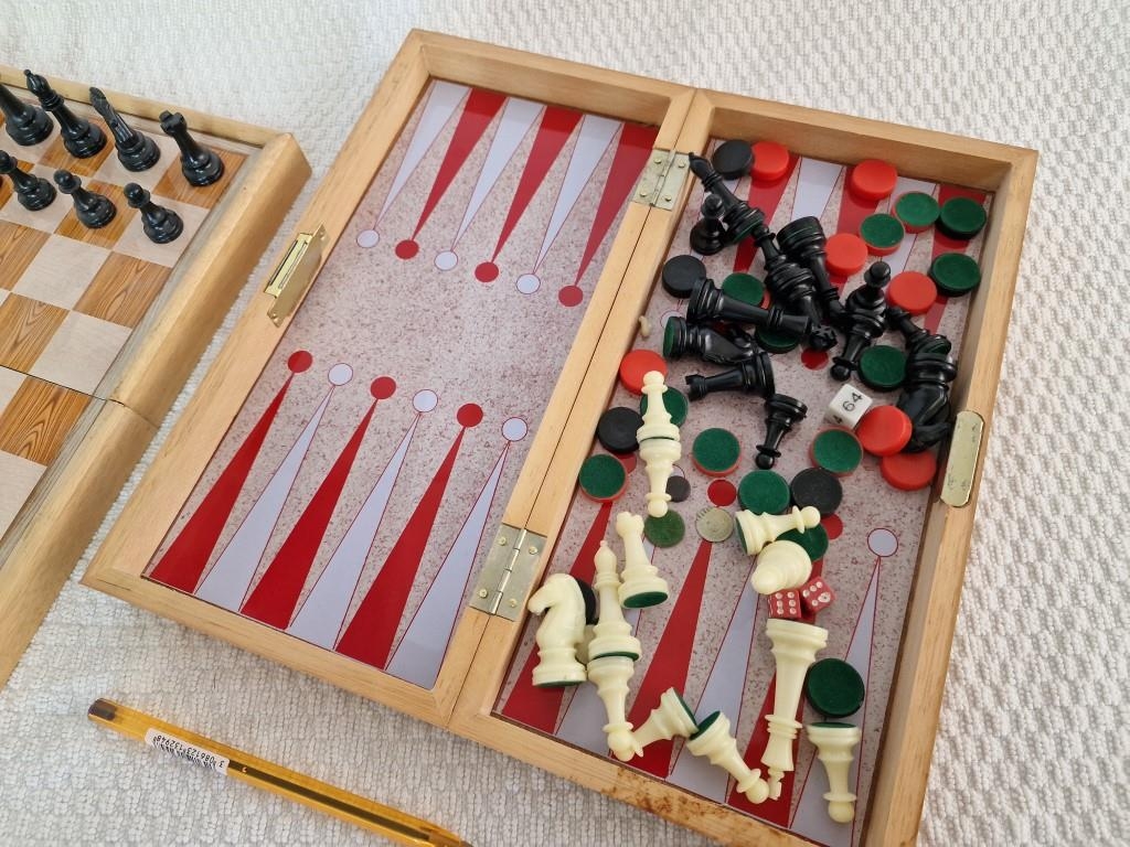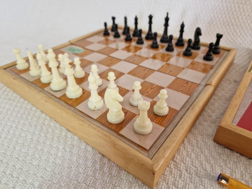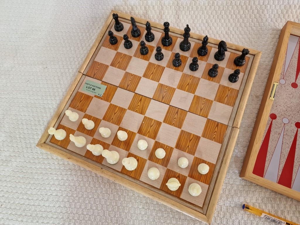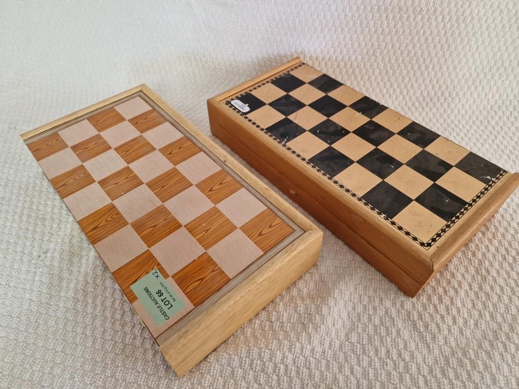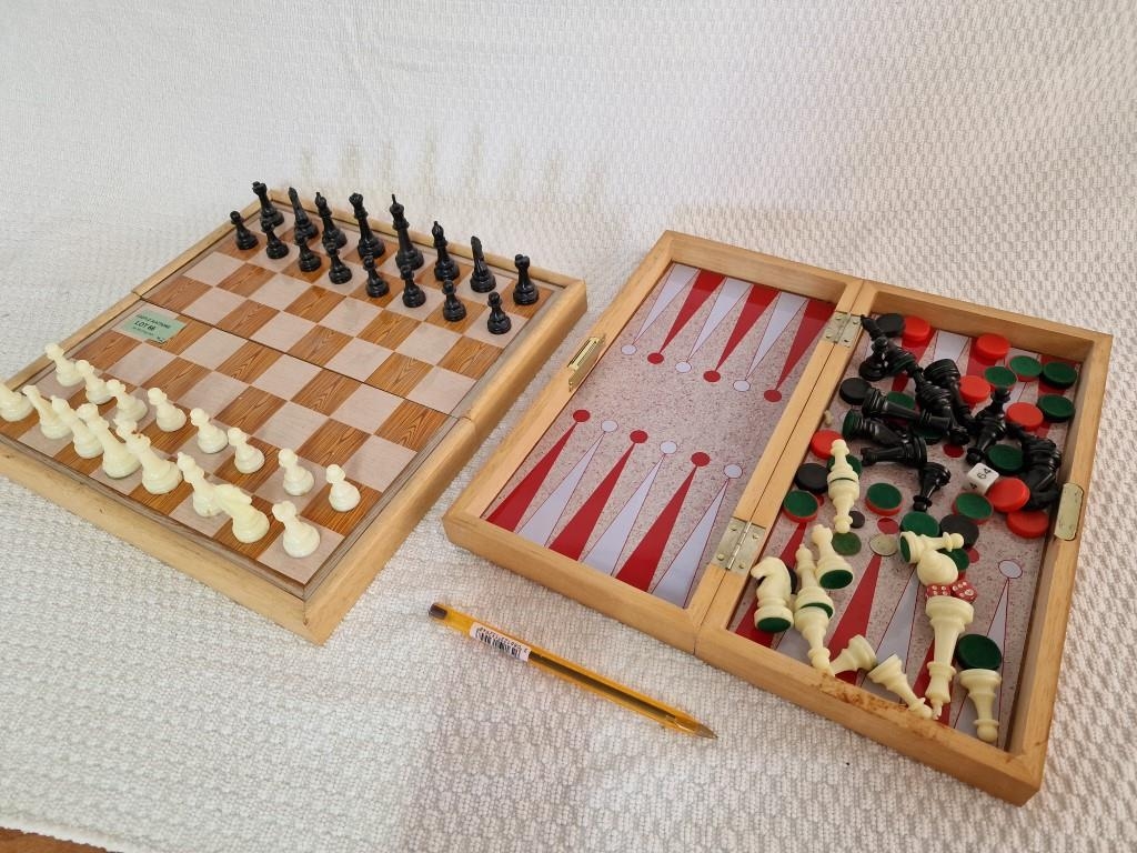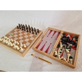 2 x Folding Travel Chess / Backgammon Boards with 1 x Complete Set of Chess Pieces and Others