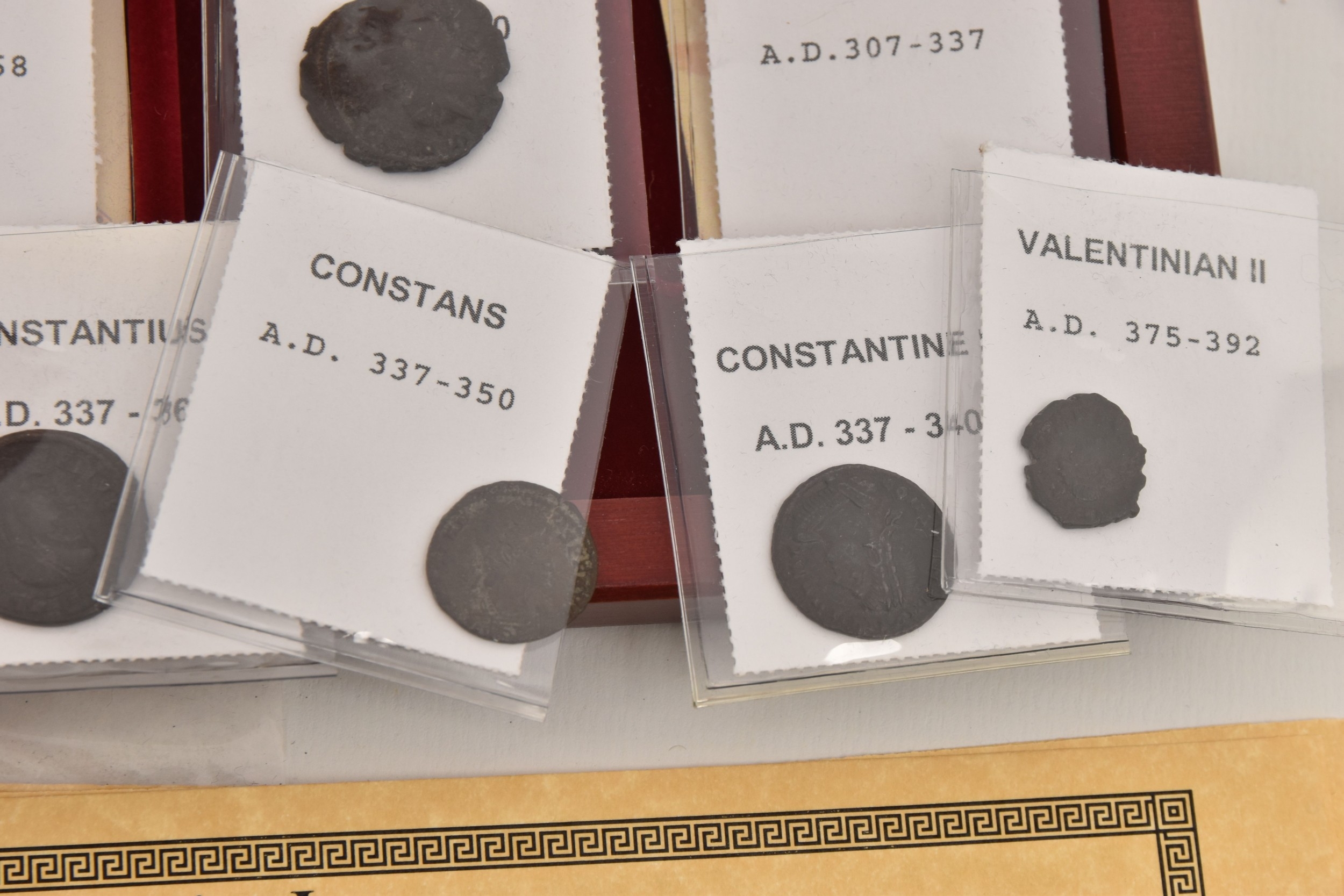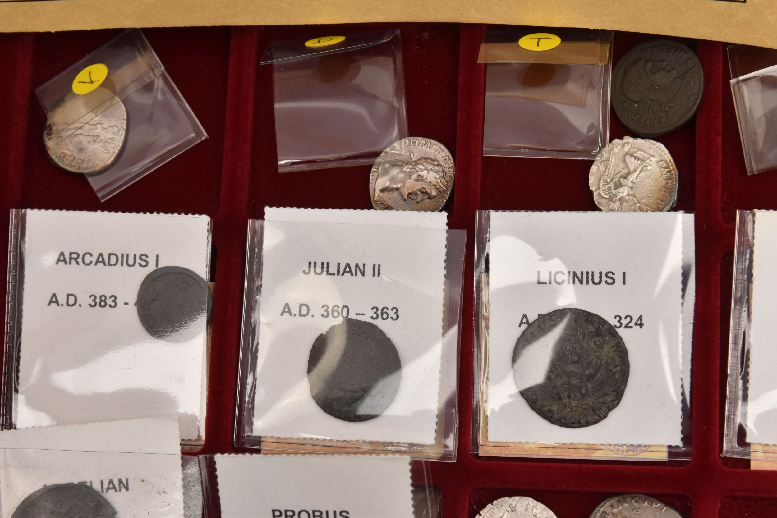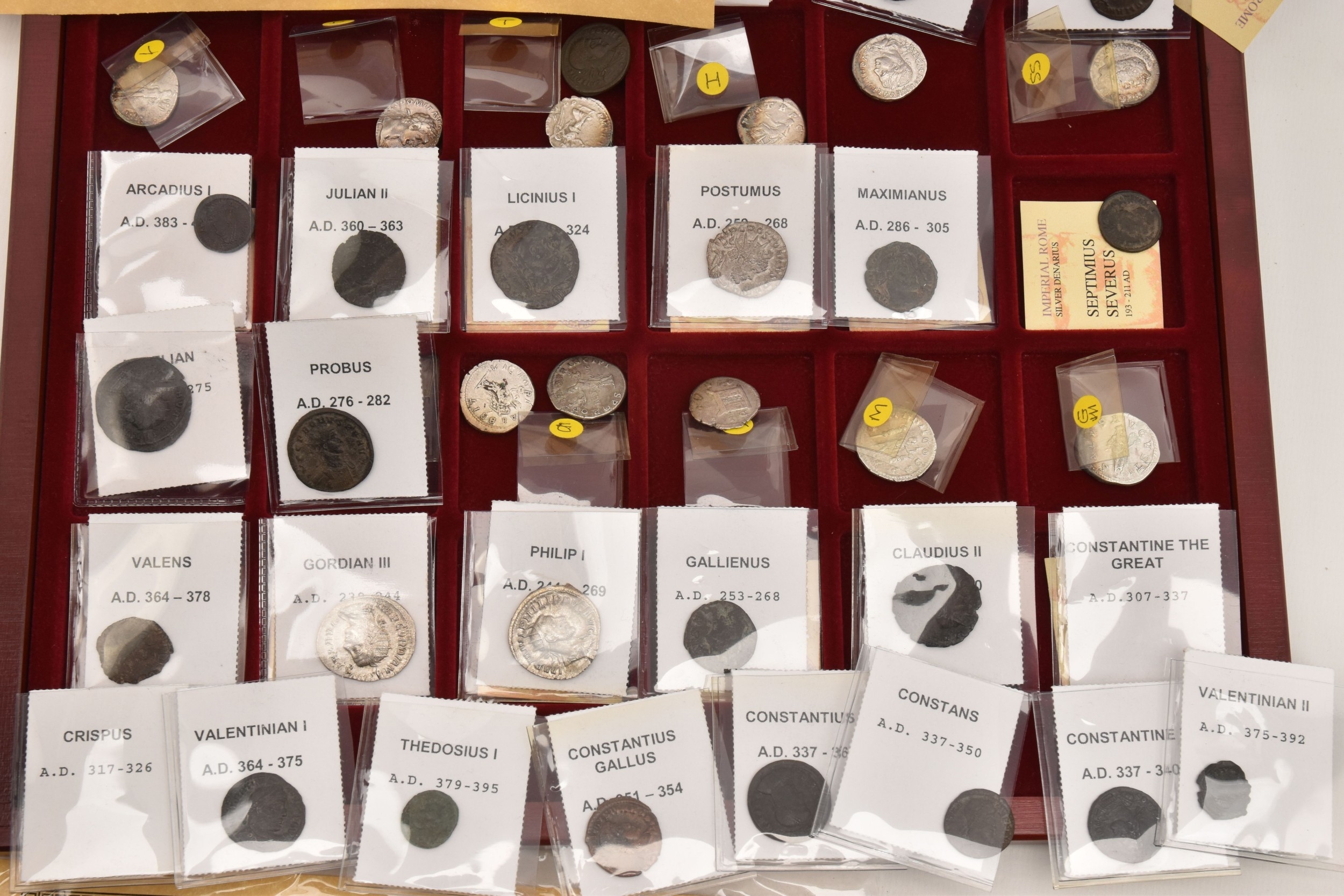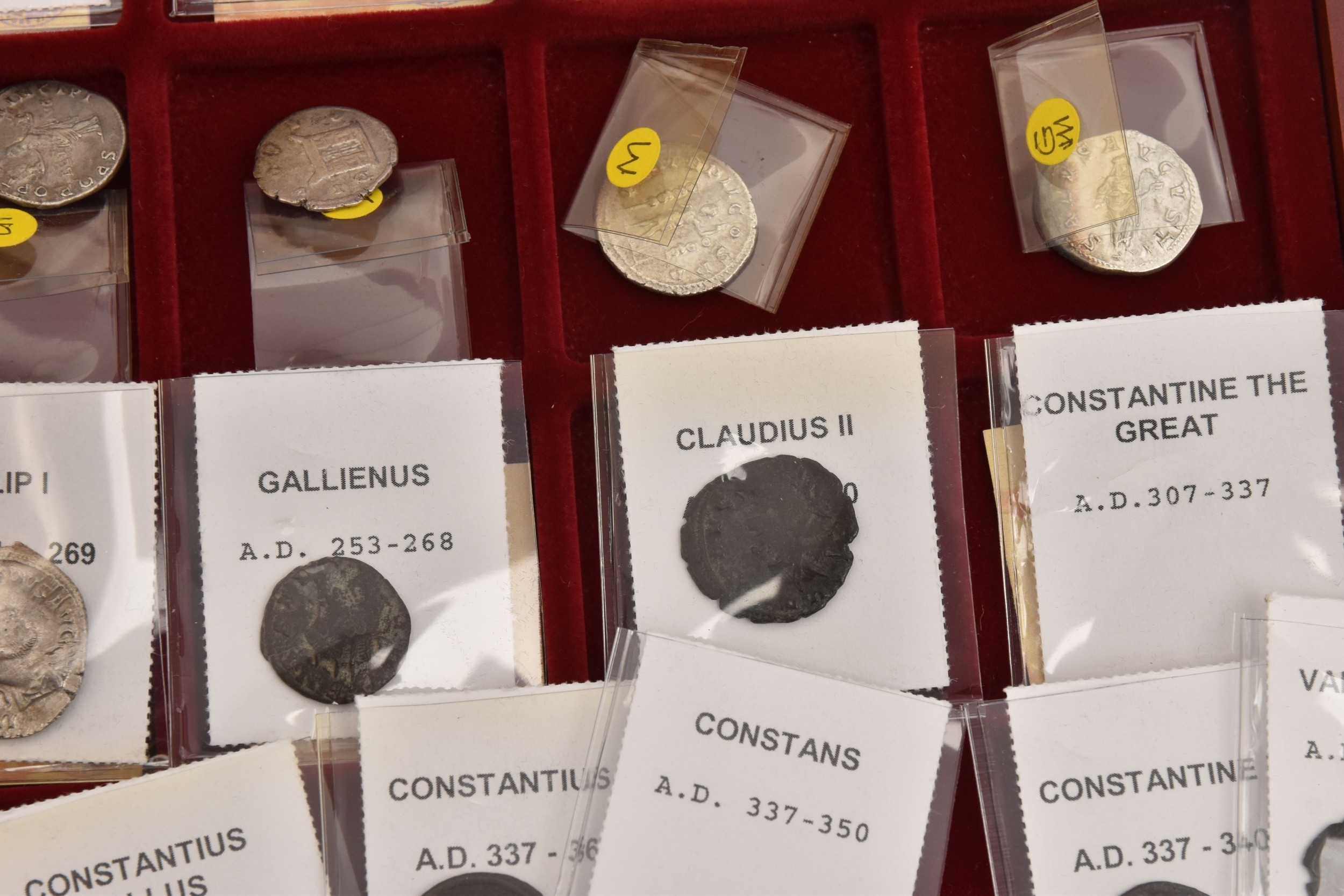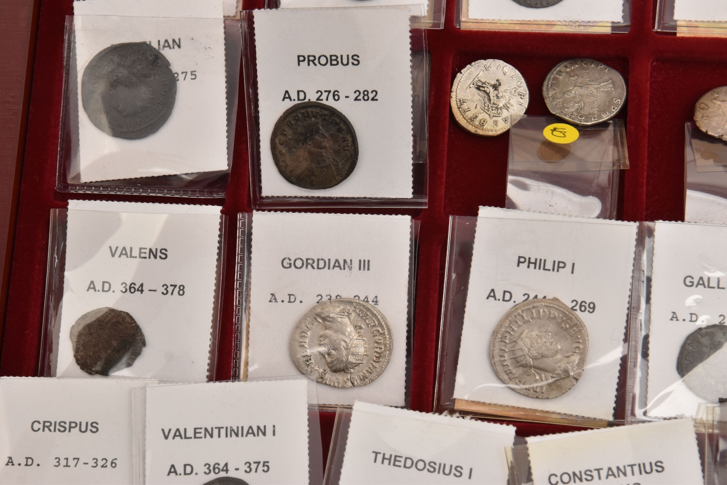 A BOXED COLLECTION OF VARIOUS ROMAN COINS FROM VARIOUS EMPERORS including Arcadius I, Julian II, Postumus, Constantius II, Constans, Valentinian I & II, approx. 35 coins in total, all in well circulated condition, in display box.