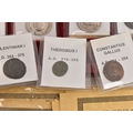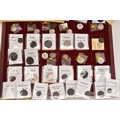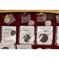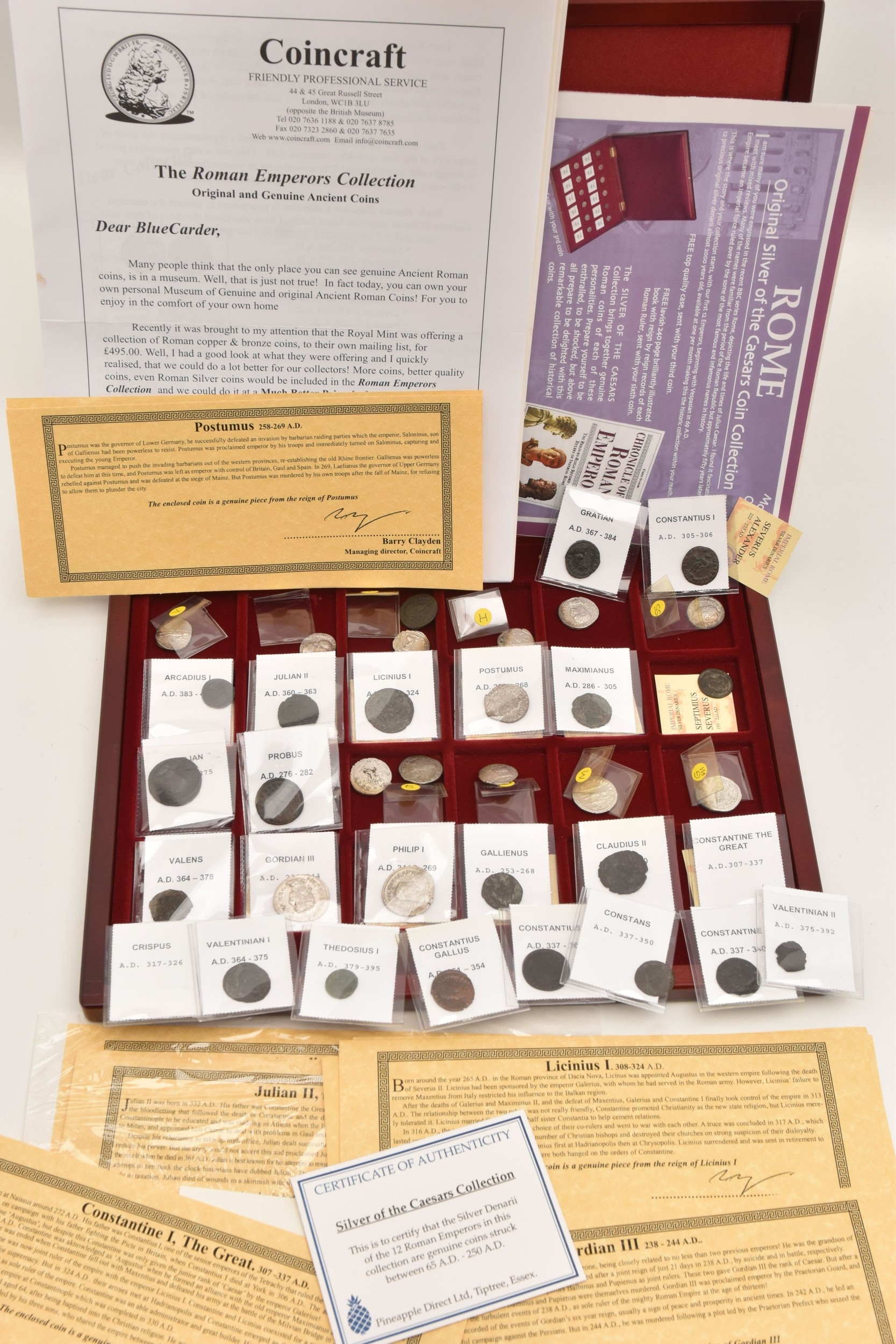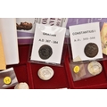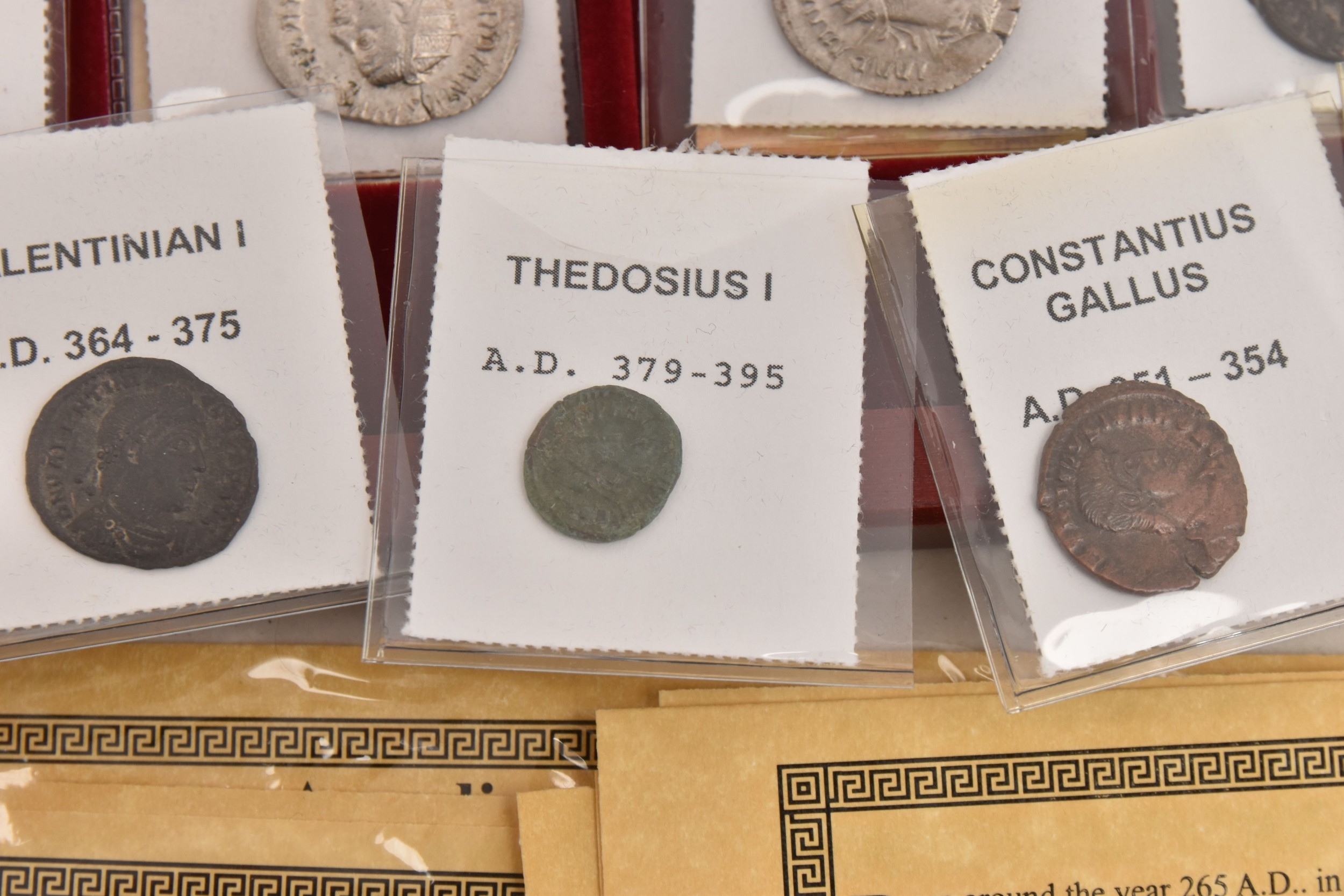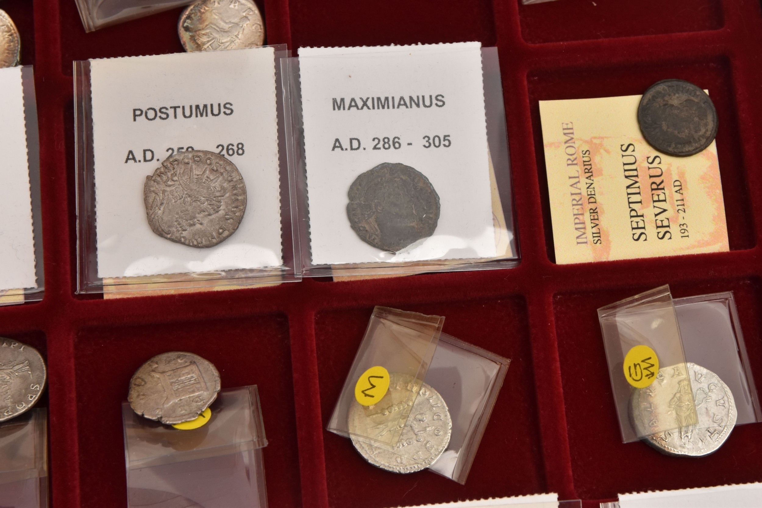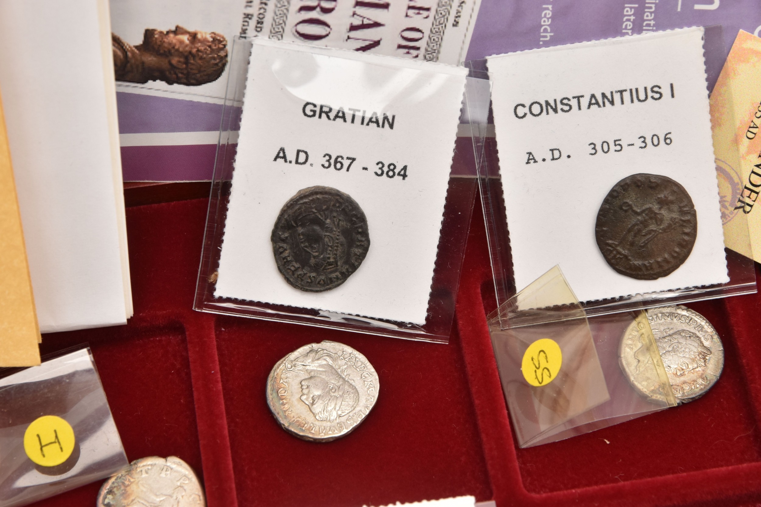 A BOXED COLLECTION OF VARIOUS ROMAN COINS FROM VARIOUS EMPERORS including Arcadius I, Julian II, Postumus, Constantius II, Constans, Valentinian I & II, approx. 35 coins in total, all in well circulated condition, in display box.