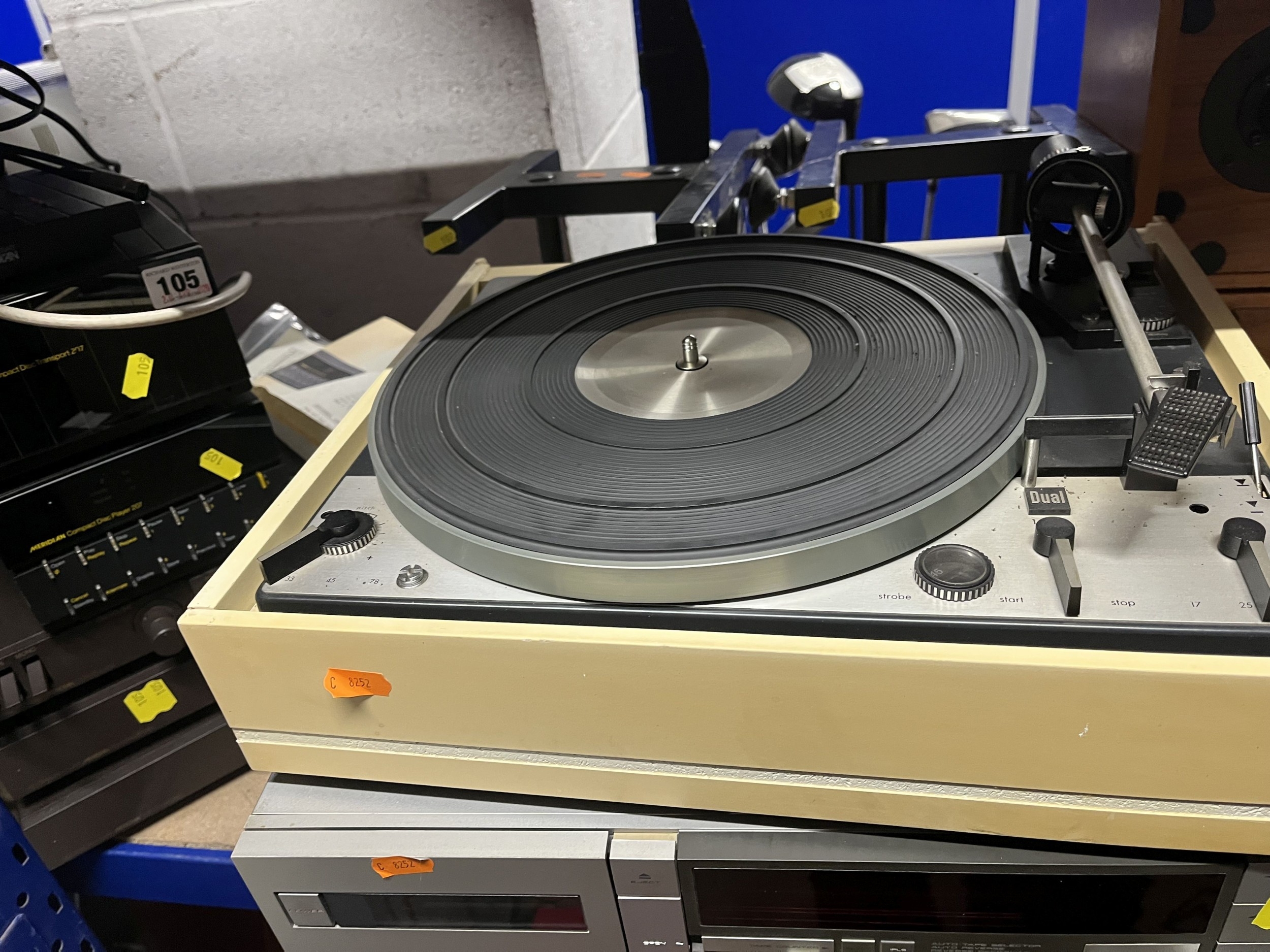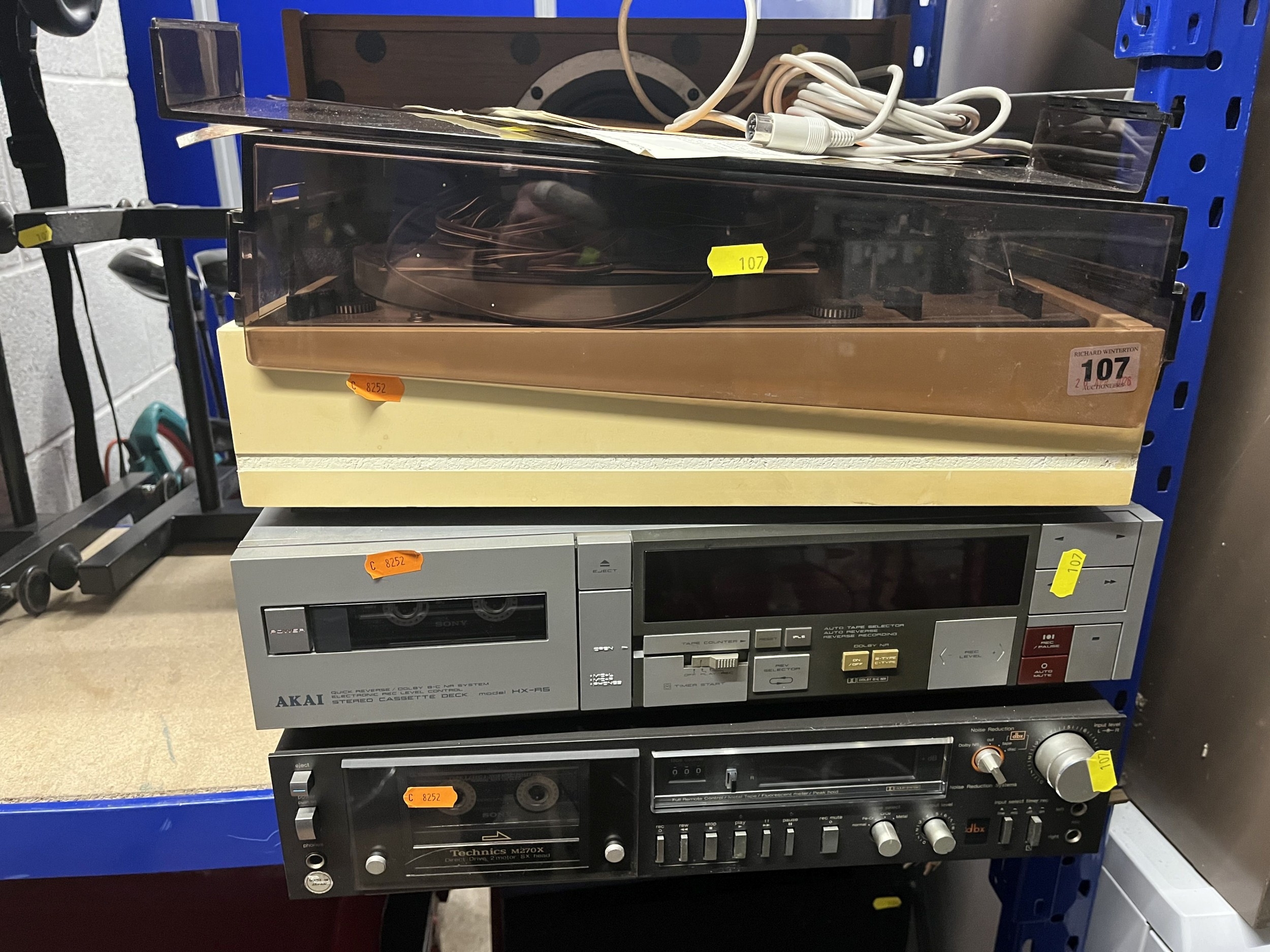 A COLLECTION OF VINTAGE AUDIO EQUIPMENT, comprising a Dual 1229 turntable, a Technics M270X tape player, an Akai HX-RS tape player, a pair of Chartwell PM110 speakers, and a pair of speaker stands. Condition Report: all UNTESTED, turntable lid broken (7)