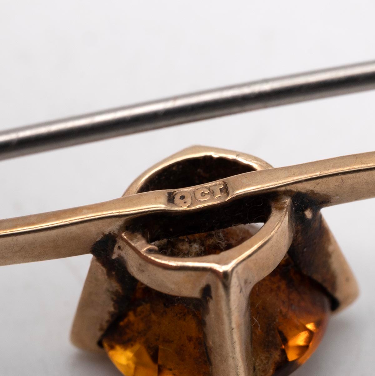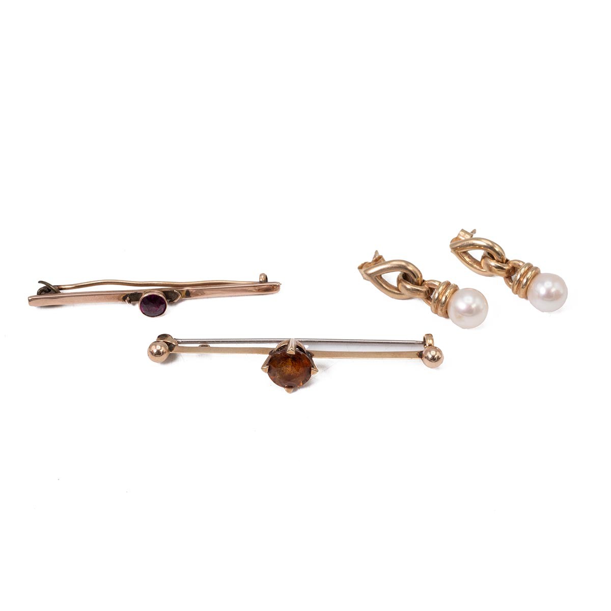 Two 9ct gold gem set bar brooches and a pair of 9ct gold pearl drop earrings, gross weight 9.9 grams.