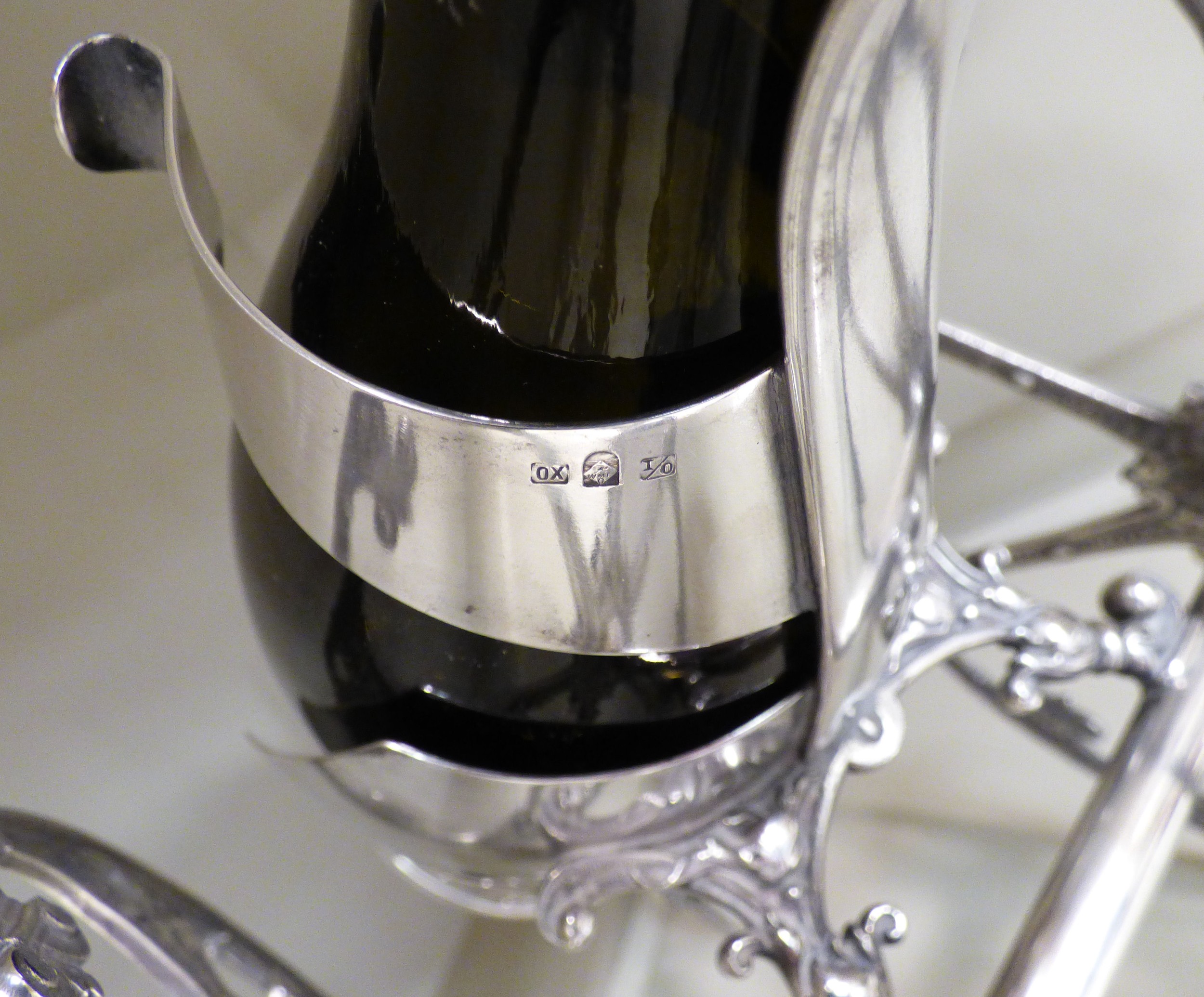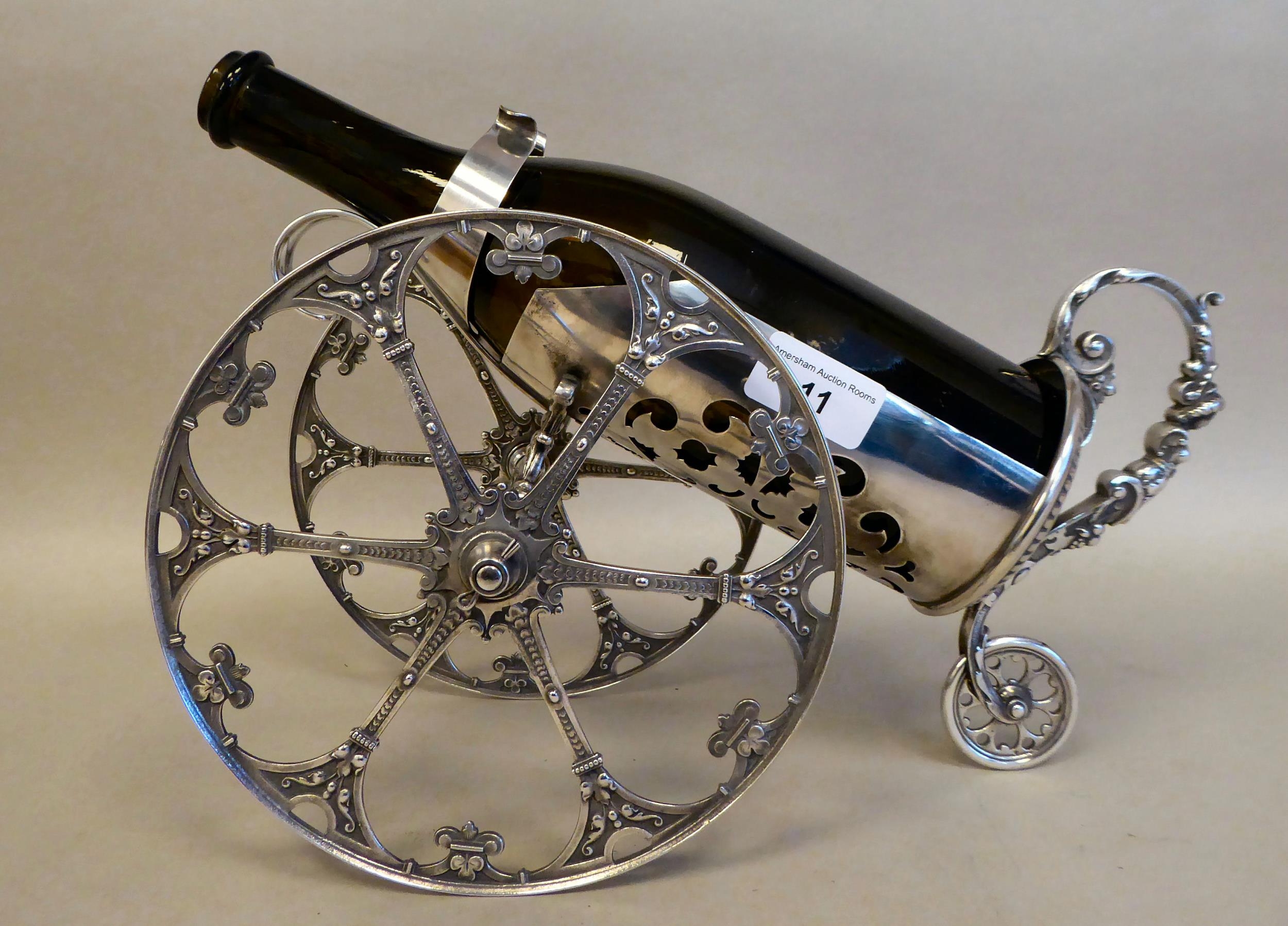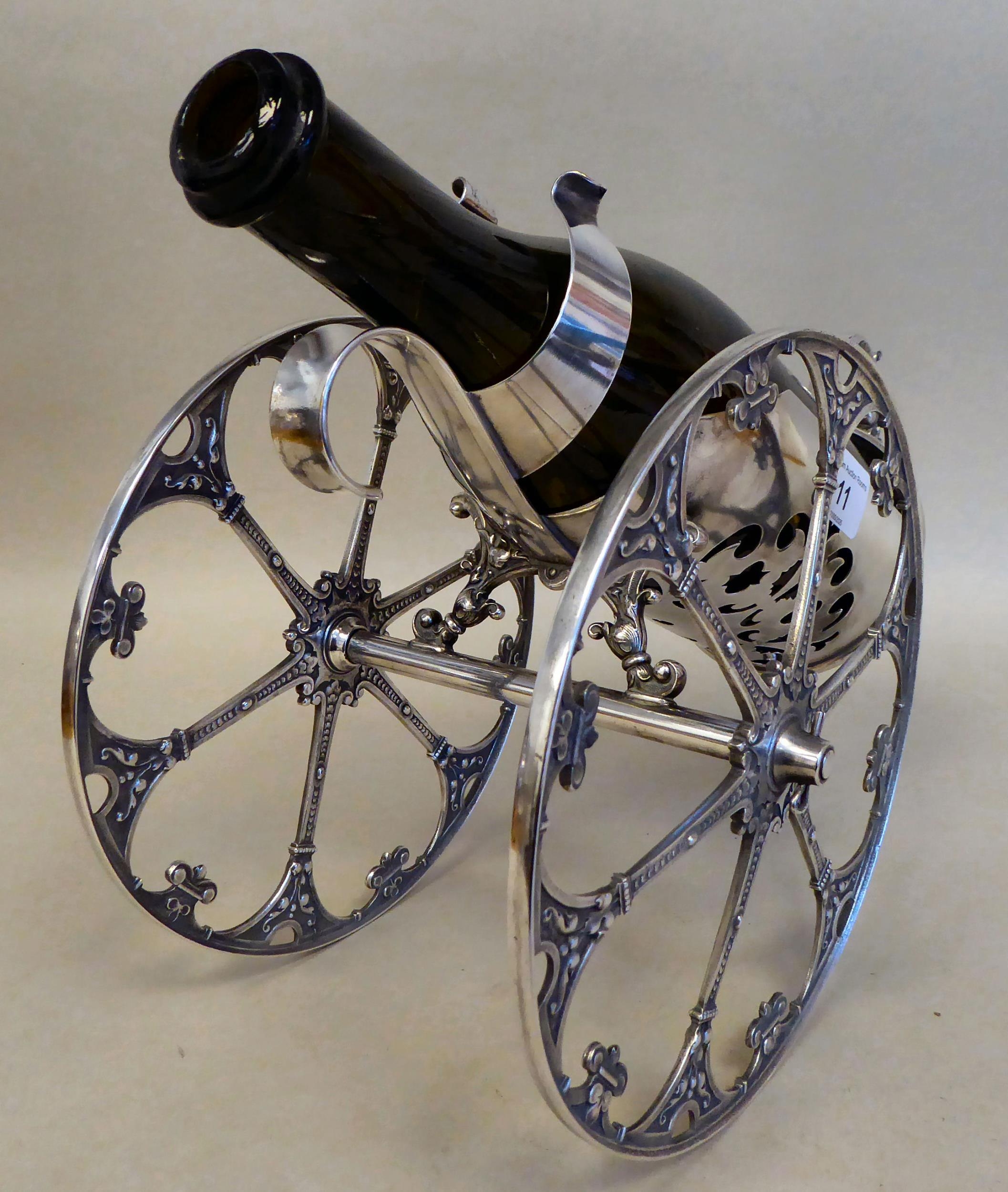 A WMF silver plated wine cannon, on two wheels 7.5"dia