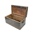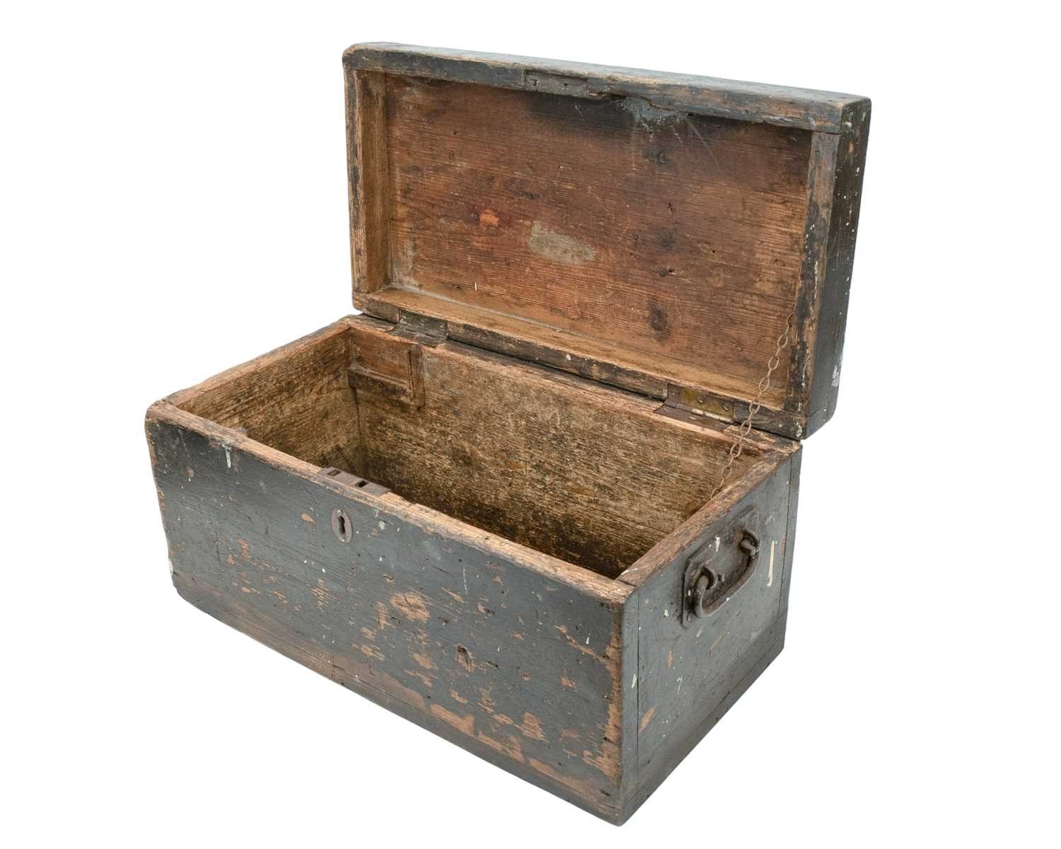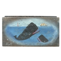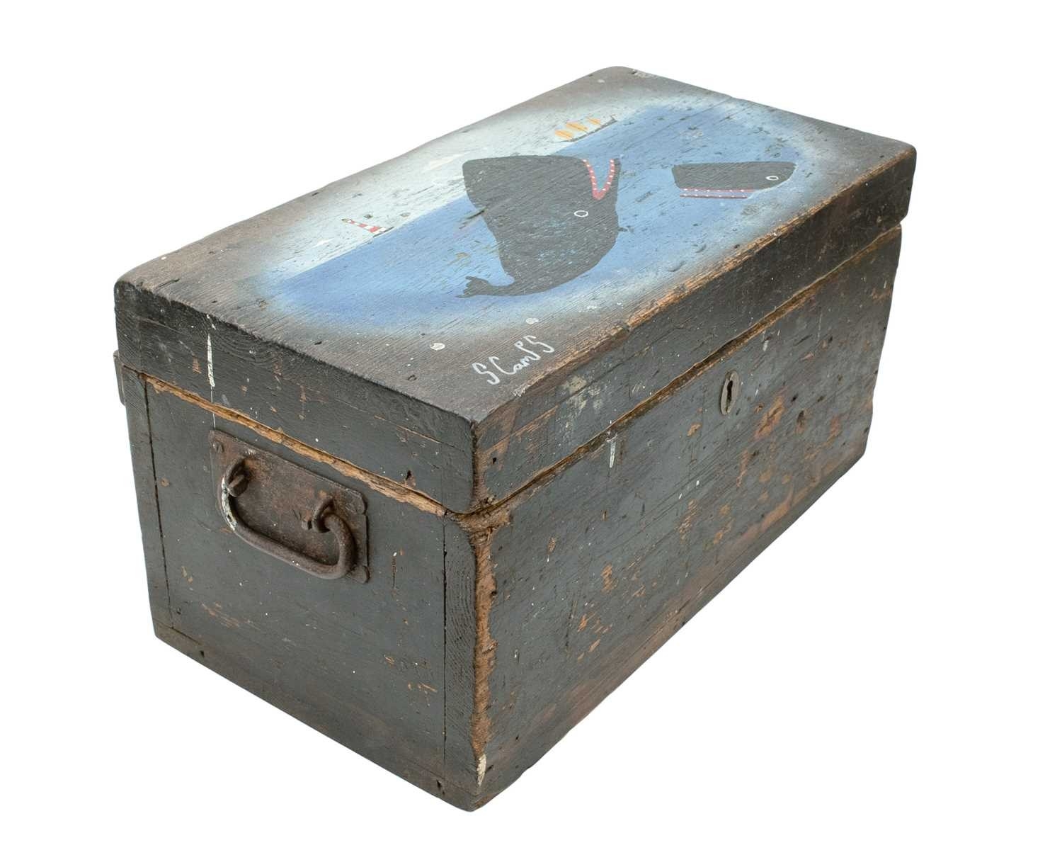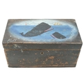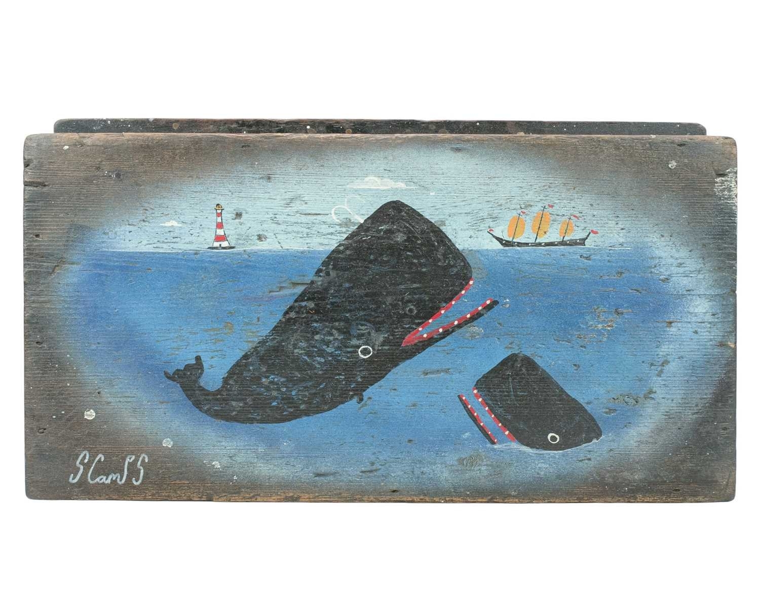 Stephen CAMPS (1957) A small pine chest. Featuring two whales, a ship and a lighthouse to the lid, signed by the artist, with wrought iron carrying handles to both sides, height 26cm, width 50cm, depth 25cm.