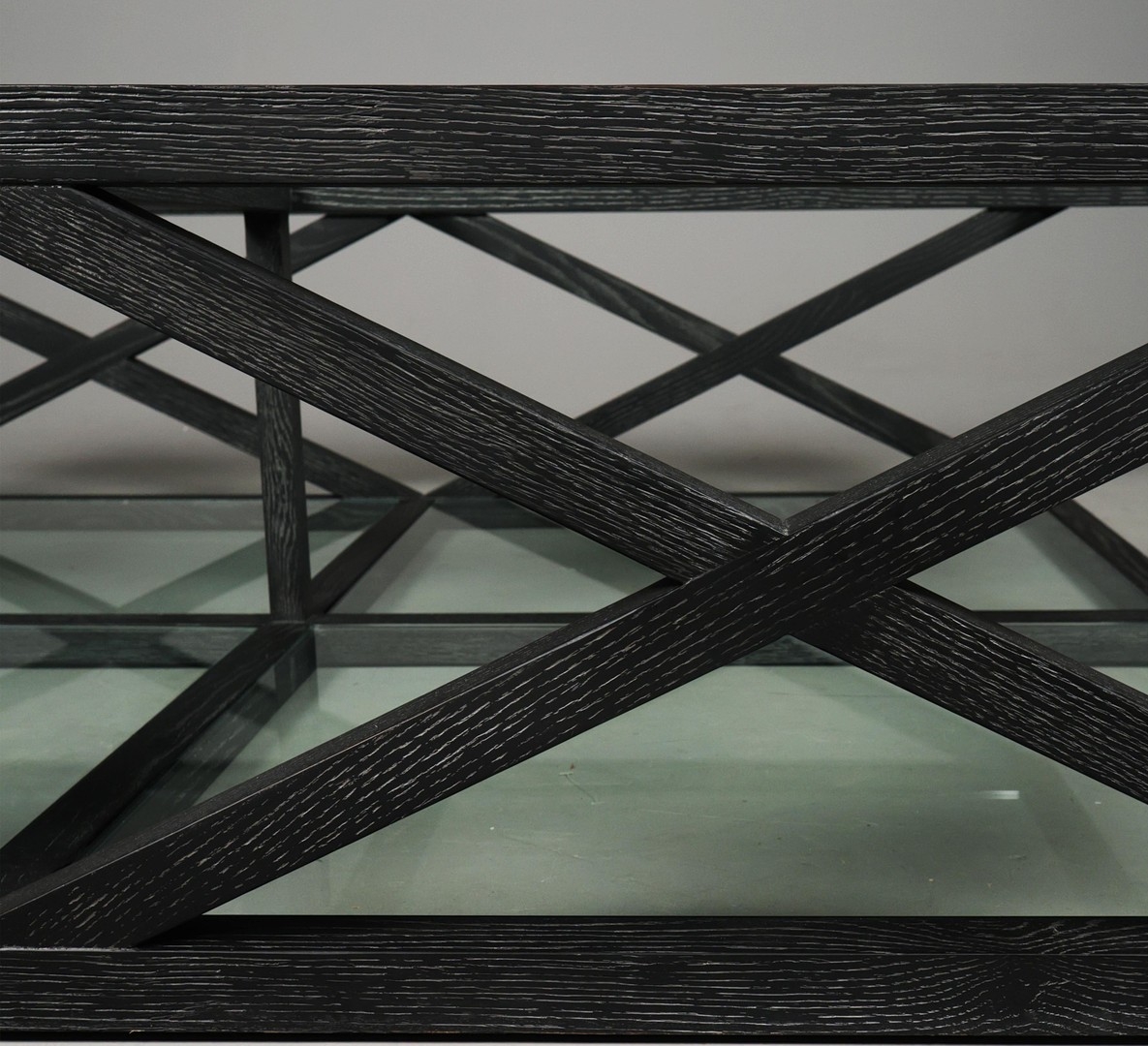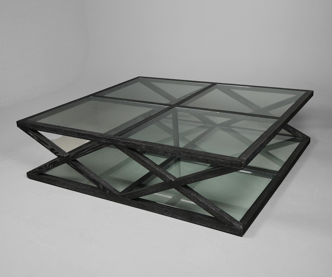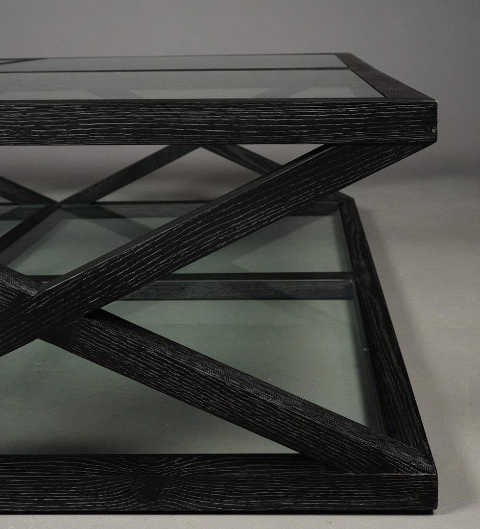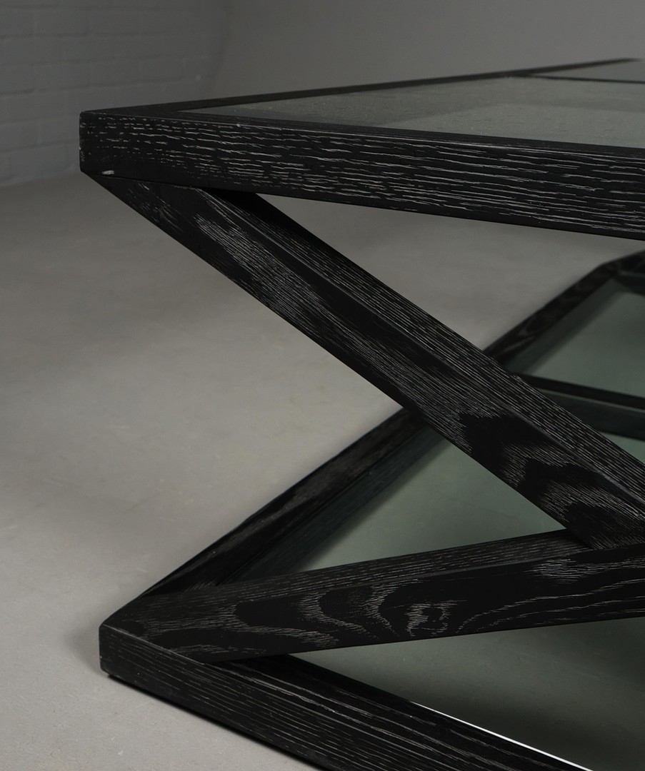 OKA MARYLEBONE COFFEE TABLE. ebonised oak with glass plates, 42cm H x 160cm W x 140cm D.