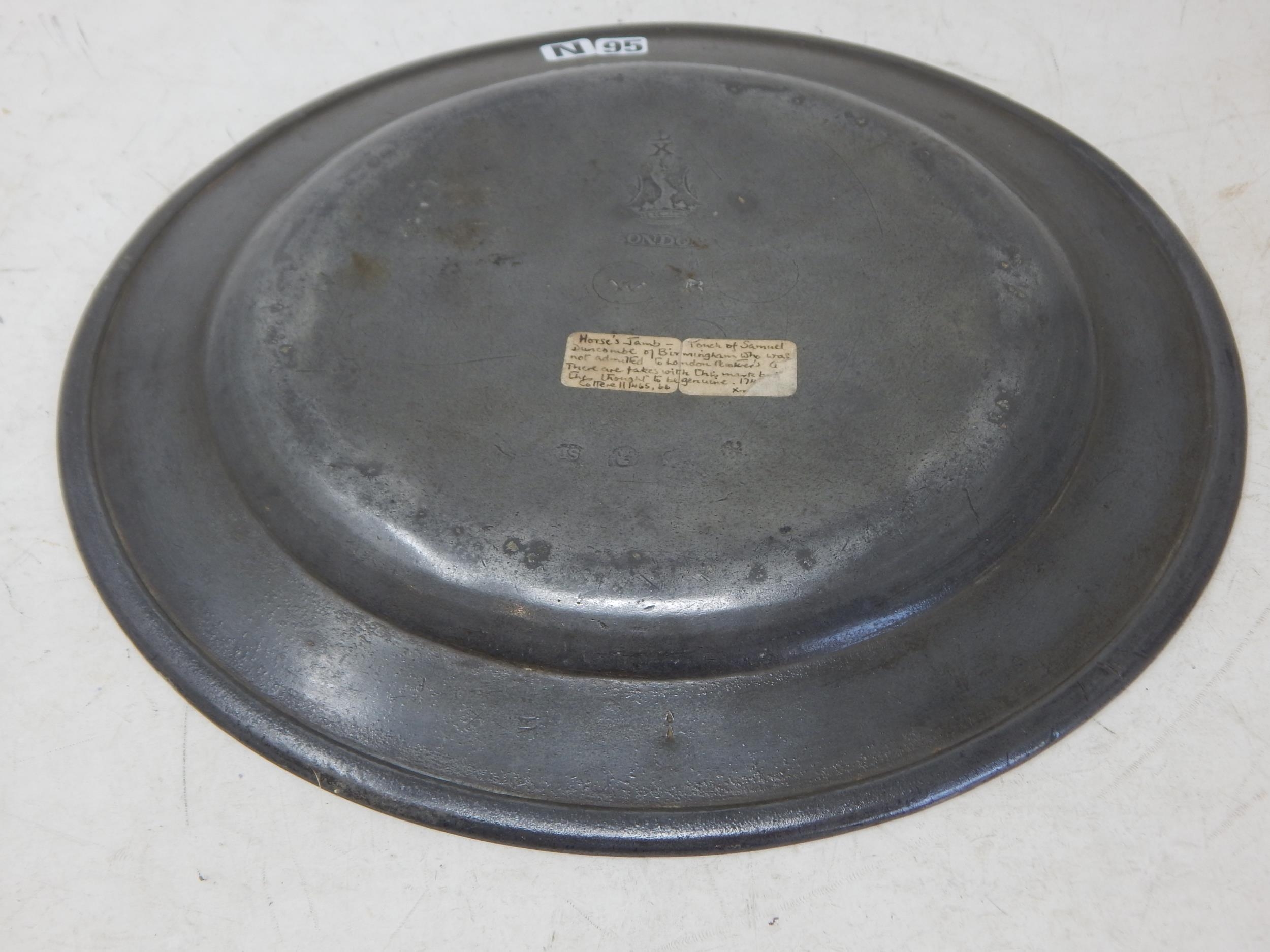 18th Century Pewter Plate c.1750 by Samuel Duncombe: Diameter 23.4cm