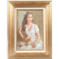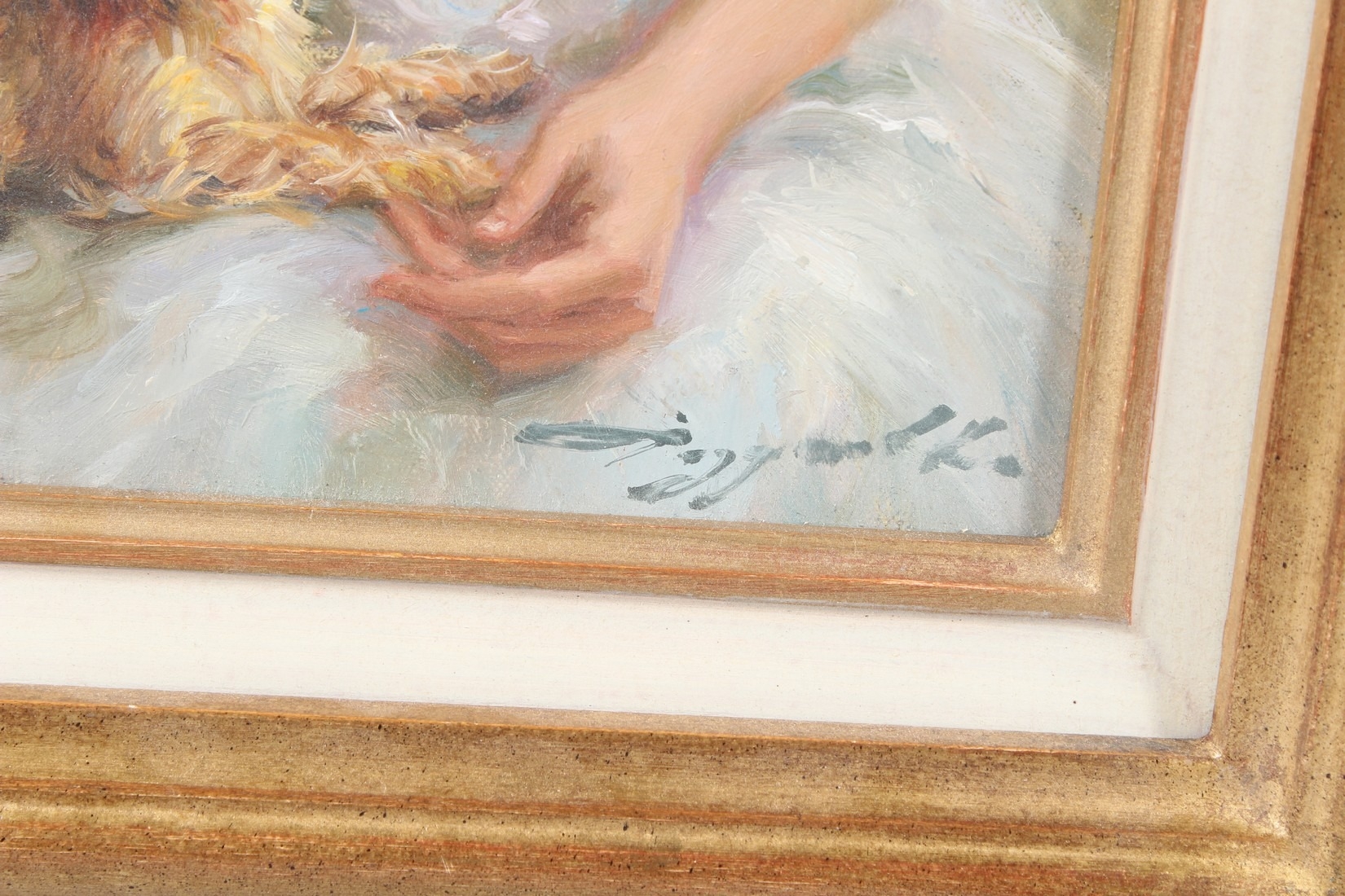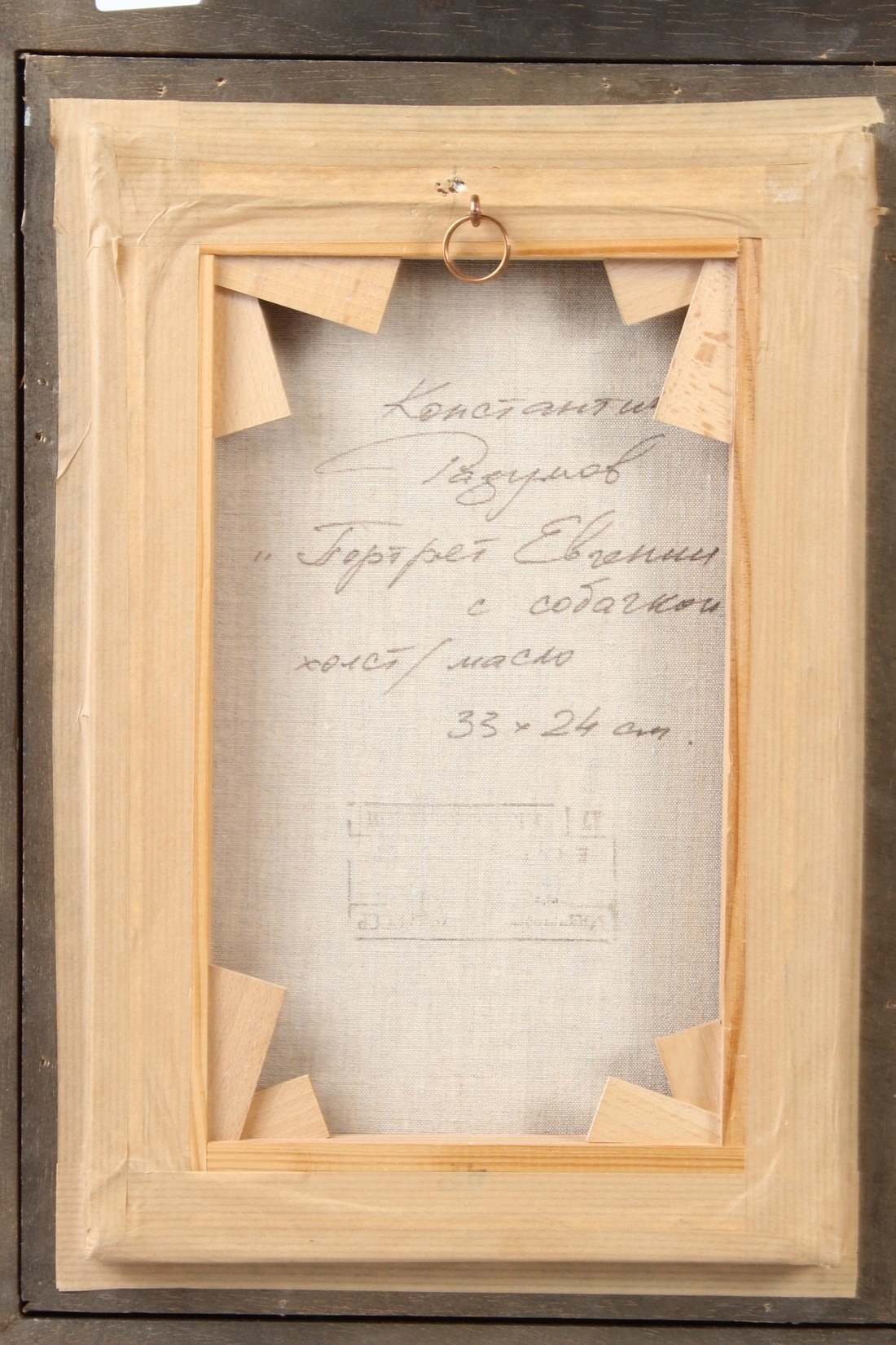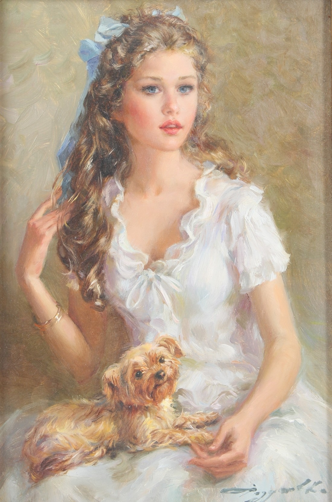 KONSTANTIN RAZUMOV (b.1974 RUSSIAN) Seated girl with lapdog oil on canvas signed Inscribed on the reverse in Cyrillic 31.5 x 20.5cm.