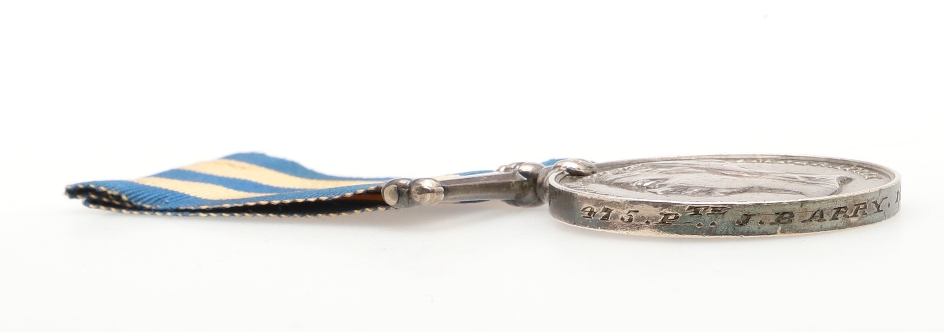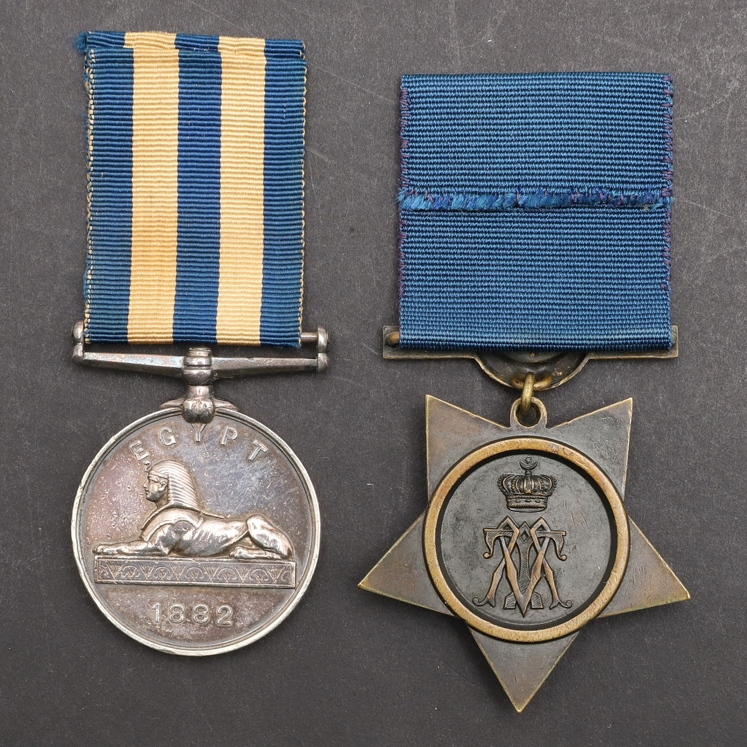 AN EGYPT 1882 PAIR WITHOUT CLASP TO THE MANCHESTER REGIMENT. An Egypt 1882 Medal with dated reverse, without clasp named to 475 Pte J. Barry 1/Manch R. and a Khedives Star, unnamed as issued. On apparently original ribbons. James Barry later transferred to the 2nd Battalion. With copied roll extracts.