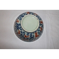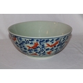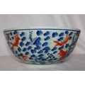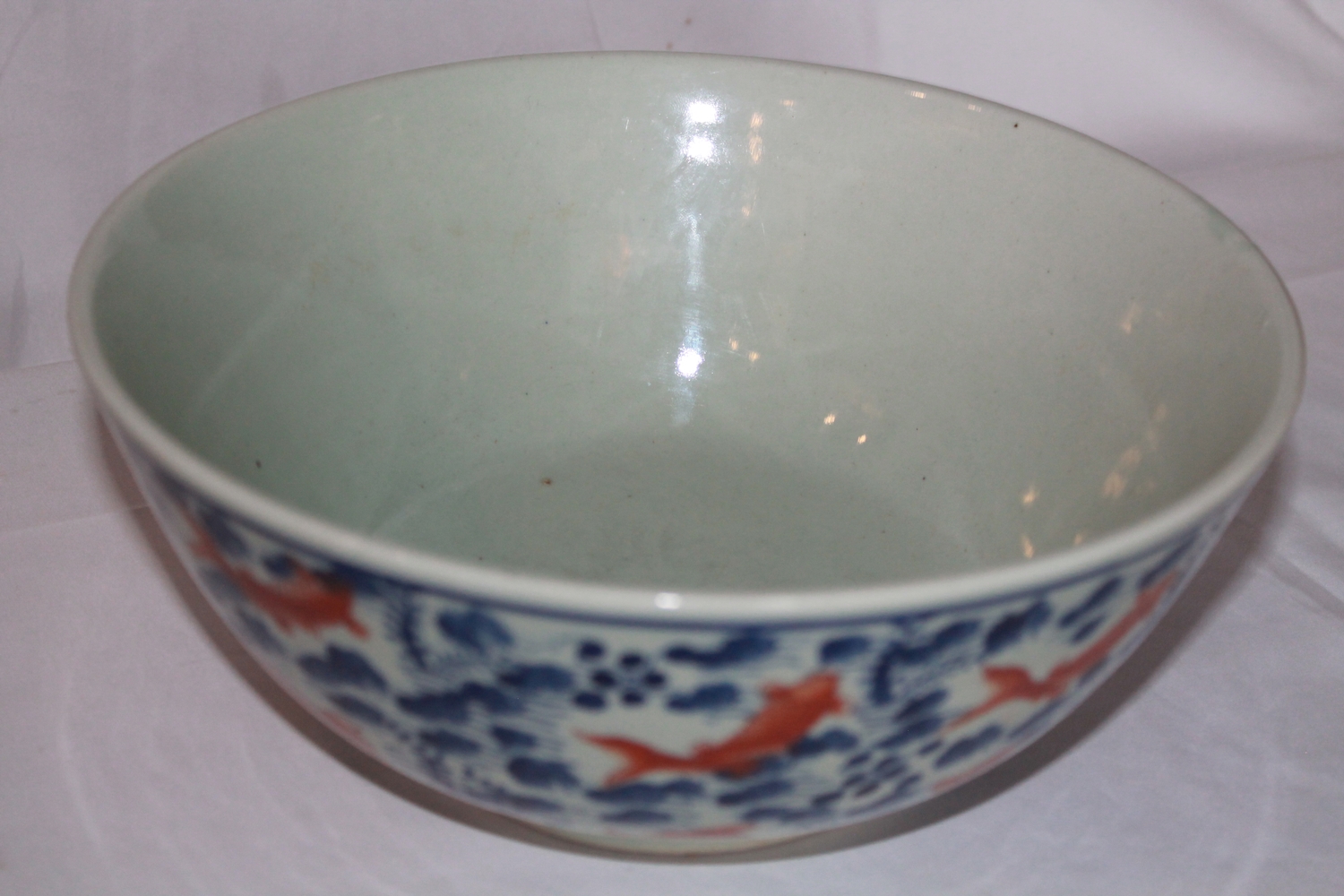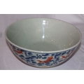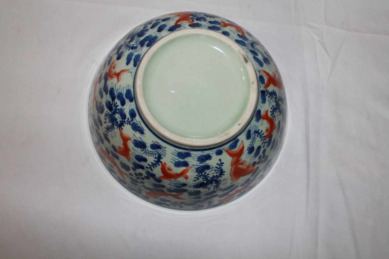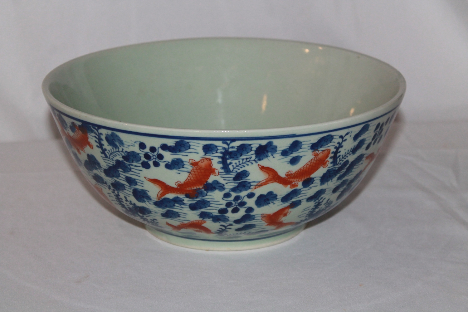 A large Chinese celadon glazed bowl with aquatic plants in blue and iron red overglazed carp swimming amongst them.