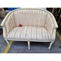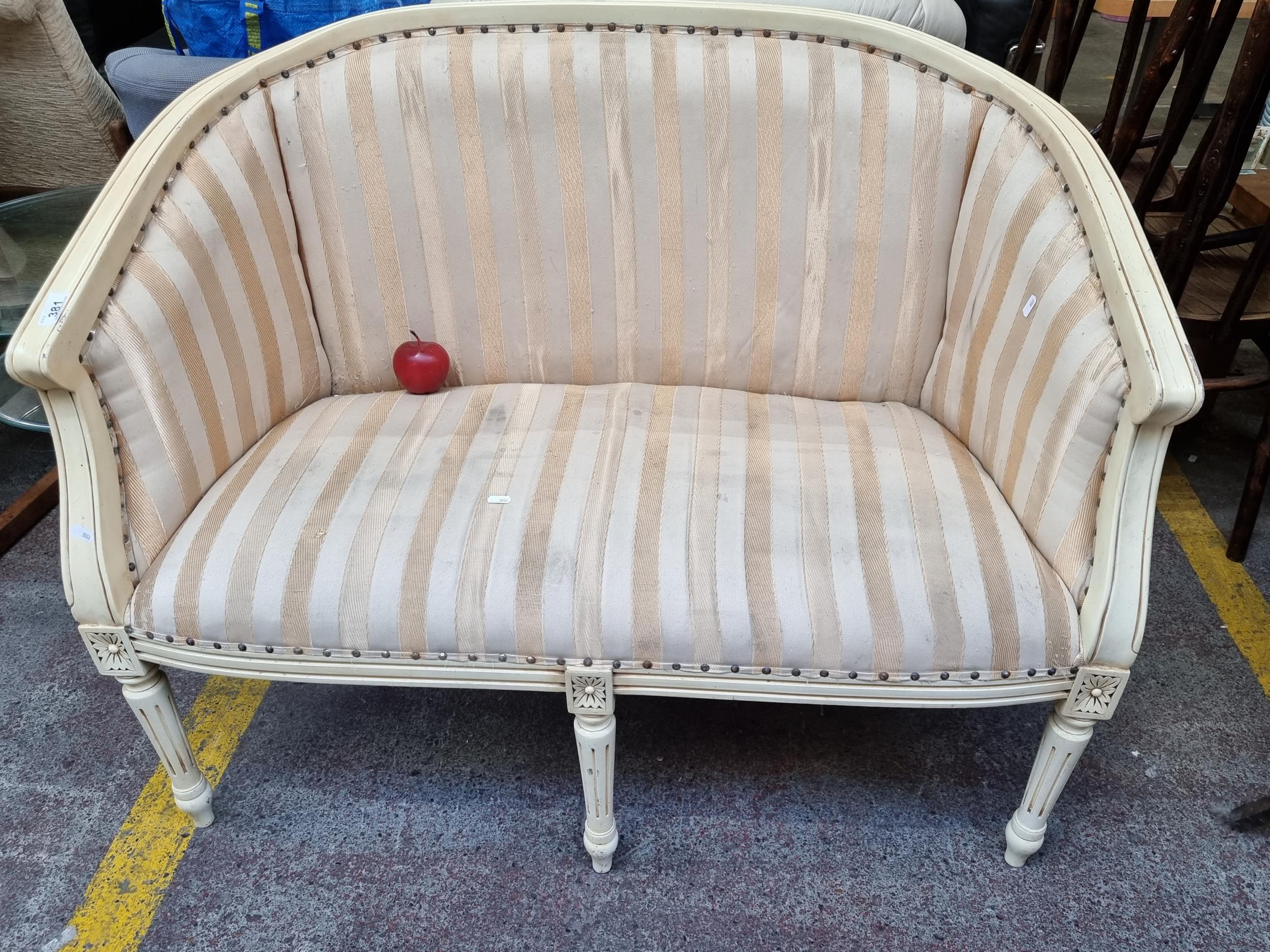 A lovely vintage Louix XVI style two seater sofa with a wood frame and lovely carved ornament, upholstered in a cream striped damask with brass stud detailing.