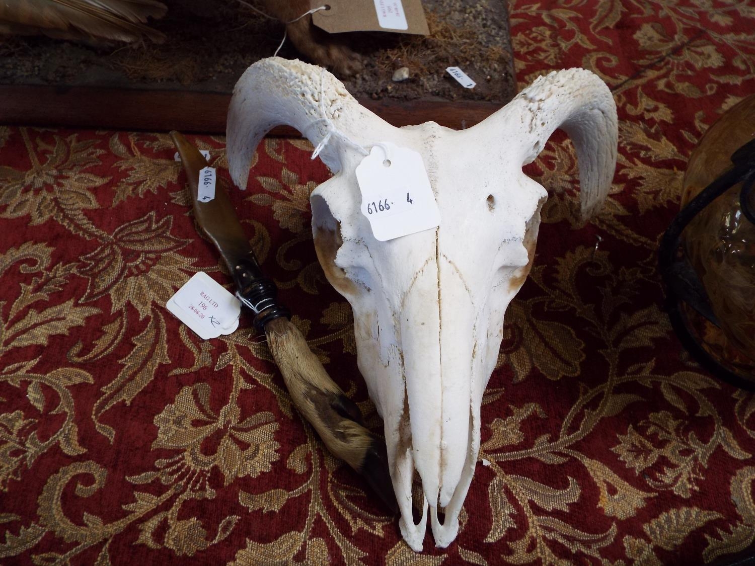 A mountain goat skull and a horn and an animal foot paperknife