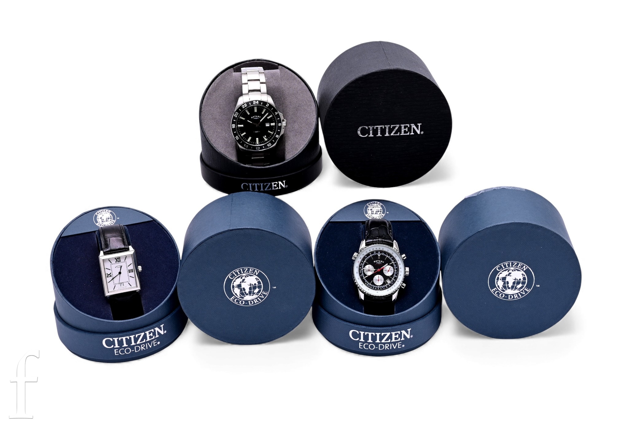Three Rotary stainless steel cased wristwatches with quartz movements to include a 42mm GMT model on stainless steel bracelet with deployment clasp, a 41mm pilot's style chronograph on black leather strap and a dress watch in a 28mm rectangular case on black leather strap, all without papers and each contained within a Citizen box. (3)