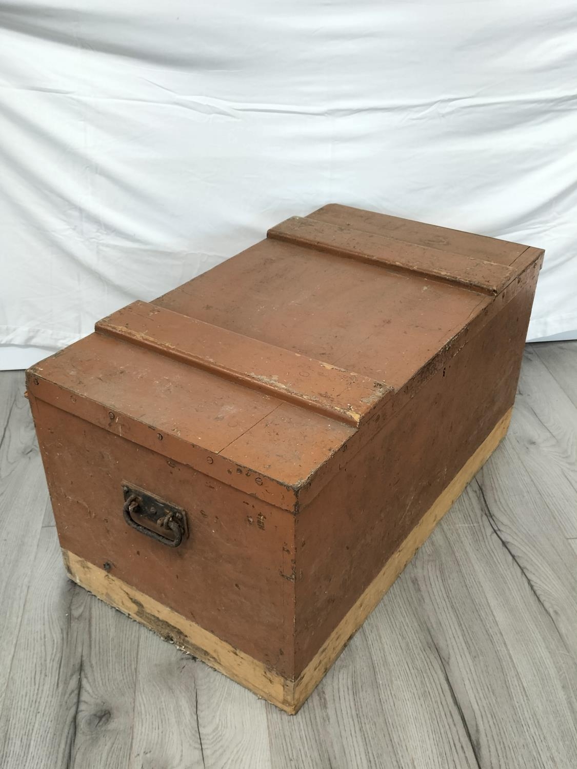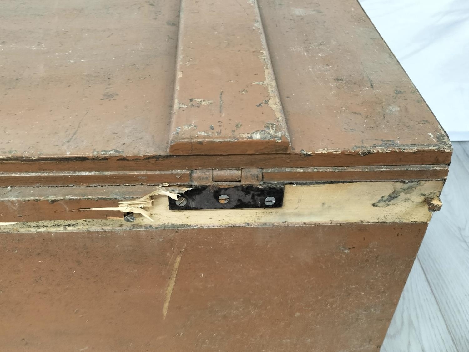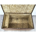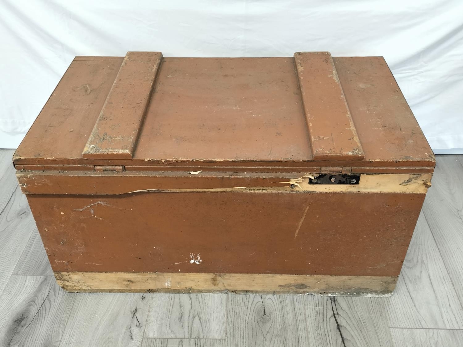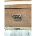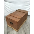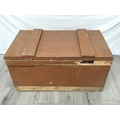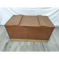 Wooden Hinged Lid Trunk with Metal Side Handles. 43cm High, 85cm x 49cm. Some Damage to Back. Collection Only.