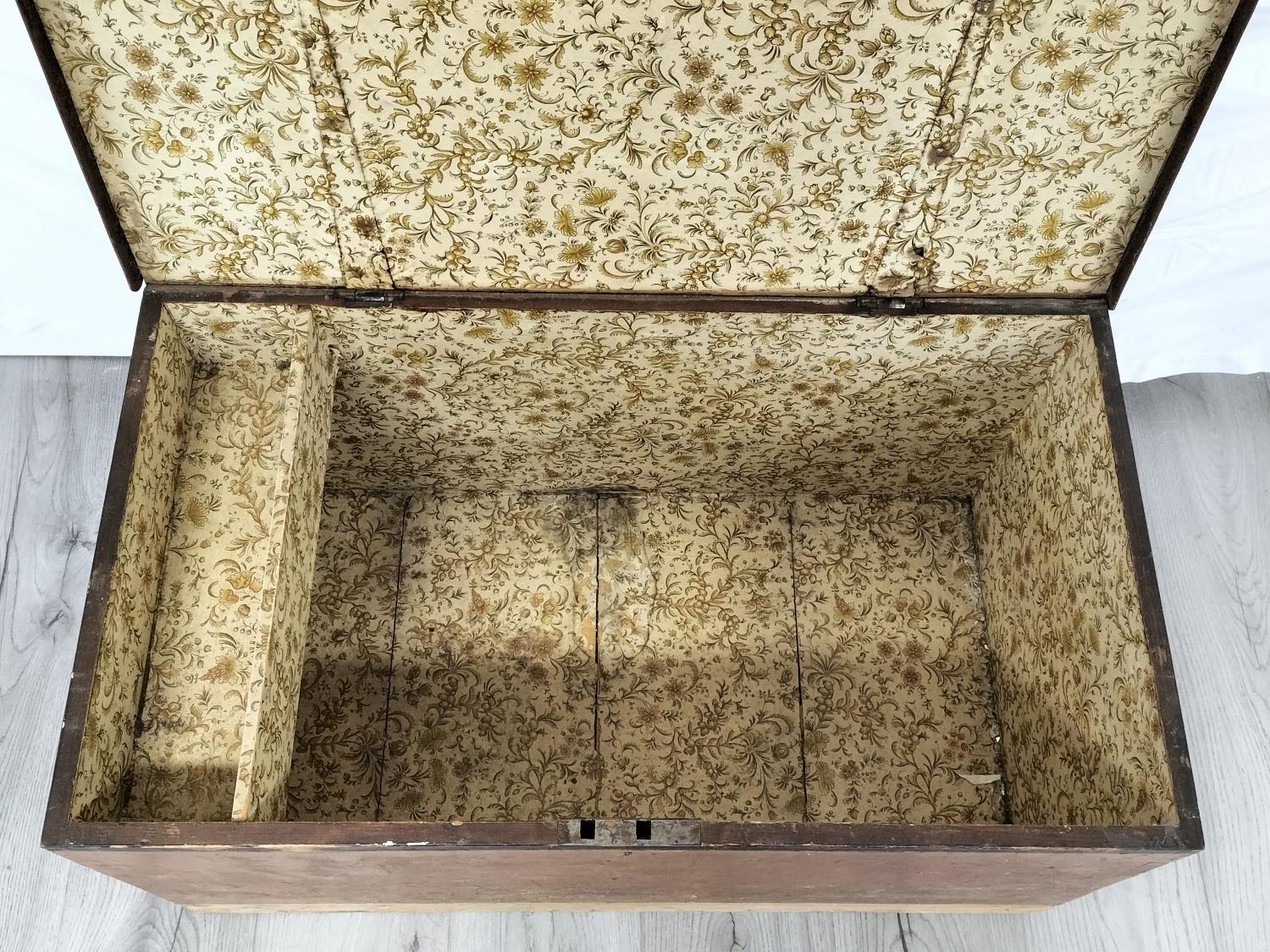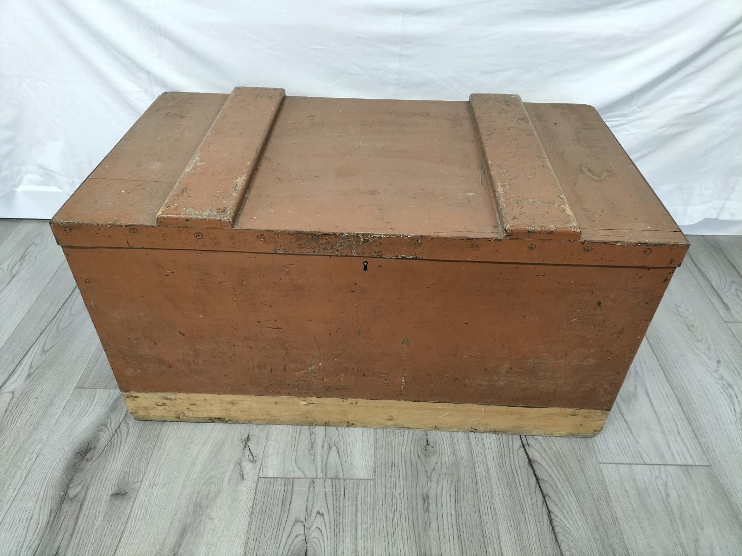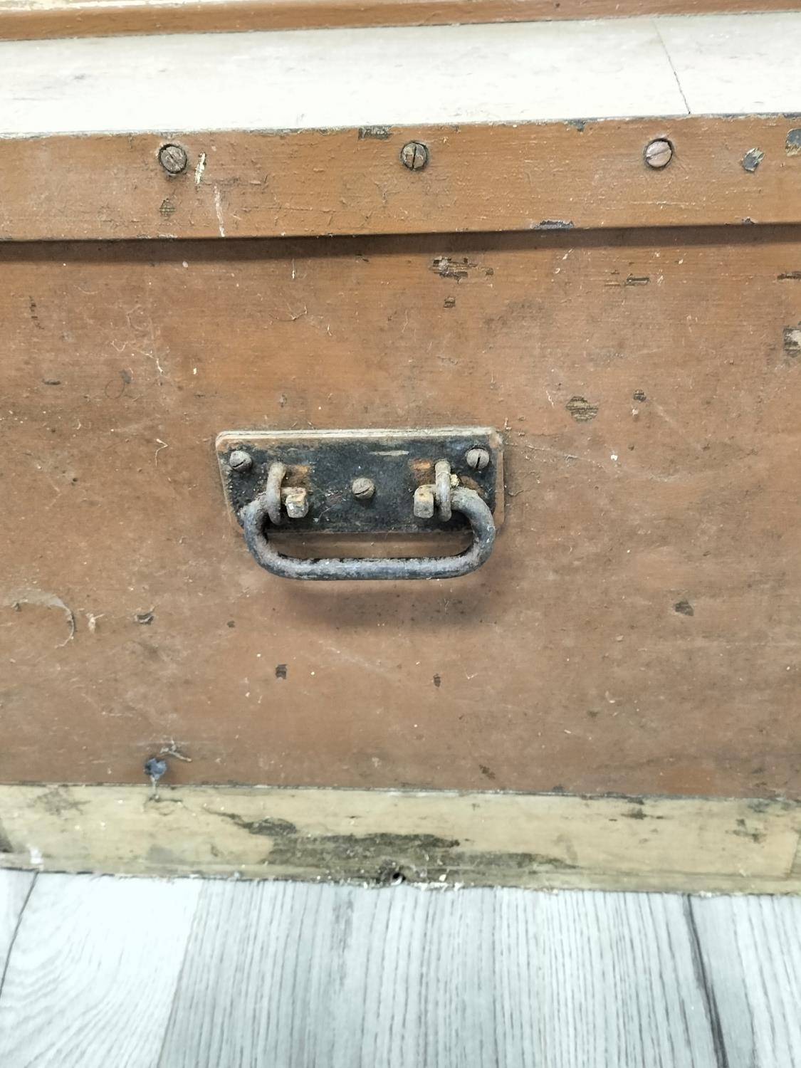 Wooden Hinged Lid Trunk with Metal Side Handles. 43cm High, 85cm x 49cm. Some Damage to Back. Collection Only.