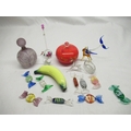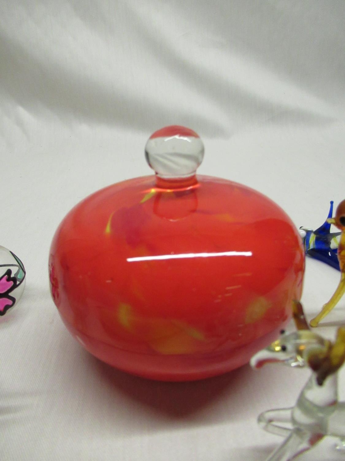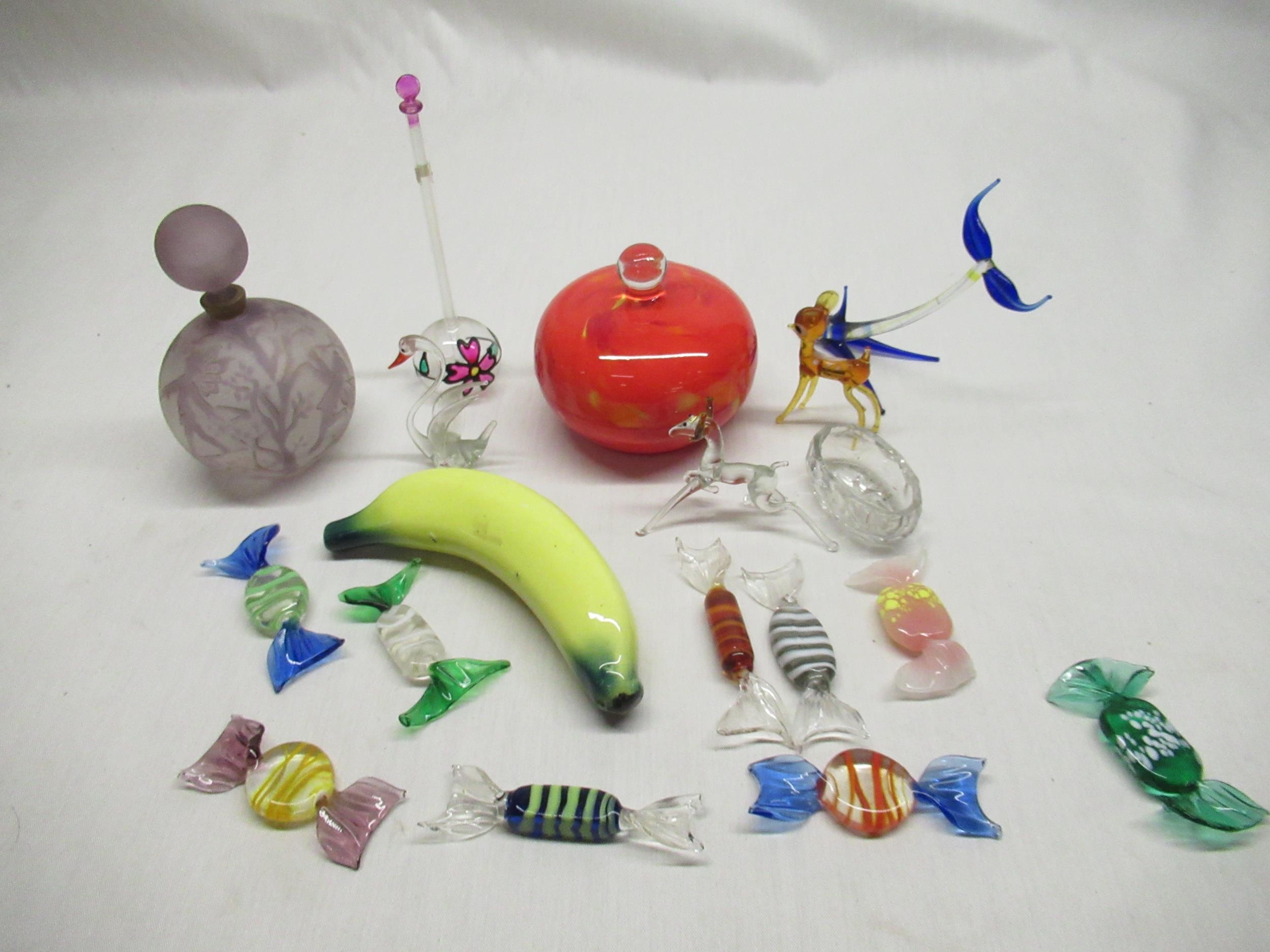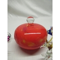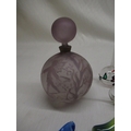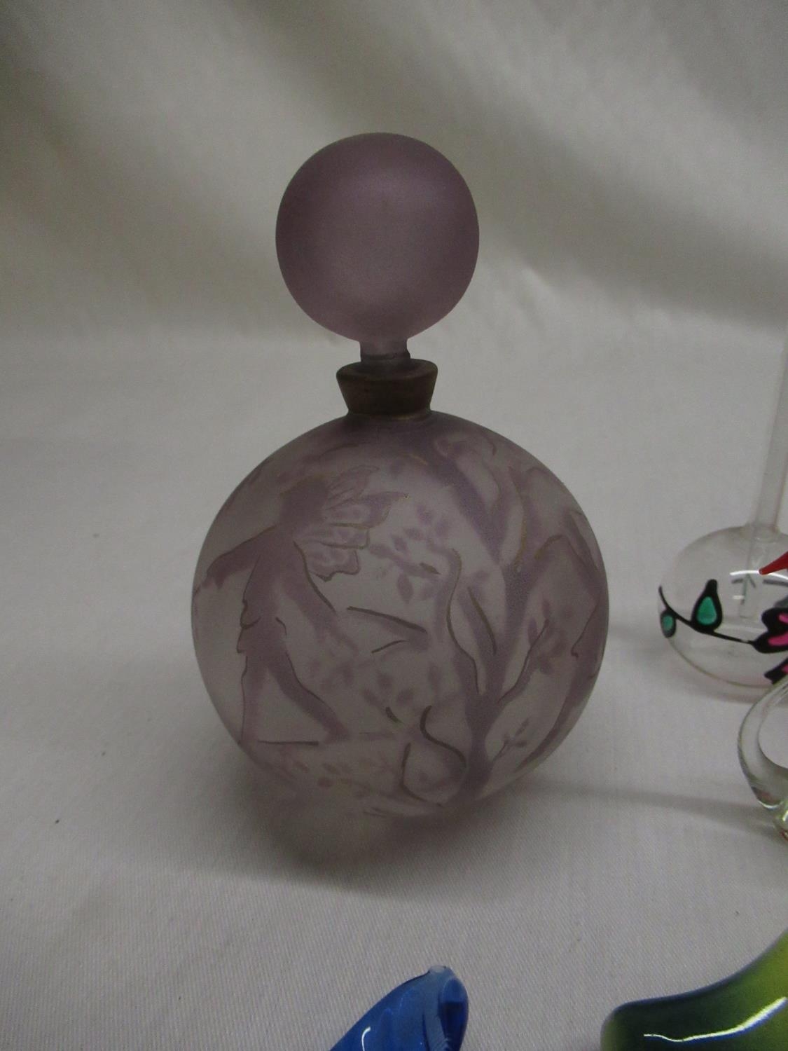 C20th JBD frosted glass perfume bottle, overall lilac tint decorated with flower fairies and highlighted in gilt, Murano glass sweets, C20th Murano style dressing table jar, mottled flame orange ground (A/F) and other decorative glassware