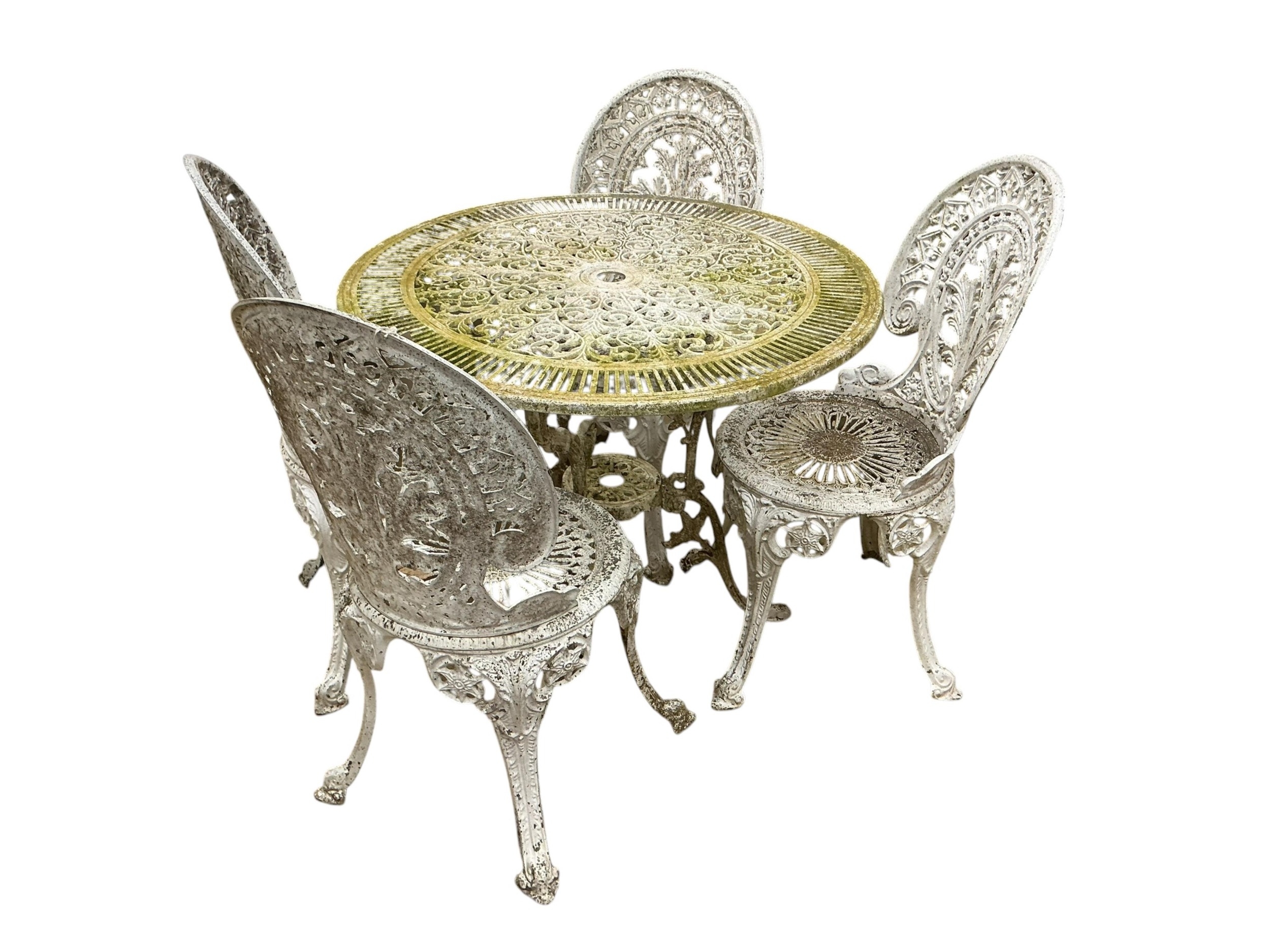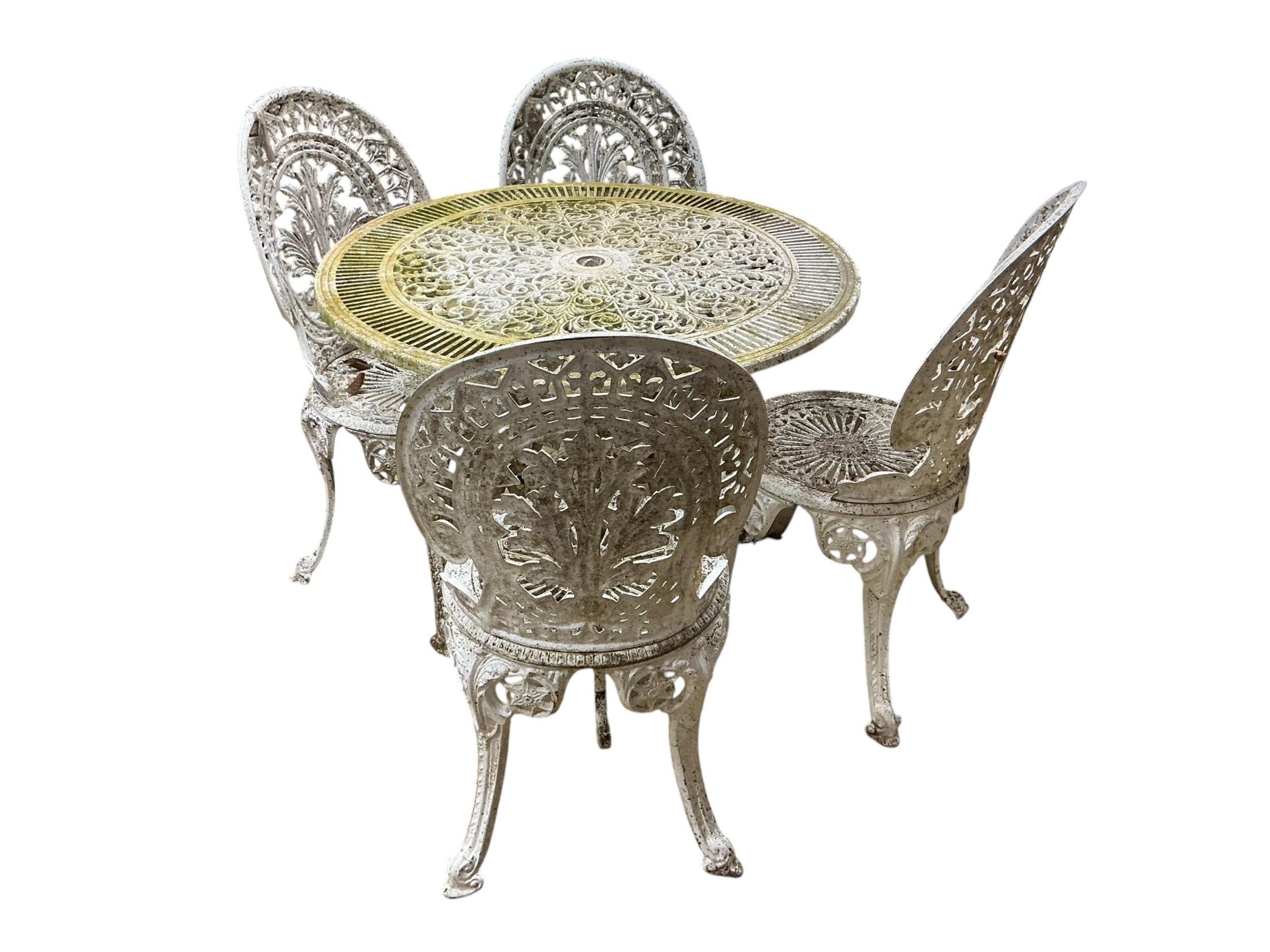 A Victorian style circular aluminium garden table, diameter 80cm, height 70cm and four chairs
