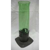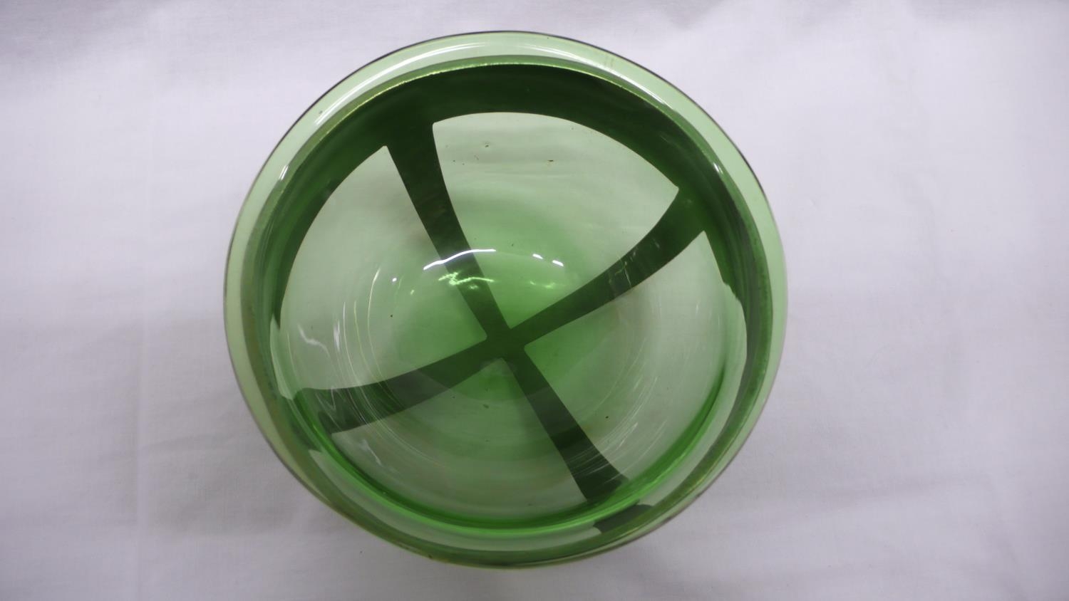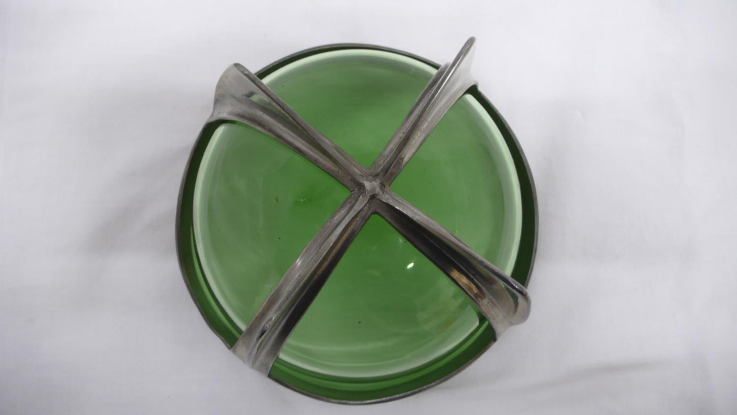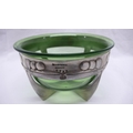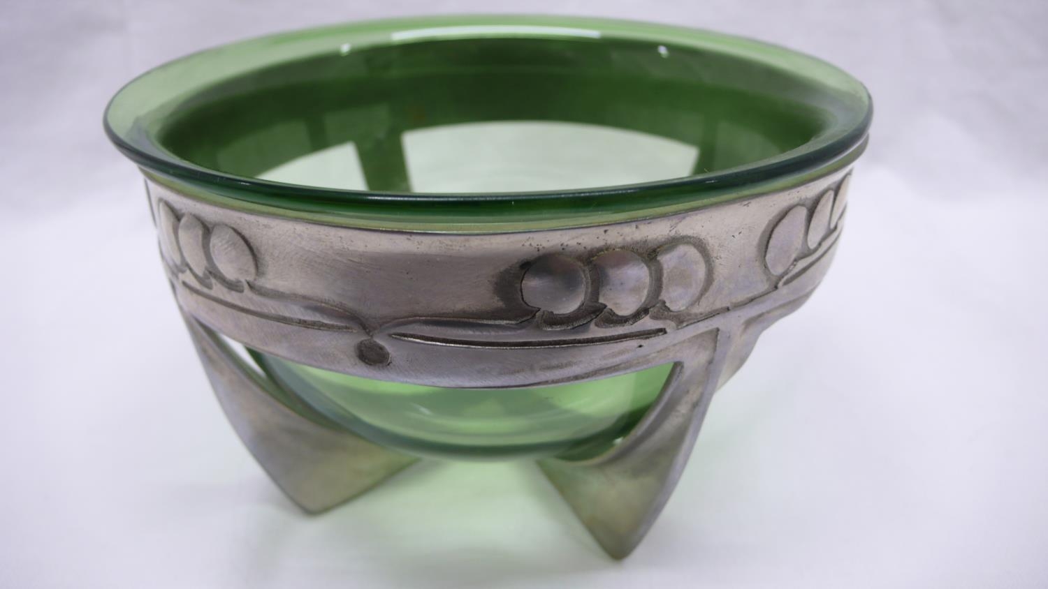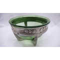 Archibald Knox for Liberty & Co. Tudric Pewter and green glass bowl (Whitefriars) on four cross feet, honesty decoration to border, No. 0313, circa 1902-1905, diam. 13.5 cms