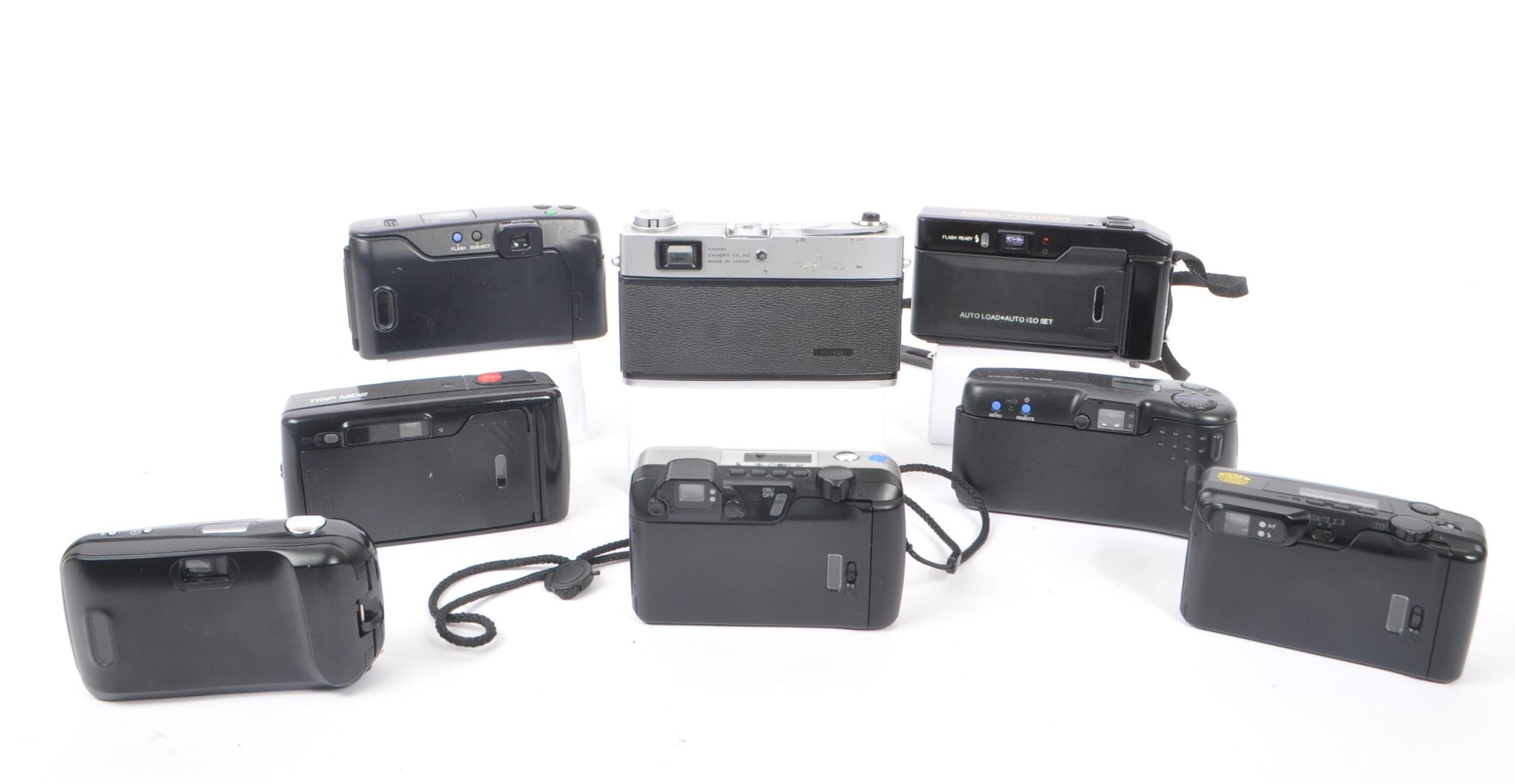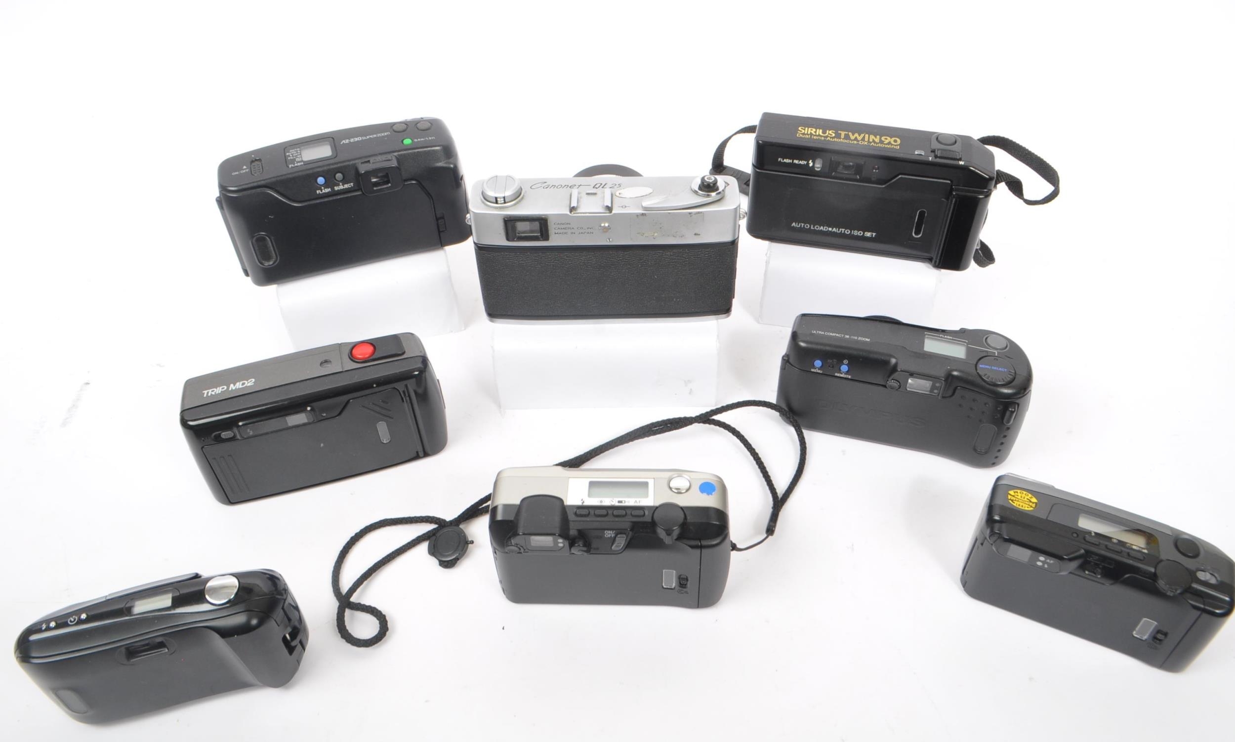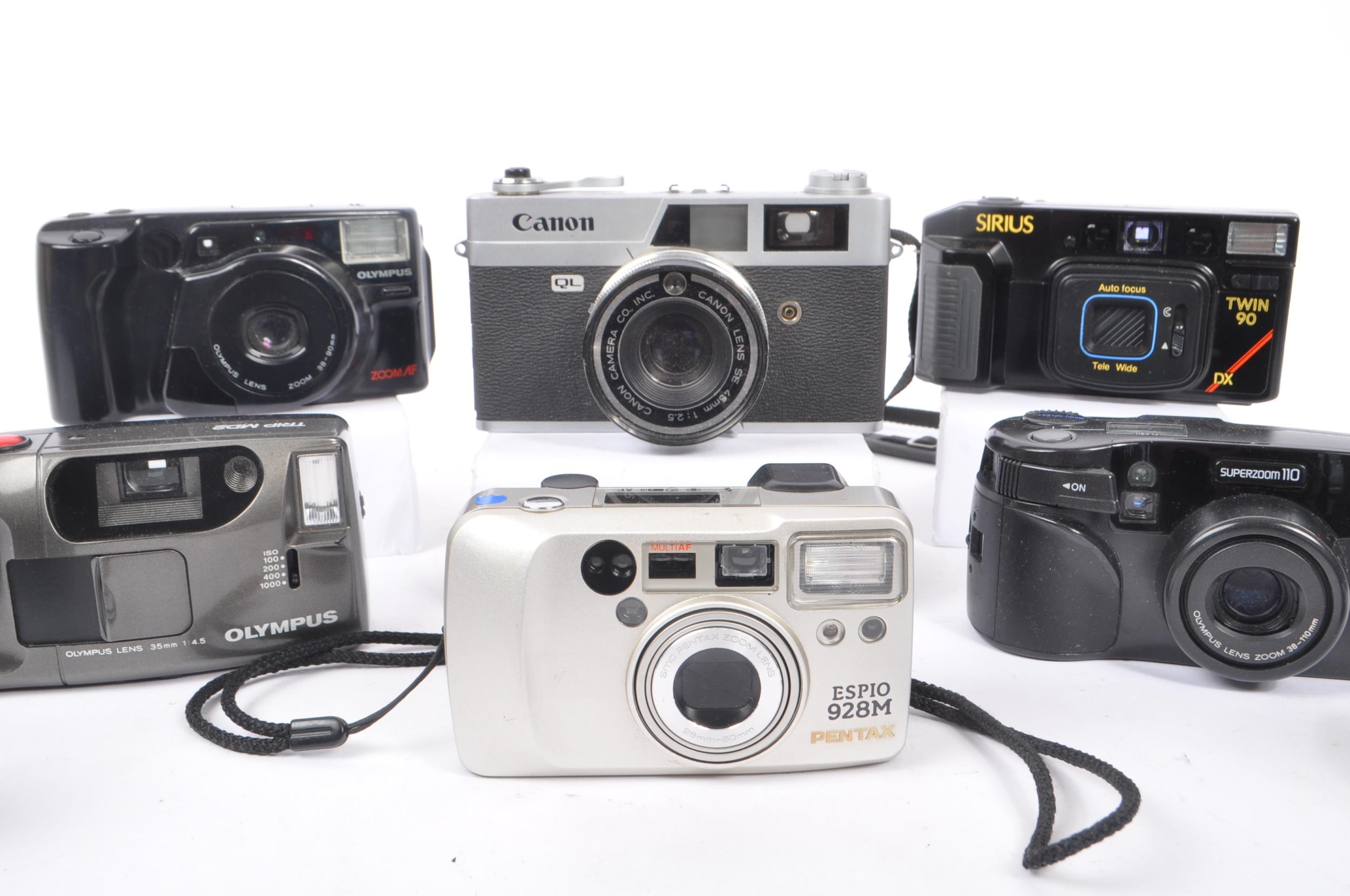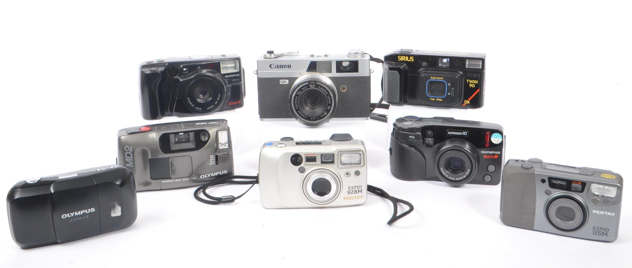 A collection of late 20th century 35mm and other compact film point and shoot cameras. The collection to include an Olympus MJU 1 camera, alongside a Canon Canonet QL 25, and Pentax Espio 115M, and Espio 928M cameras. To include also cameras from Olympus, and Sirius also.