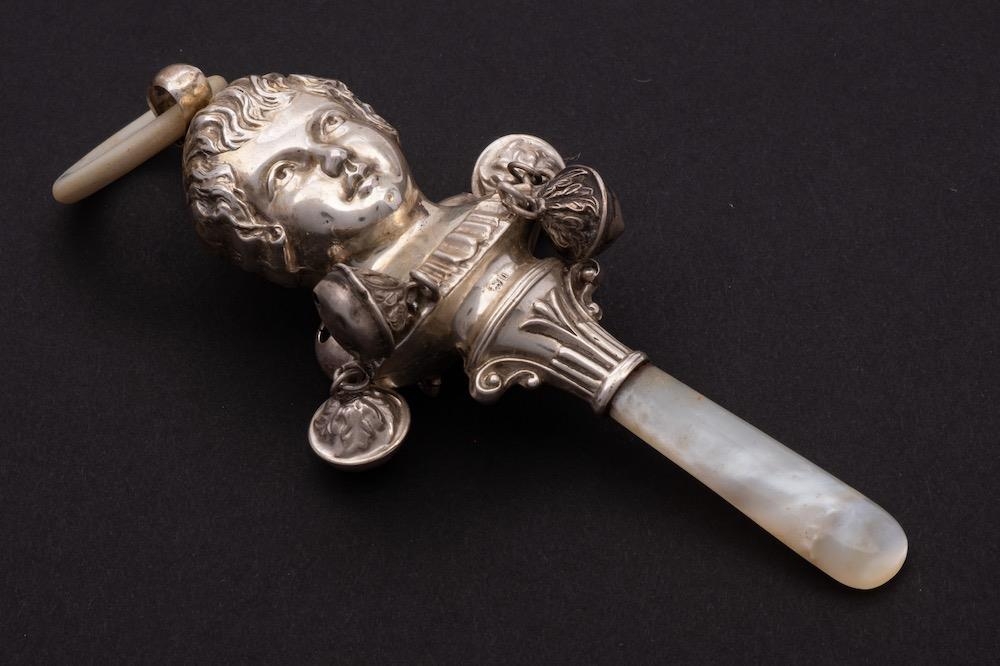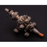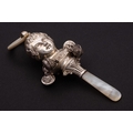 An Edward VII silver child's novelty rattle, maker Crisford & Norris Ltd, Birmingham, 1908: in the form of a double headed child, with six bell suspensions, with mother-of-pearl loop suspension and teether, 13cm long.