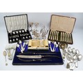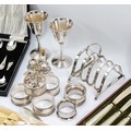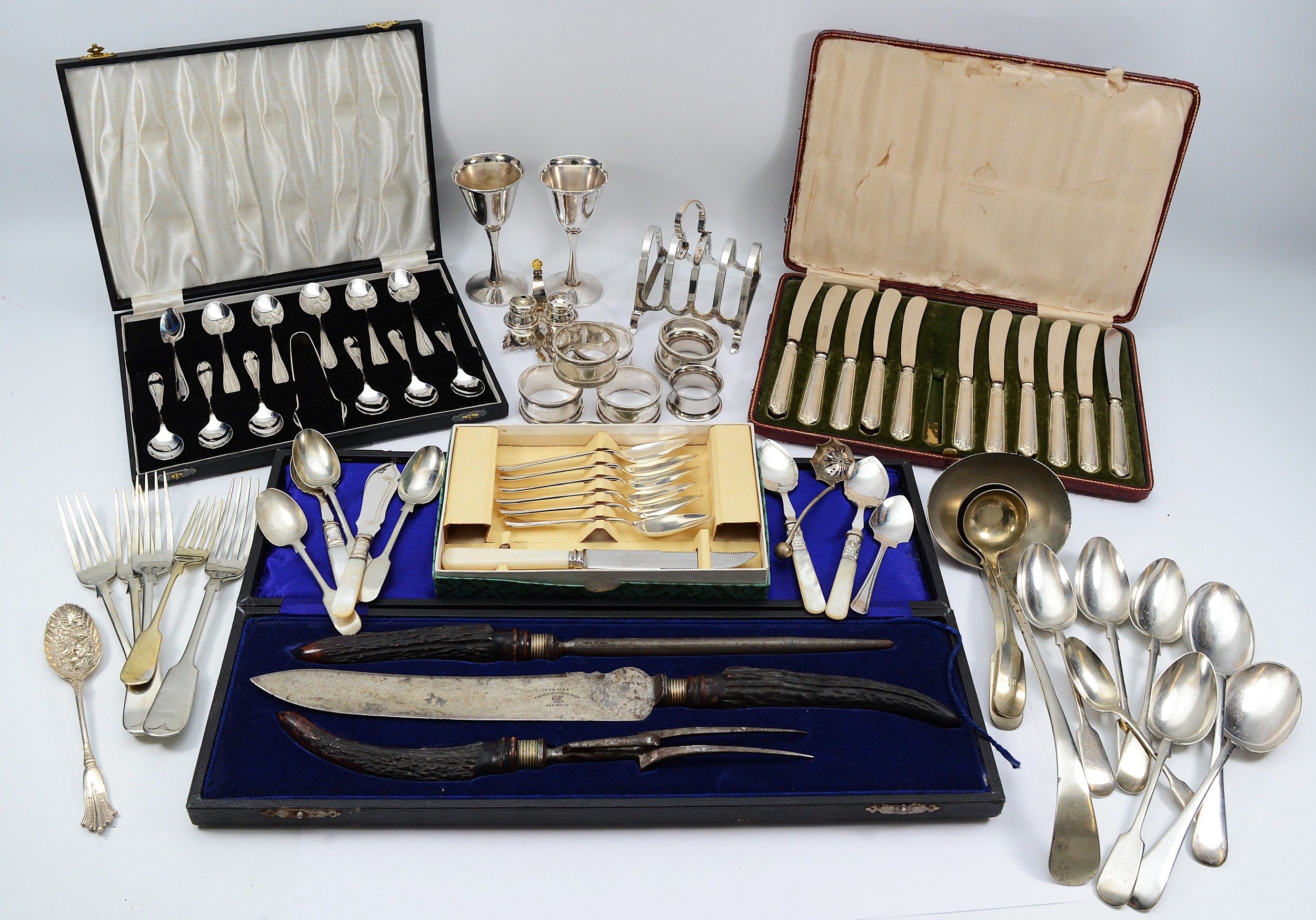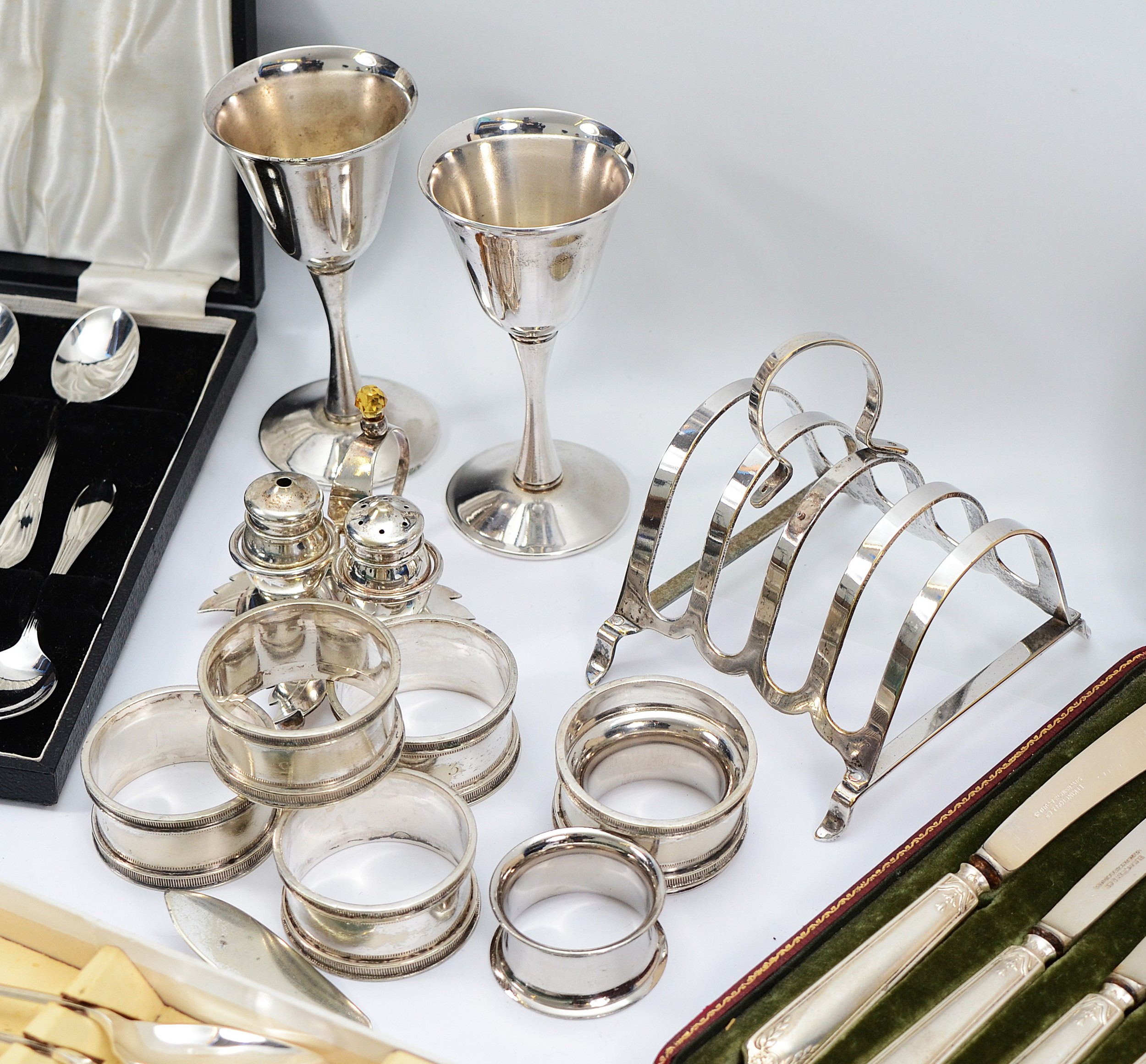 Eleven matching silver handled butter knives, Birmingham 1912, together with two Italian silver plated goblets, a cased set of twelve teaspoons with matching sugar tongs, a plated embossed berry spoon, and other plated cutlery and wares.