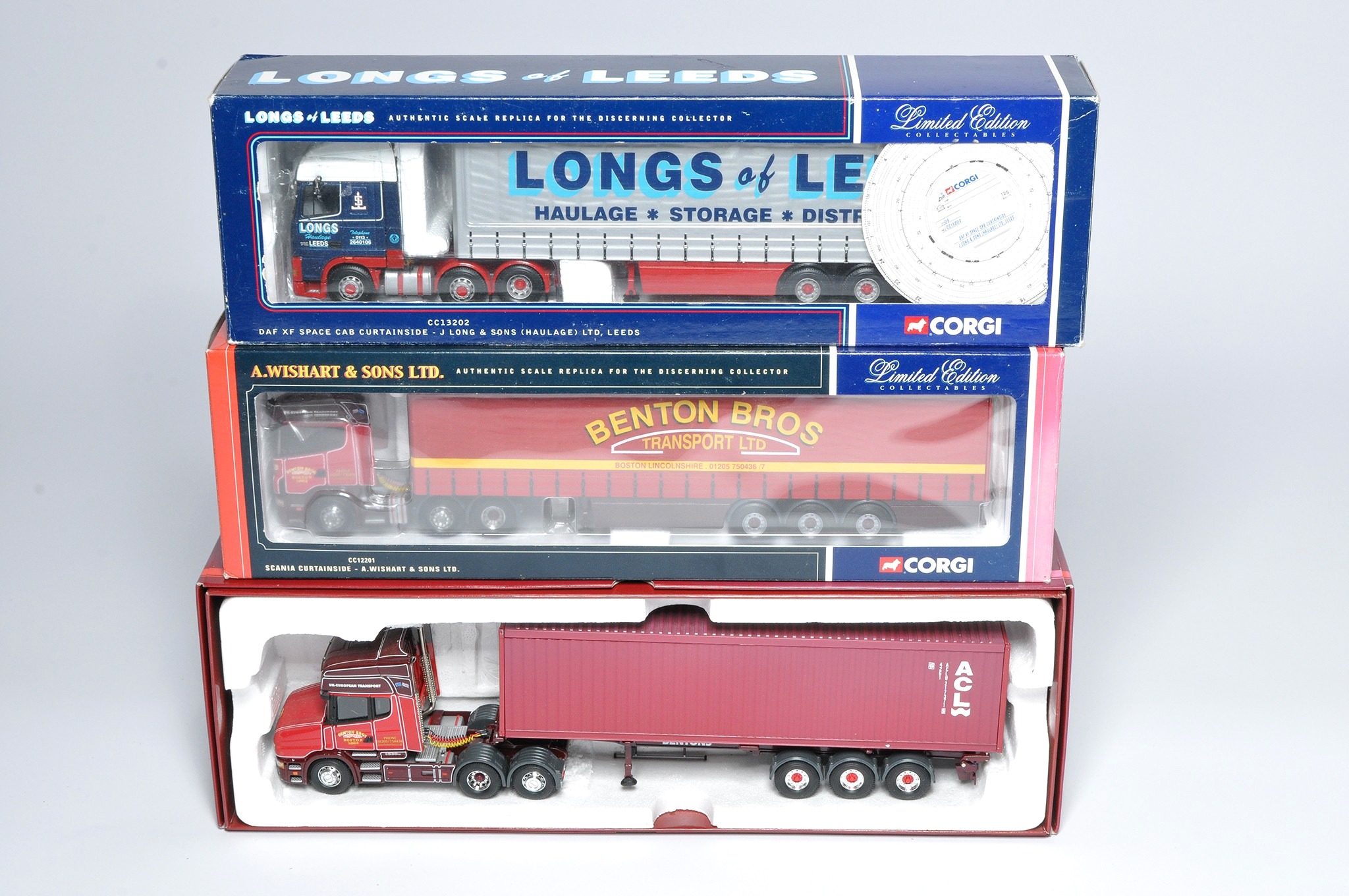 Corgi and others (boxed) 1/50 diecast model truck issues comprising sets in the livery of Benton, Longs and Bentons. Look to be without obvious sign of notable (damage) faults, albeit, not checked for absolute completeness. Note some incorrect boxes and/or code 3 modified.