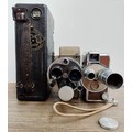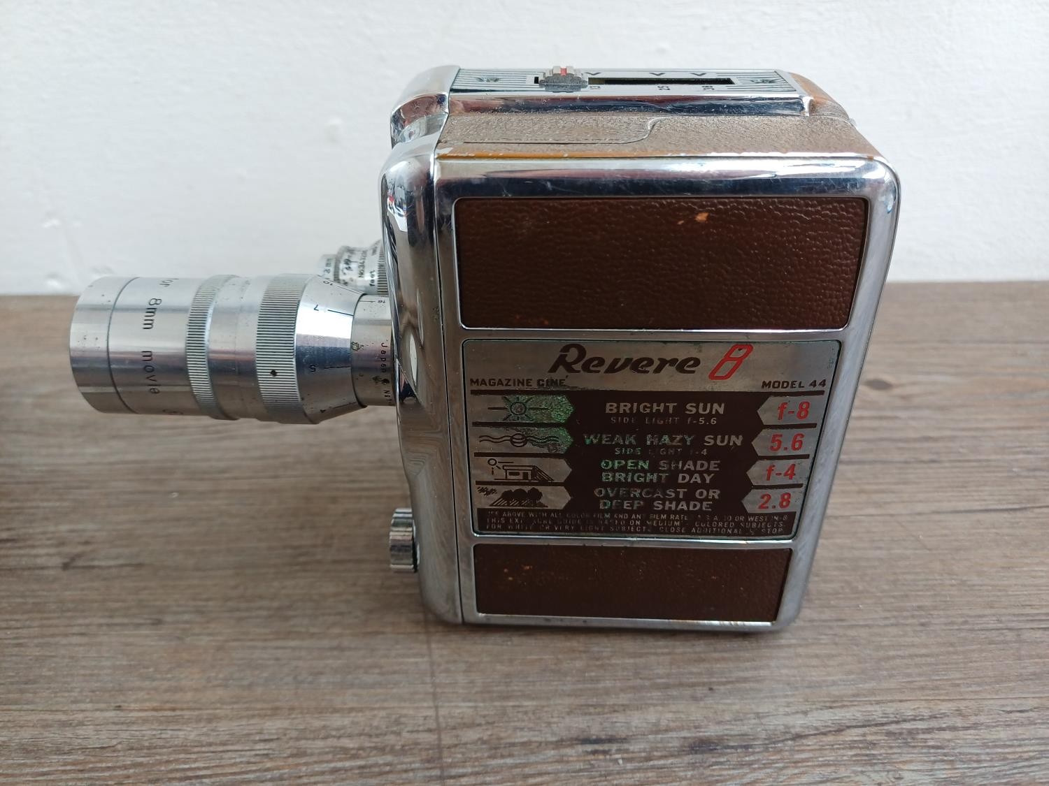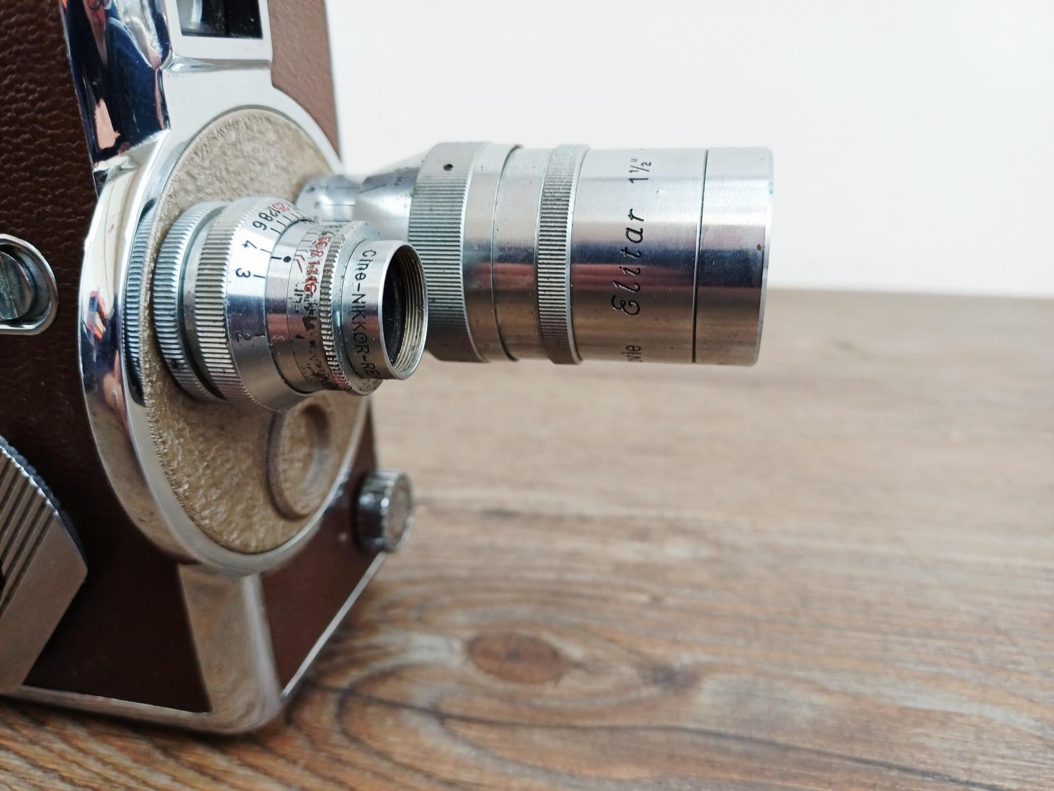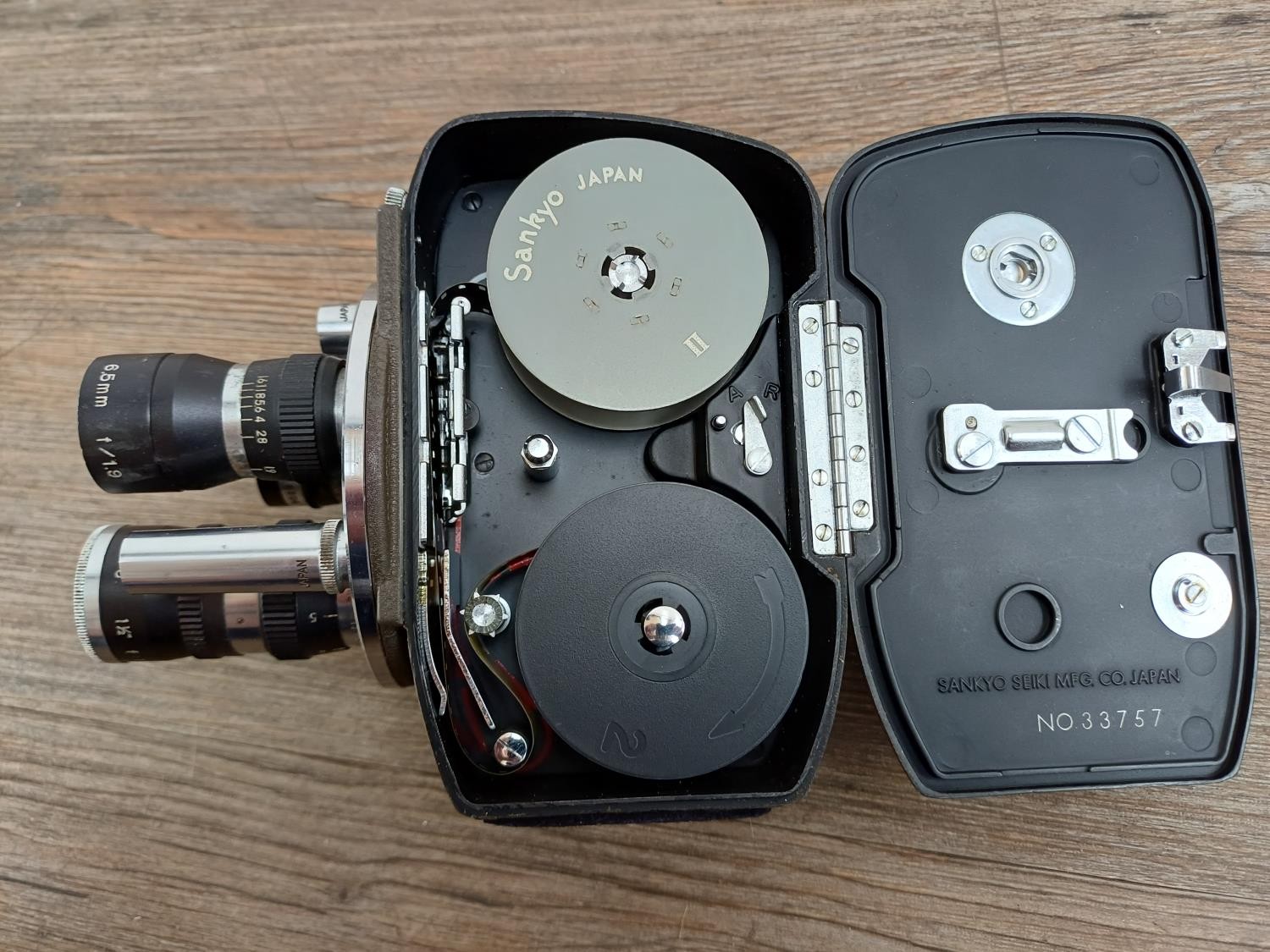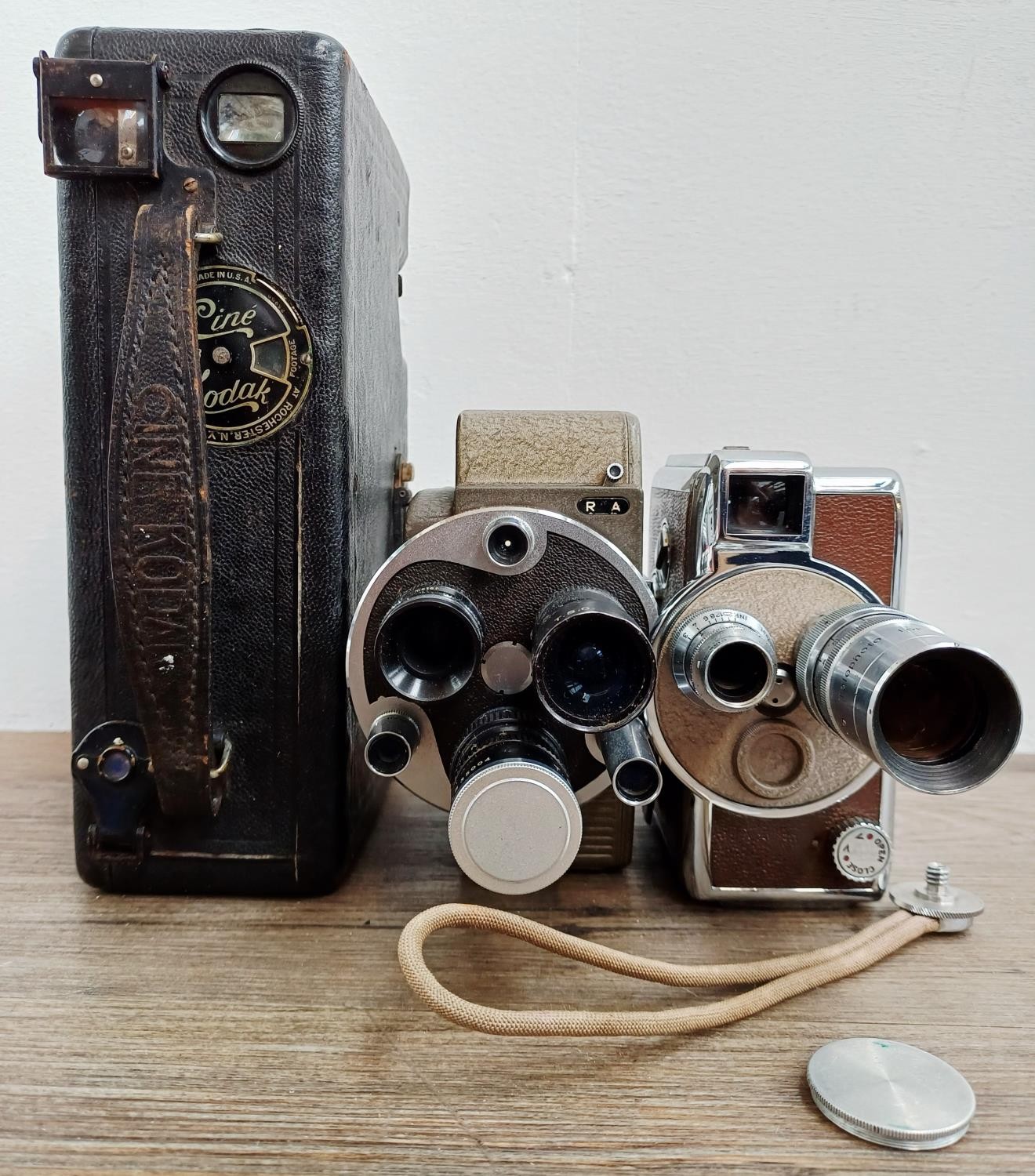 Three cine cameras, one Eastman Kodak Co. Ciné Model B 16mm, one Revere Camera Co. Model 44 Double8 fitted with Elitar and Cine-Nikkor-Revere 1:1.9 lenses and one Sankyo 8-R Double8