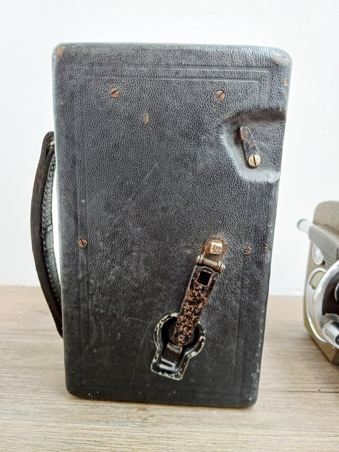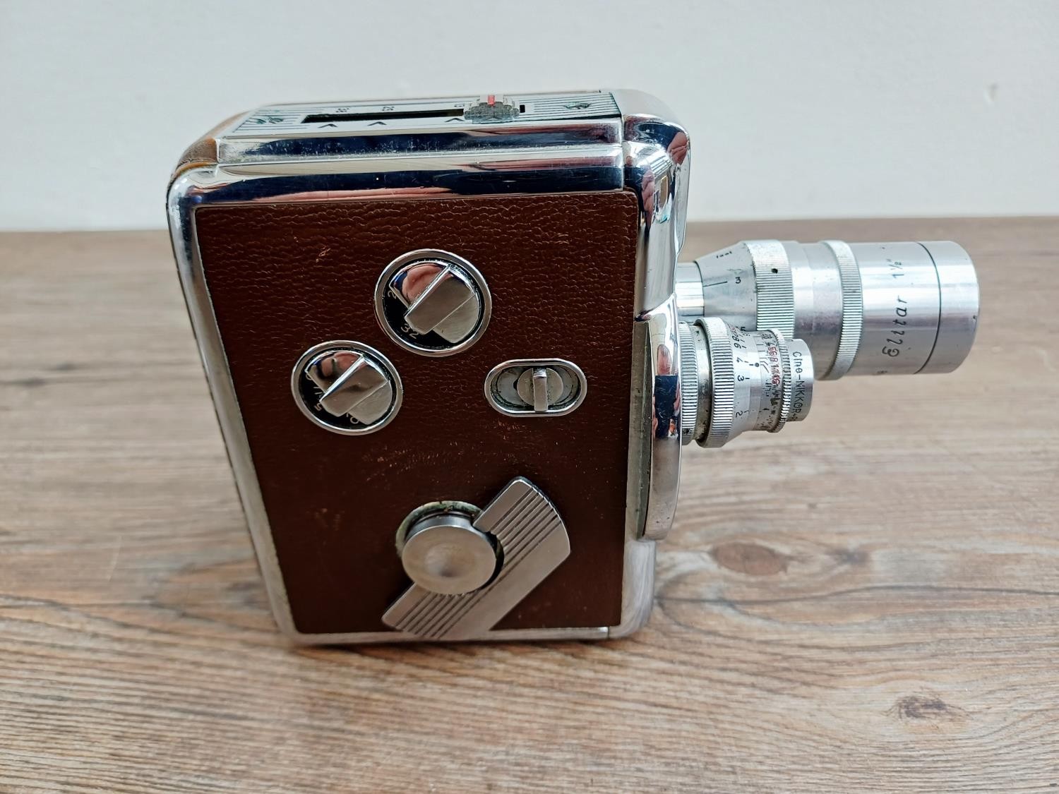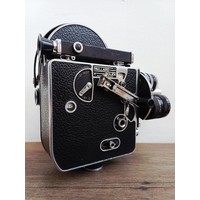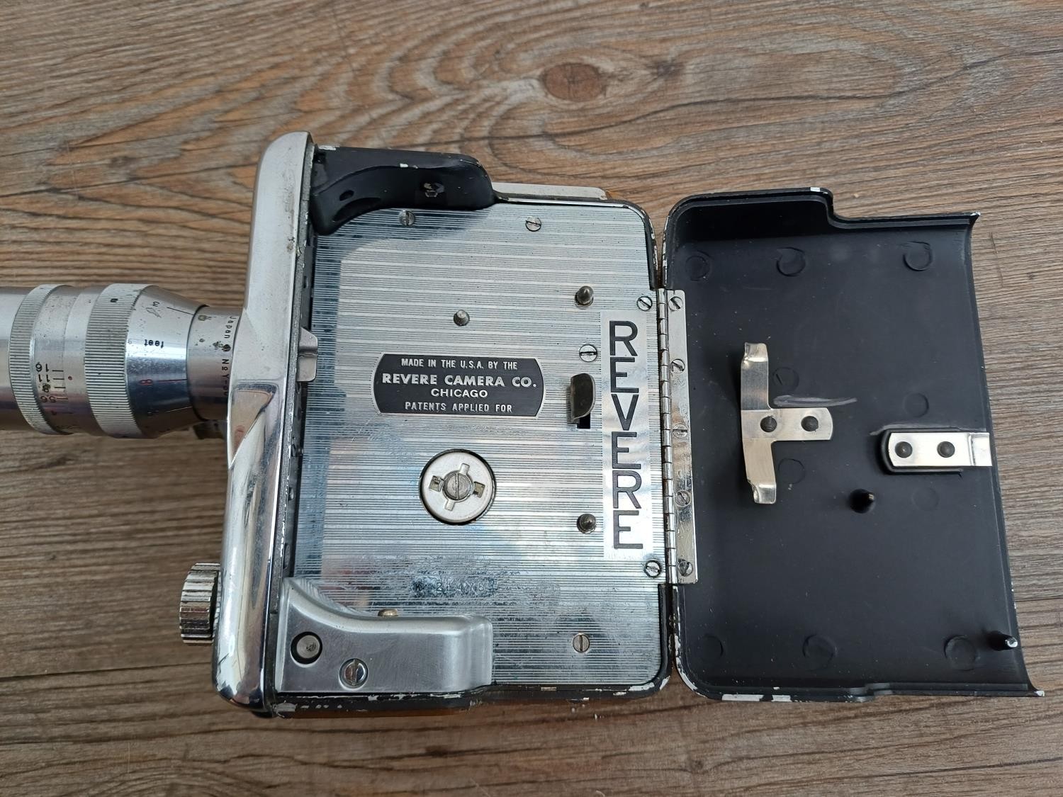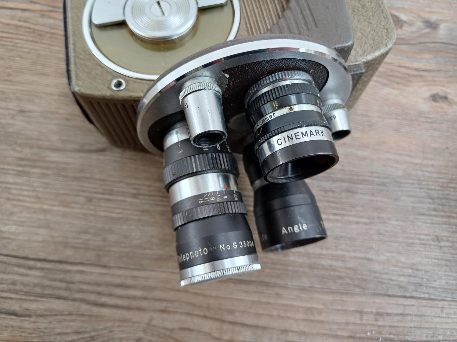 Three cine cameras, one Eastman Kodak Co. Ciné Model B 16mm, one Revere Camera Co. Model 44 Double8 fitted with Elitar and Cine-Nikkor-Revere 1:1.9 lenses and one Sankyo 8-R Double8
