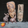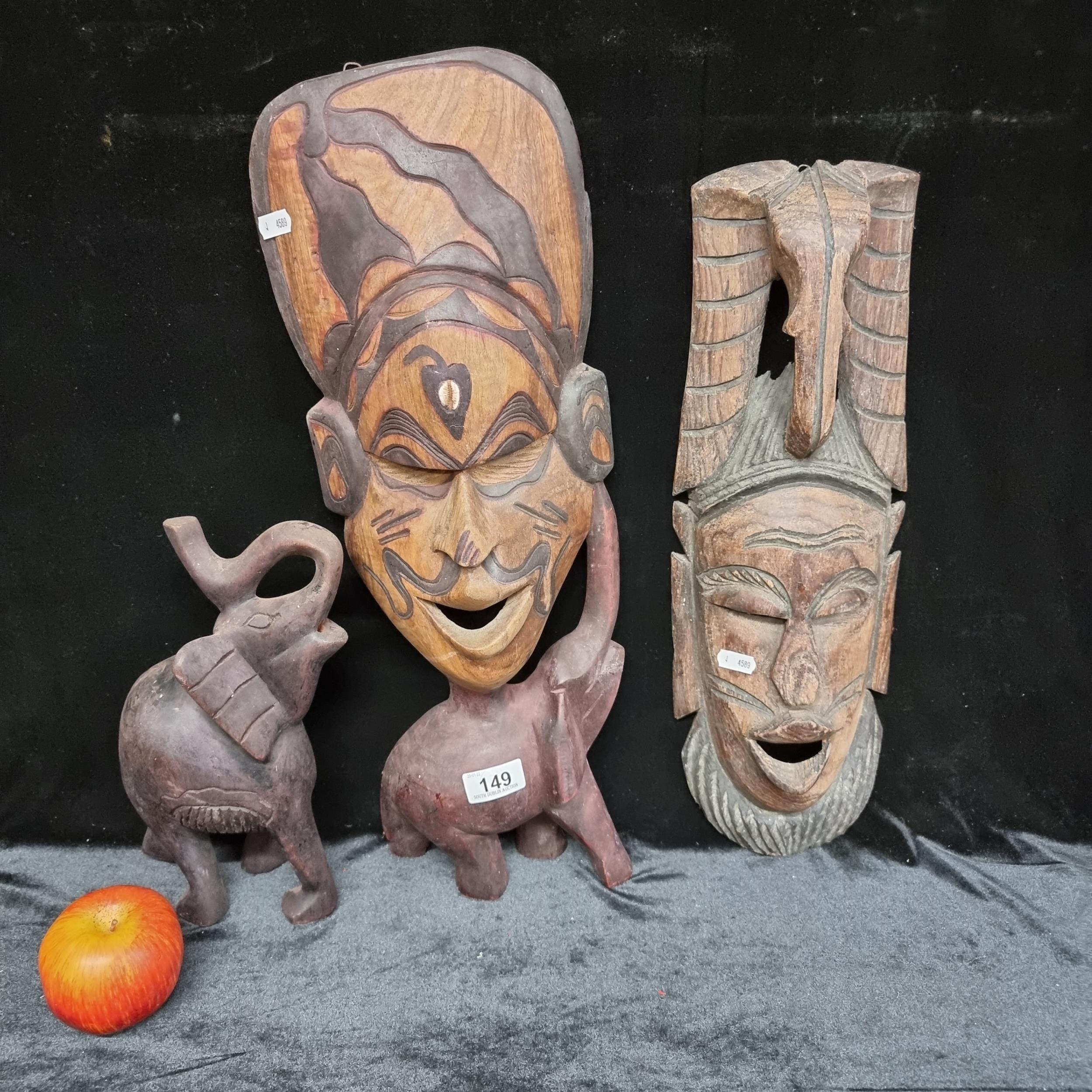 Three traditional hand carved African decorative pieces, including a stylised elephant and two mask pieces, all with expressive details.