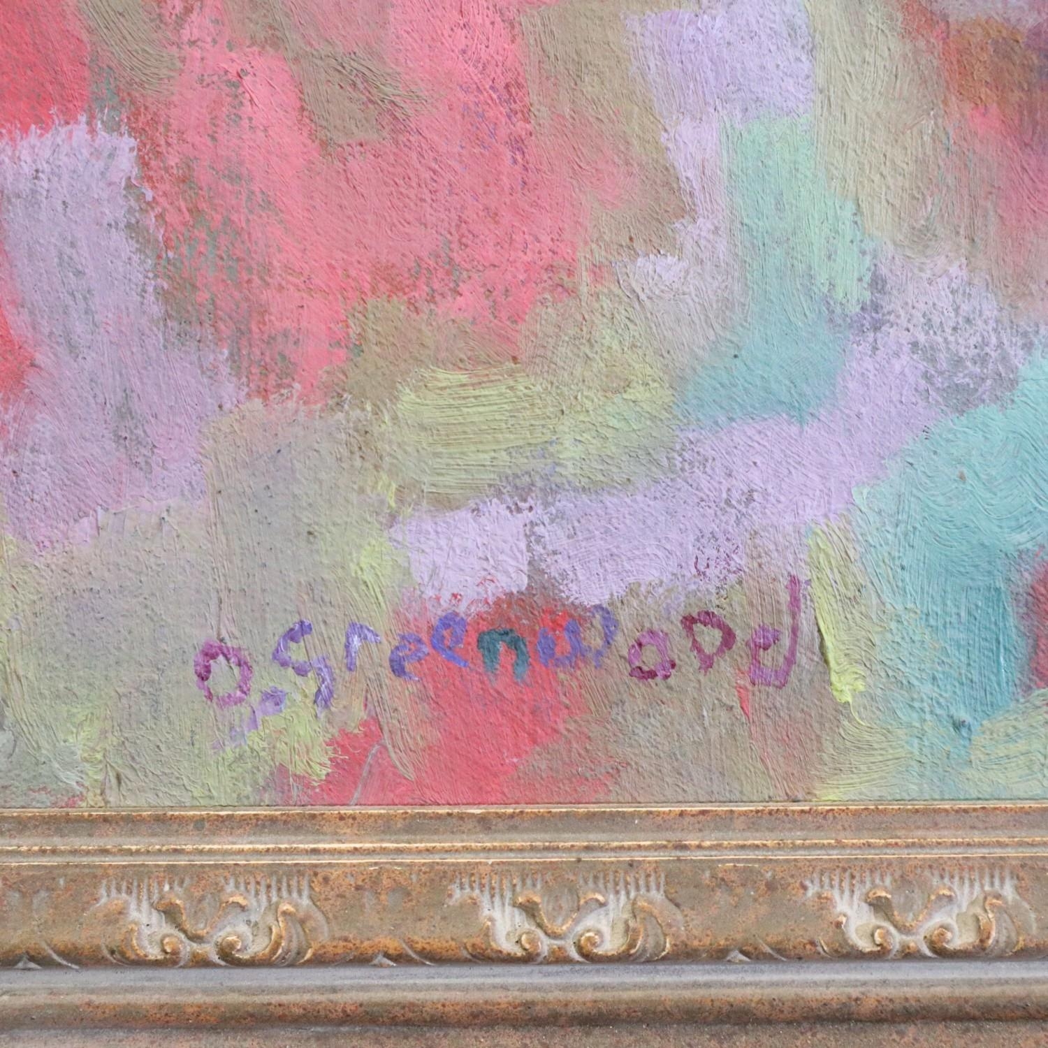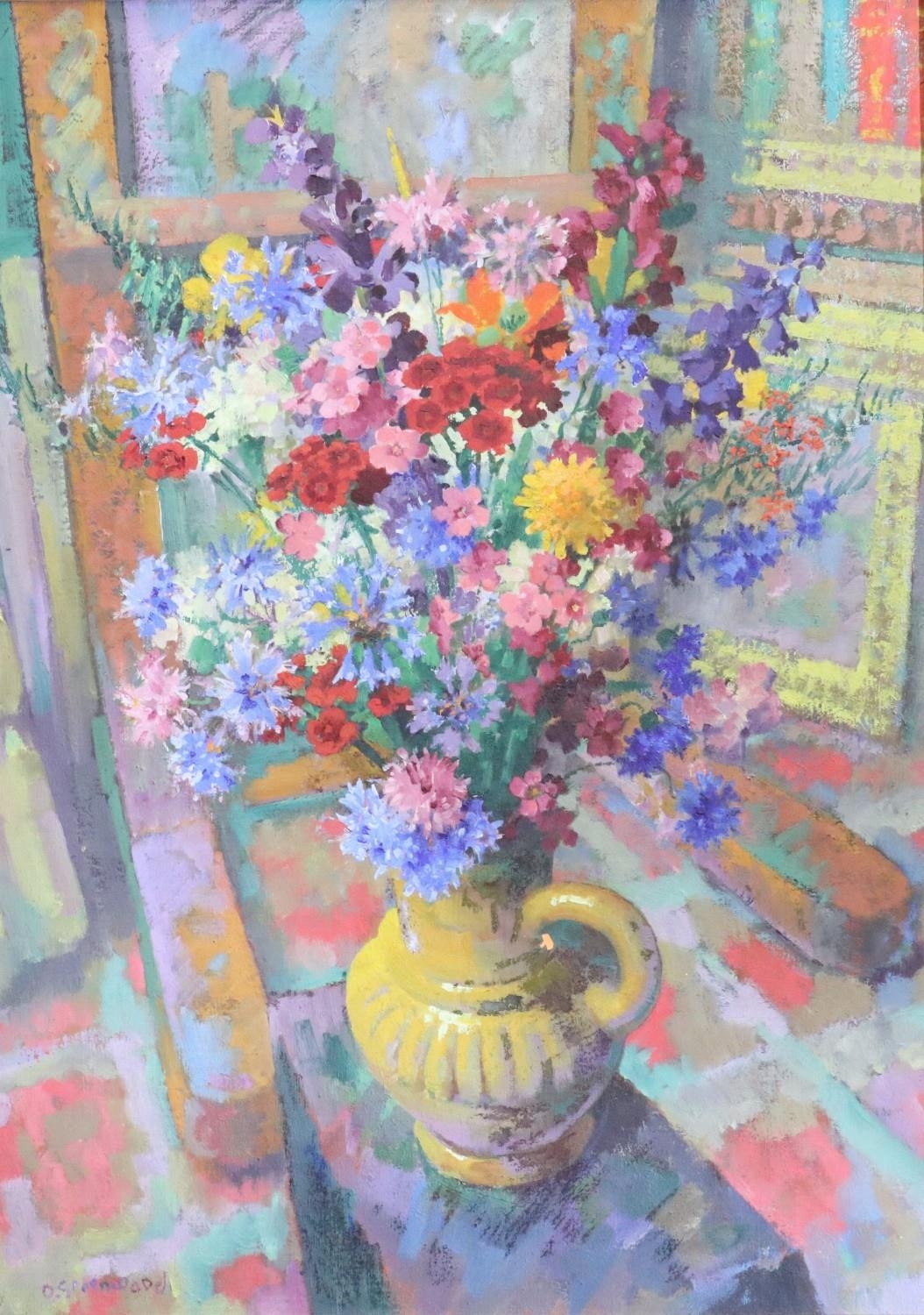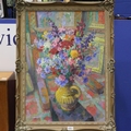 Orlando Greenwood (1892-1989): oil on canvas, still life with flowers in a jug, image 54 x 75cm, overall 66 x 78cm, presented in a gilt wood frame. Not available for in-house P&P