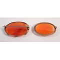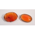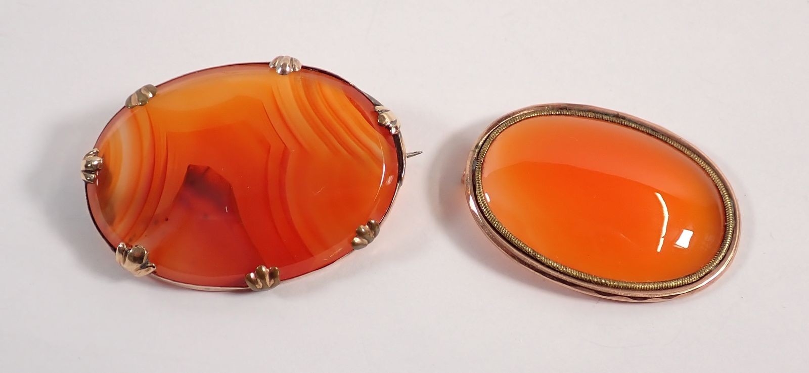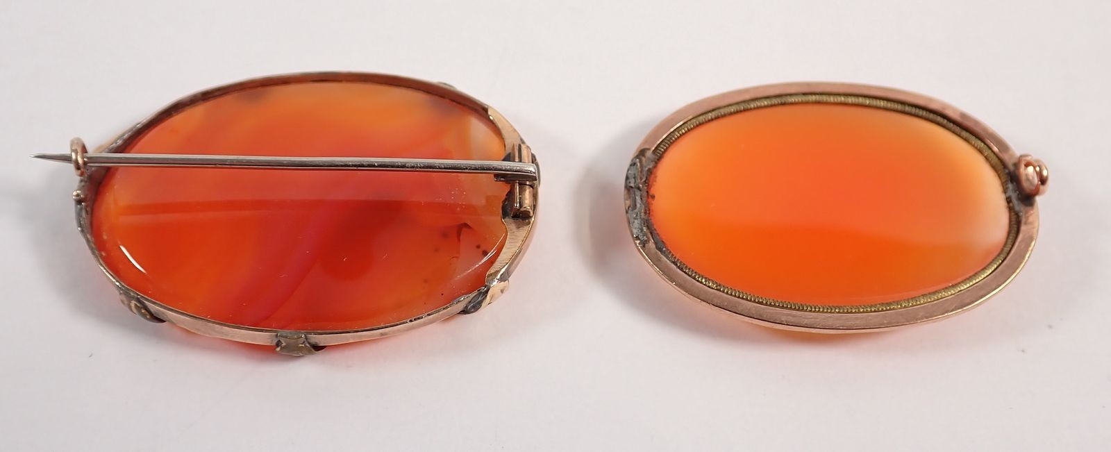 Two orange agate brooches with 9ct gold mounts, one pin a/f, largest 4.2 x 3cm, unmarked but tested