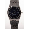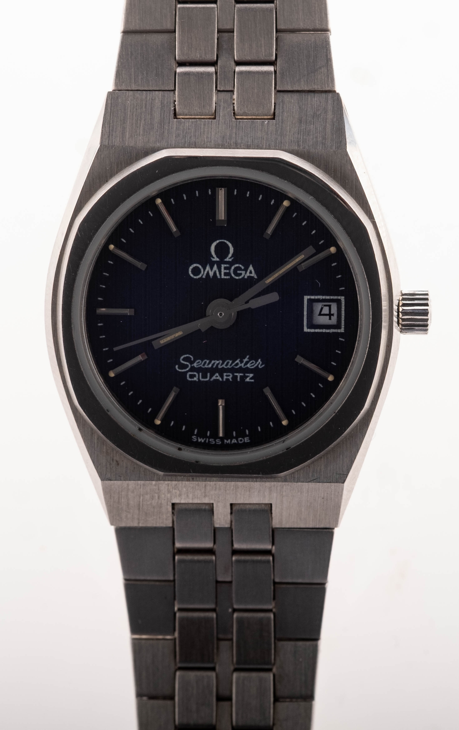 Omega Seamaster, a lady's stainless-steel wristwatch the round grey pin-stripe dial having raised baton numerals, baton hands, a date aperture, sweep seconds hand and signed Omega, Seamaster, Quartz, Swiss Made, the stainless-steel case embossed to the rear with the Seamaster logo and numbered 1380, complete with integral bracelet, reference 6046.395. diameter 24mm.