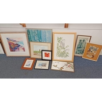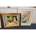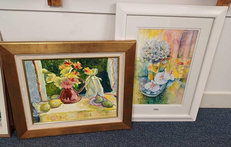 SANDRA PRATT, DAISIES, ORCHIDS AND PEARS, SIGNED WITH LABEL TO REVERSE, FRAMED WATERCOLOUR, 52CM X 35CM AND A STILL LIFE OF FRUIT AND FLOWERS, OIL ON CANVAS, MONOGRAMMED CMM, 38CM X 48CM