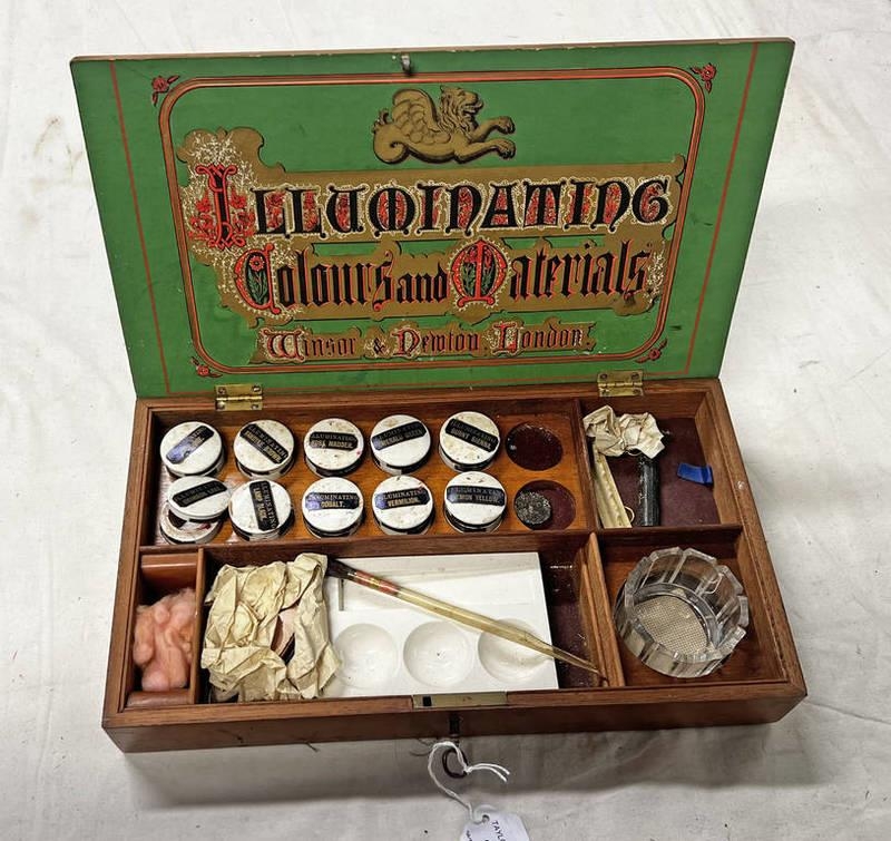 A WINSOR & NEWTON ILLUMINATING COLOURS AND MATERIALS MAHOGANY ARTISTS PAINT BOX WITH CONTENTS