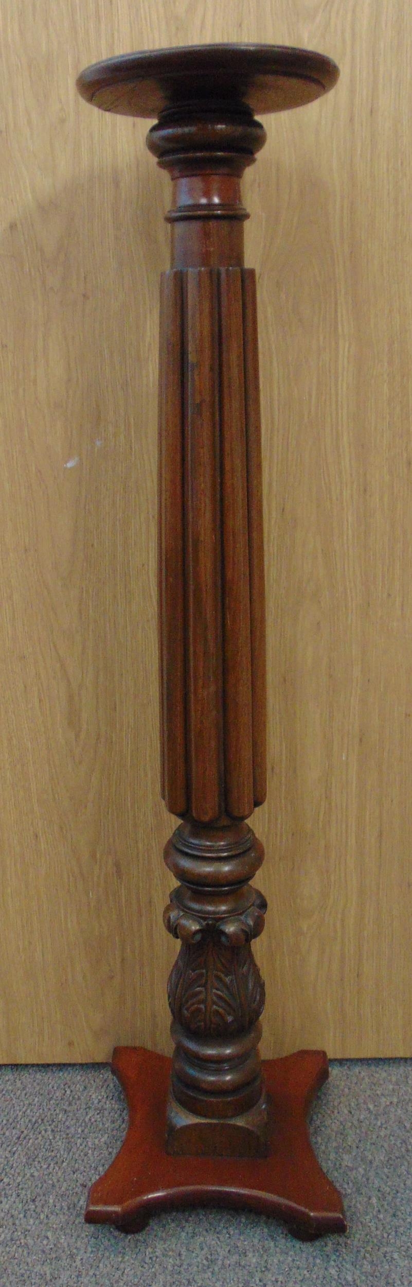 An early 20th century mahogany pedestal plant stand with carved decoration on shaped quatrefoil base, 126.5cm (h)